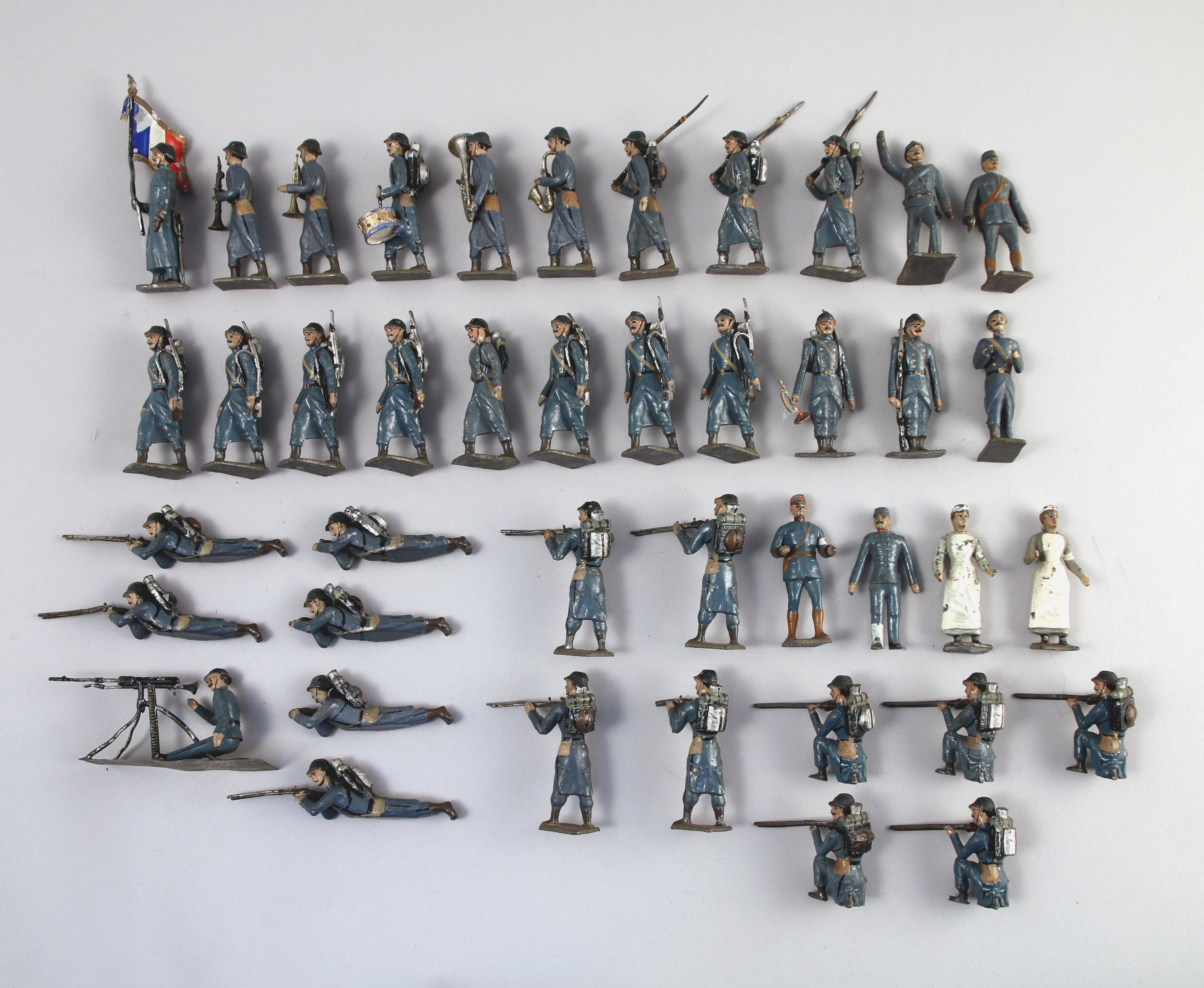 SOLDATS DE LA GRANDE GUERRE en plomb peint polychrome, 41 PIÈCES: 8 FANTASSINS au pas; 4 FANTASSINS épaulant debout; 5 FANTASSINS épaulant un genoux à terre; 6 FANTASSINS épaulant allongés; 3 FANTASSINS le fusil sur l'épaule; FANTASSIN au garde-à-vous; PORTE-DRAPEAU; 2 FANTASSINS dont un avec CLAIRON; 2 OFFICIERS; OFFICIER du service de santé; 2 INFIRMIÈRES; SOLDAT avec mitrailleuse; FANFARE: trompette, tuba, tambour, saxophone et clarinette.