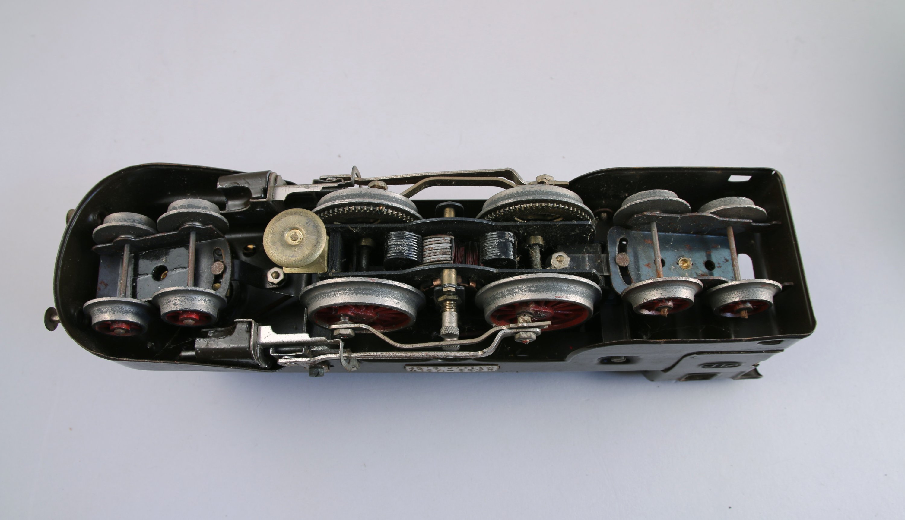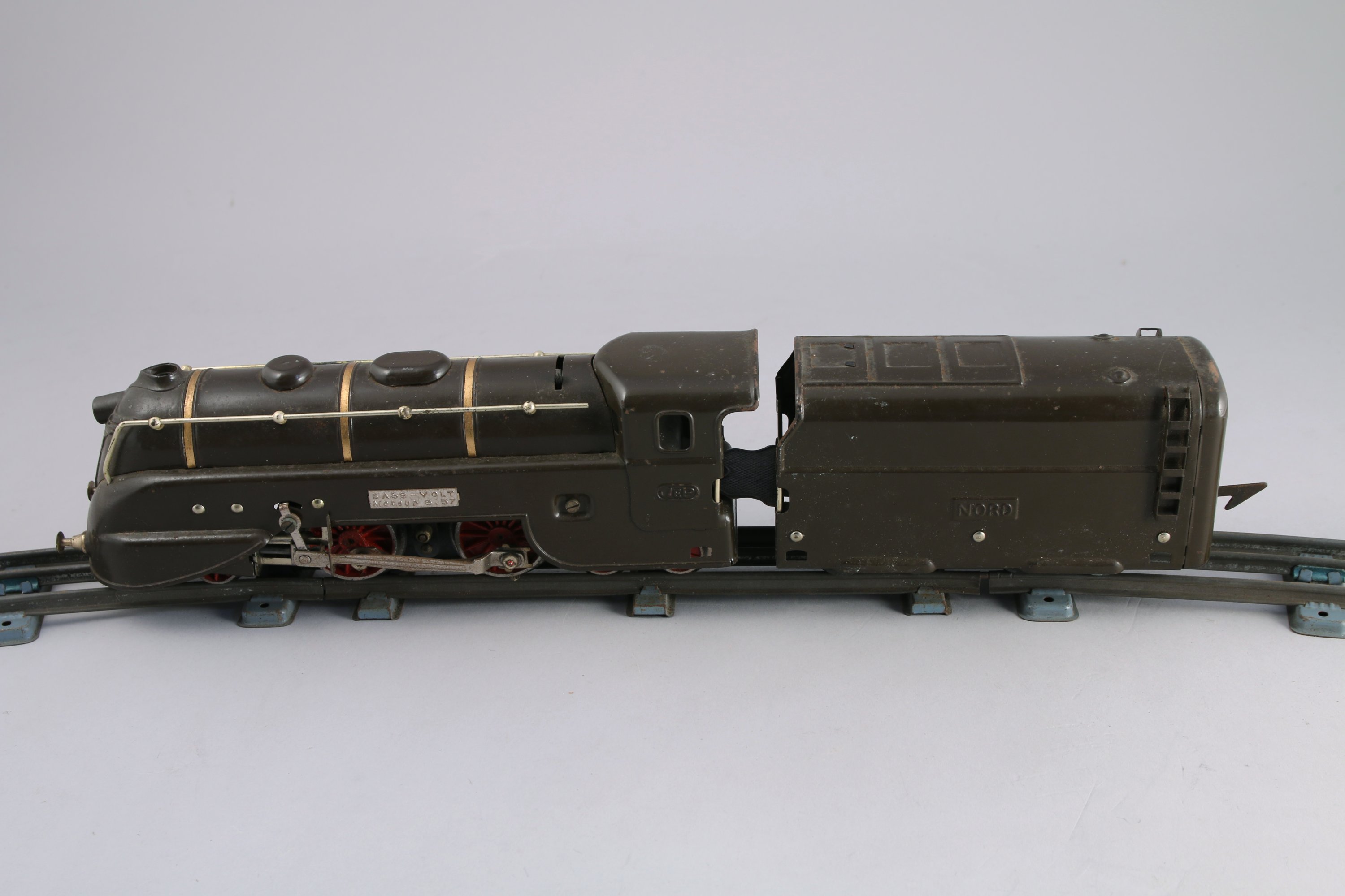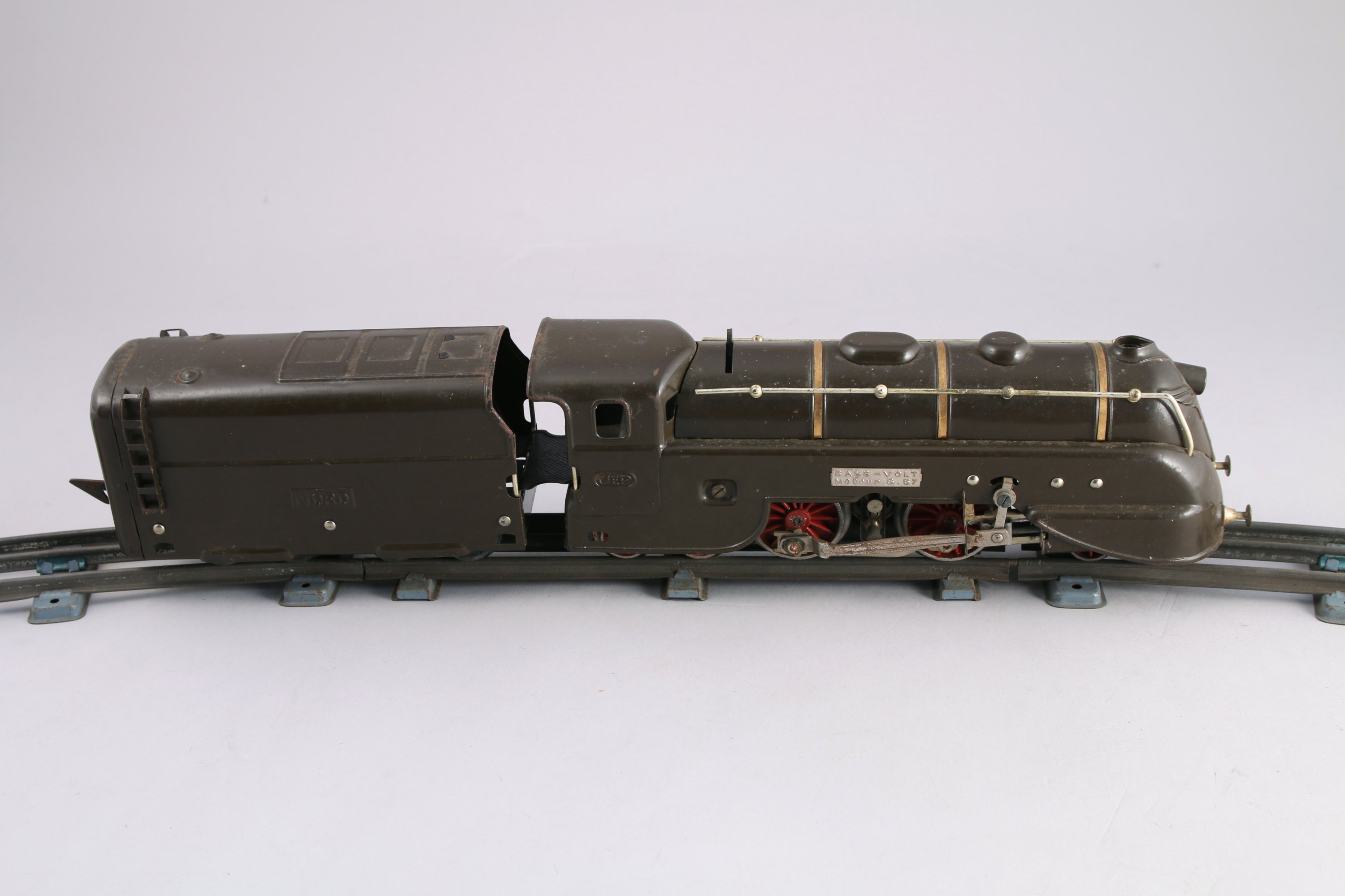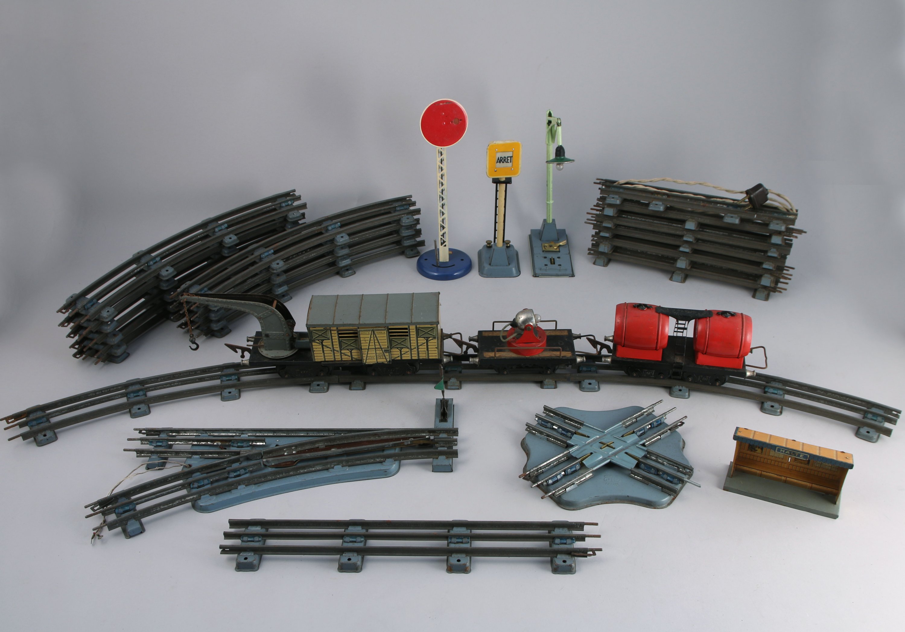 JEP. CIRCUIT de TRAIN ELECTRIQUE en tôle lithographiée, comprenant notamment: gare, passage à niveaux, abris, locomotive, tender, wagon citerne, wagon pullman