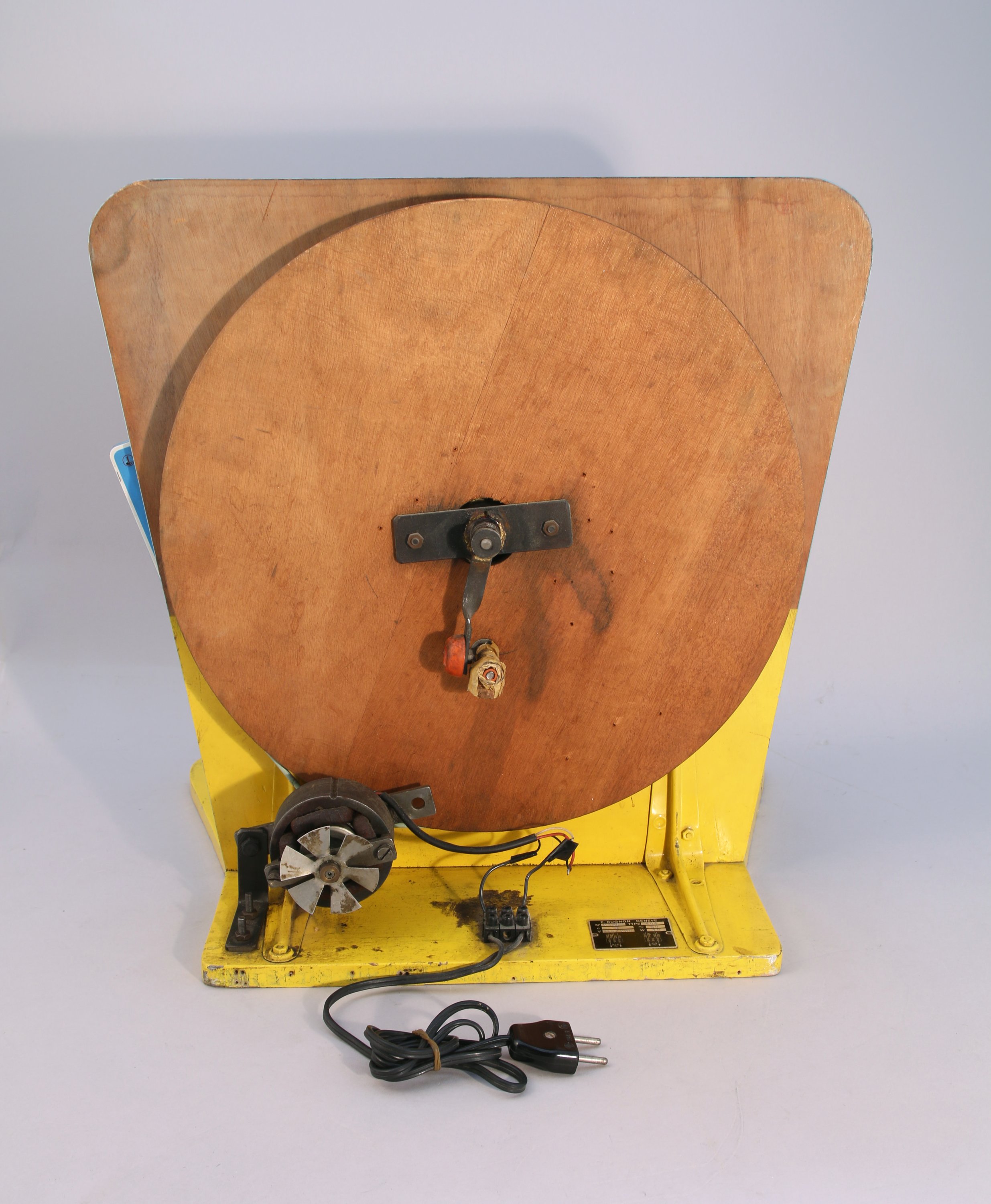 CARAN D'ACHE. SINGE ACROBATE PUBLICITAIRE. Un peluche articulée tenant une boite de 12 crayons de couleurs effectuant des cabrioles à la renverse sur un fond bleu azur décoré d'un palmier et d'une autre boite de ces crayons d'excellence. Un moteur élecrique en état de fonctionnement, 110/220 volts, par Bugnon à Genève est dissimiulé à l'arrière.