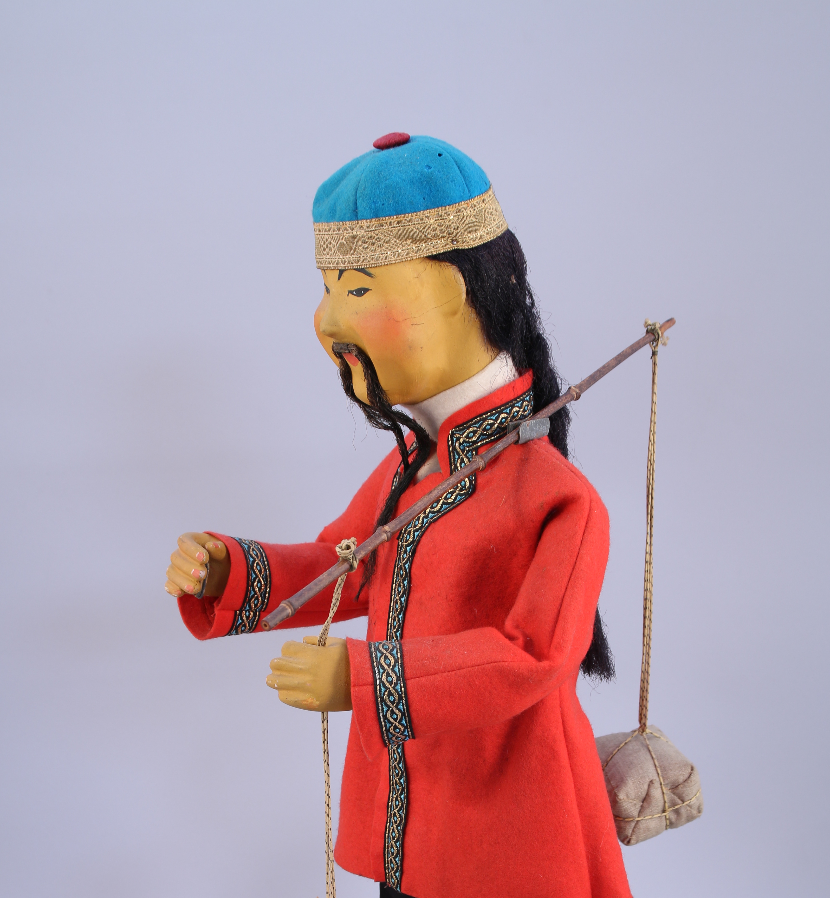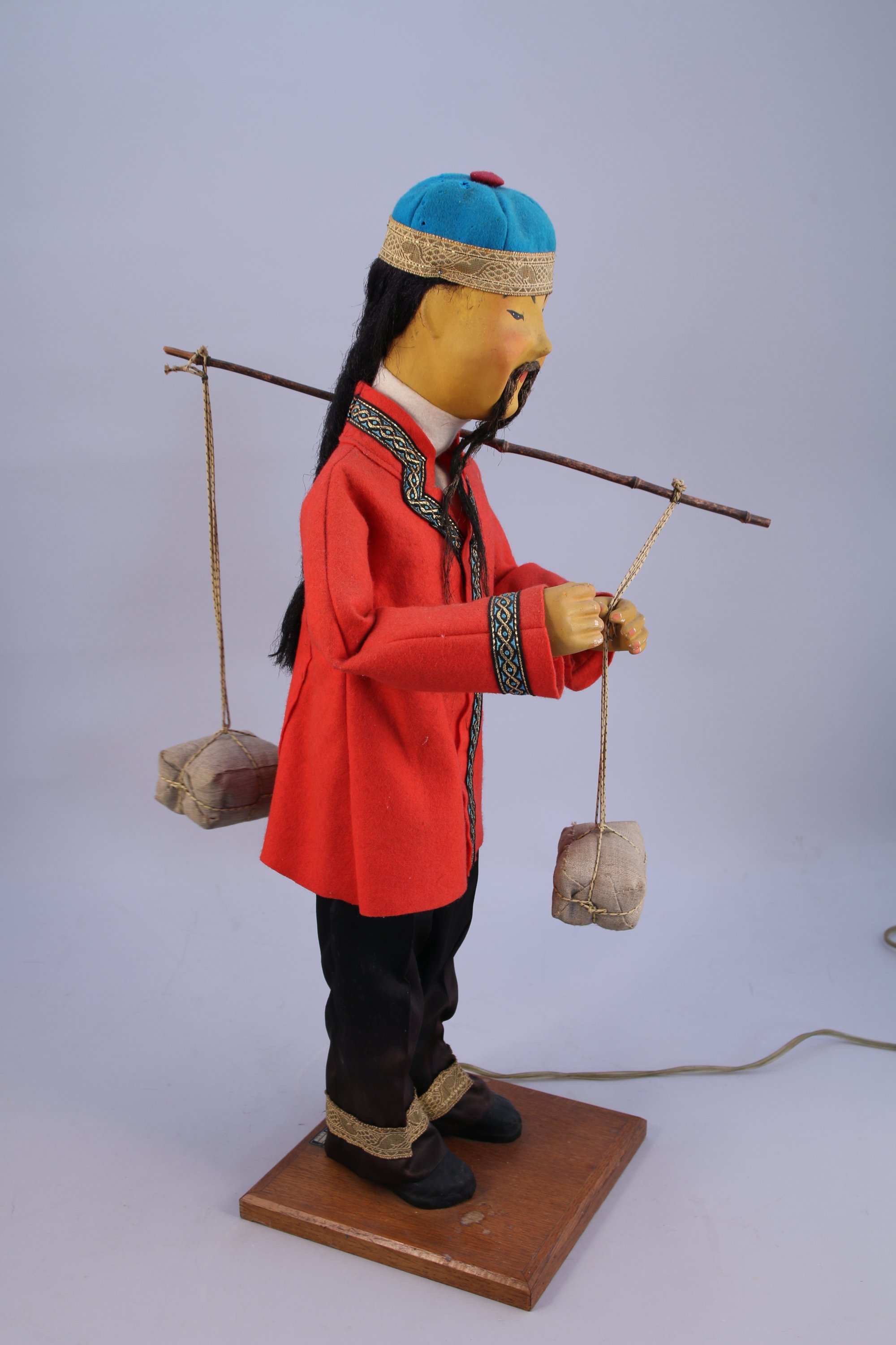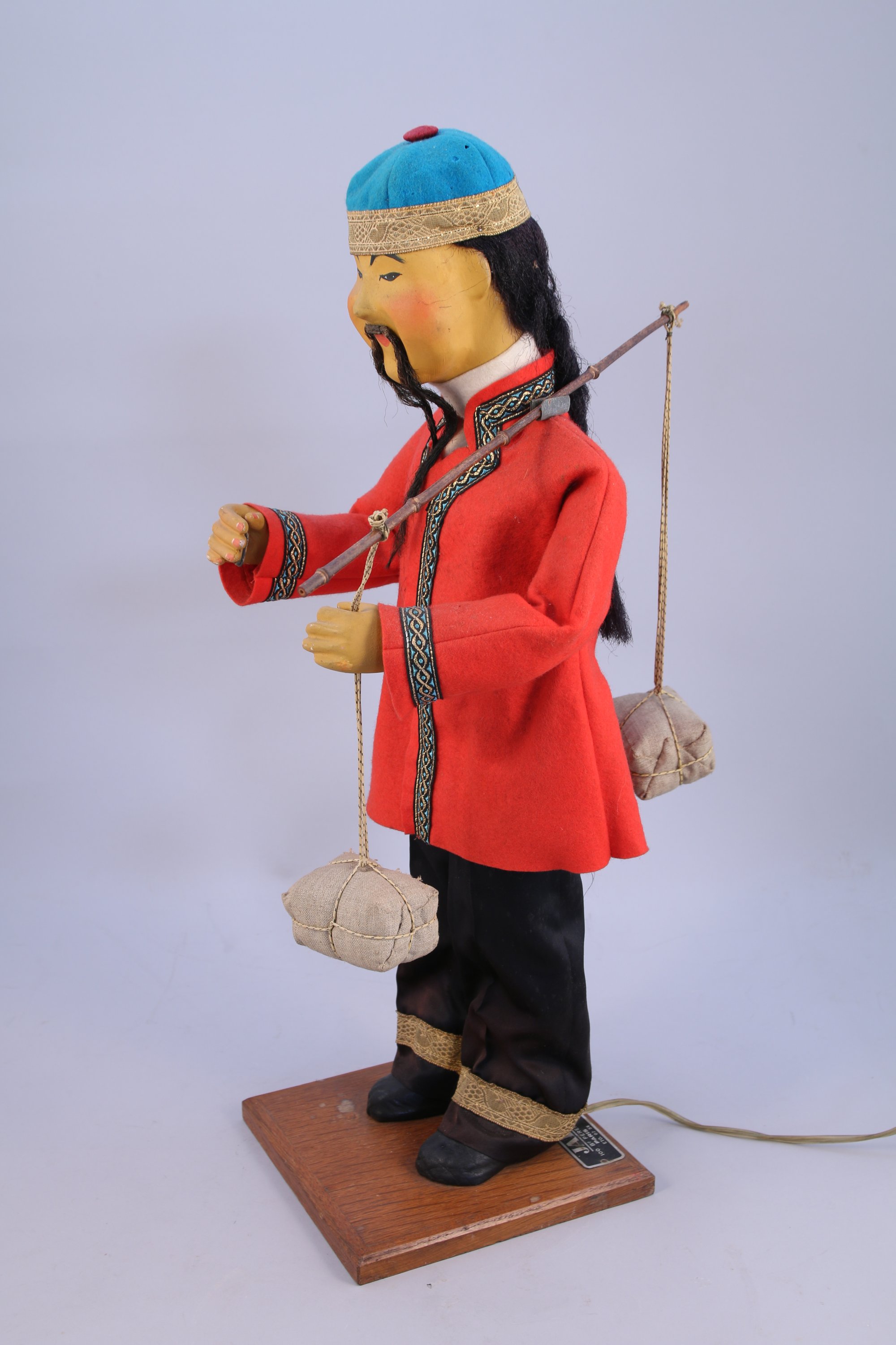 JAF - AUTOMATE électrique au CHINOIS à la palanche. Mouvements des bras et de la tête. Vêtu d'habits traditionnels en feutre (quelques accidents). Repose sur une base de forme carrée en chêne présentant les plaques JAF. Fonctionne, 220V.
