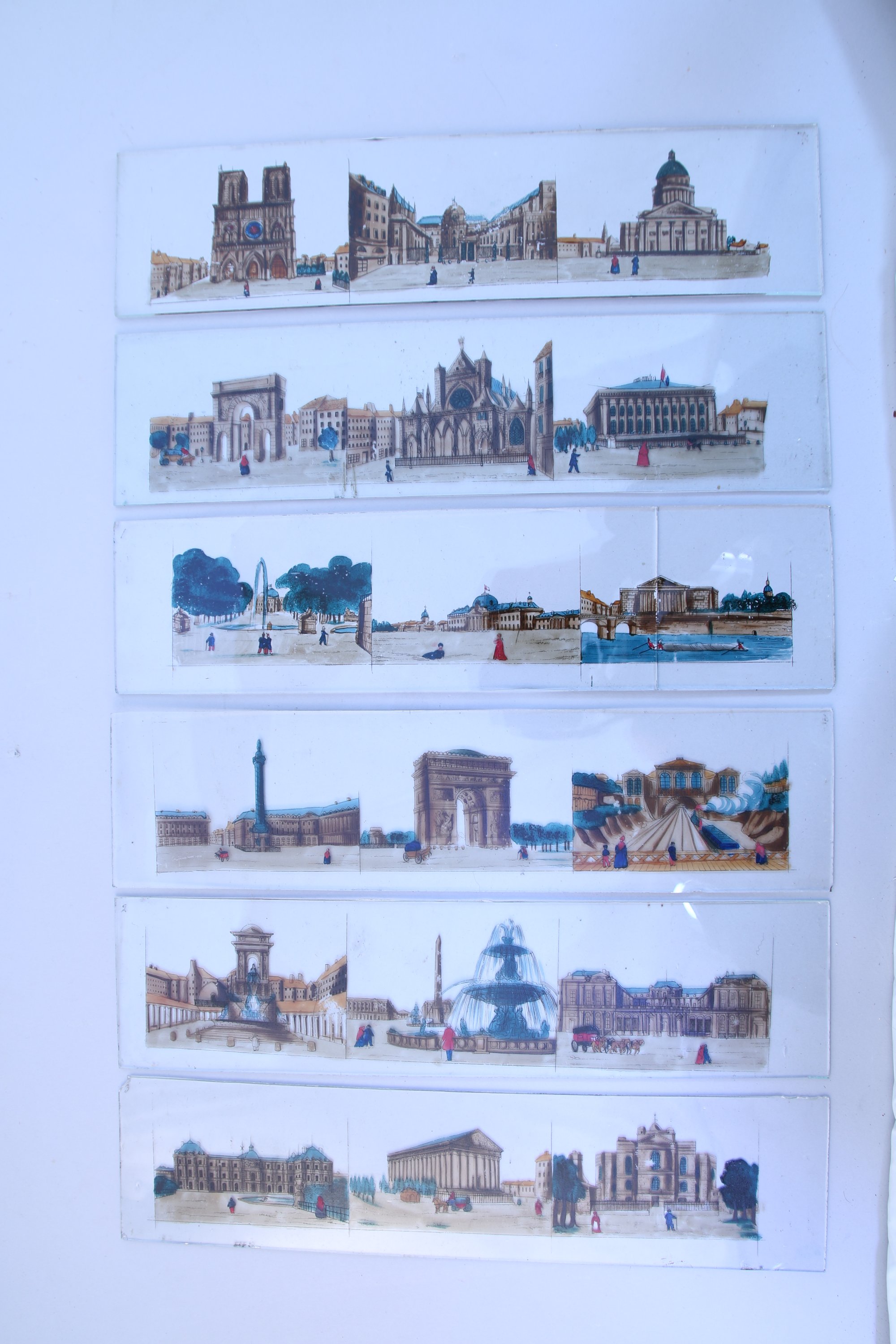 21 PLAQUES de LANTERNE MAGIQUE en verre de forme rectangulaire peinte de contes de féé dont "La Belle au bois dormant" et de vues des monuments de Paris.