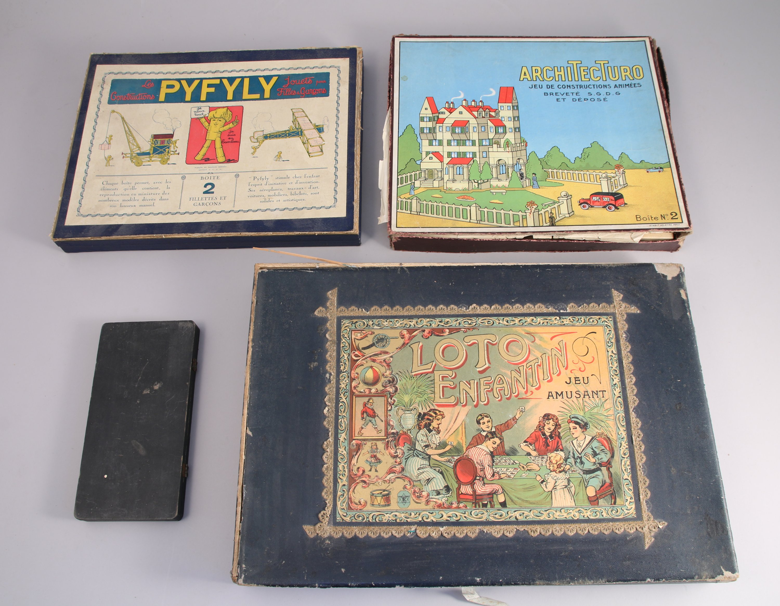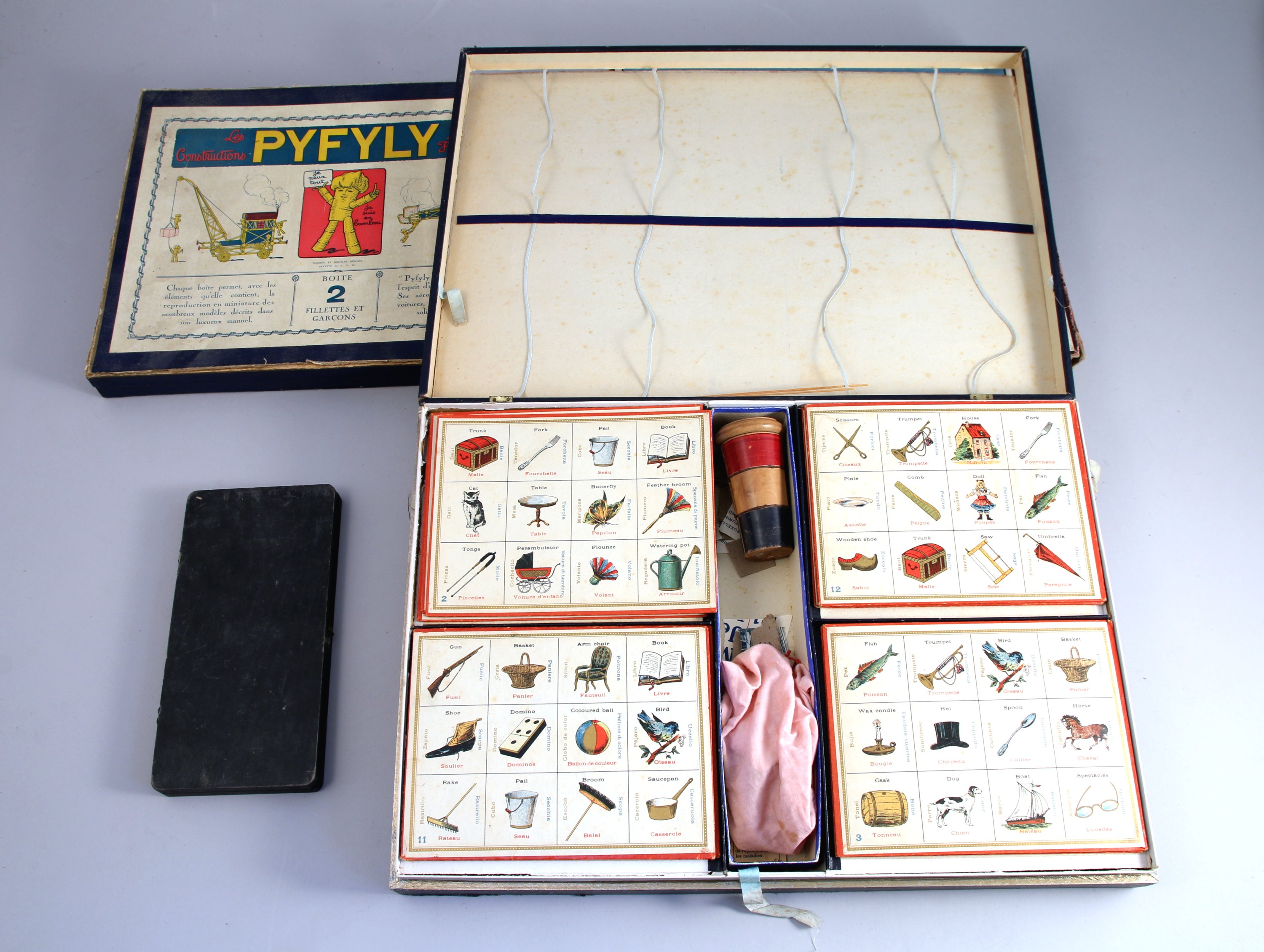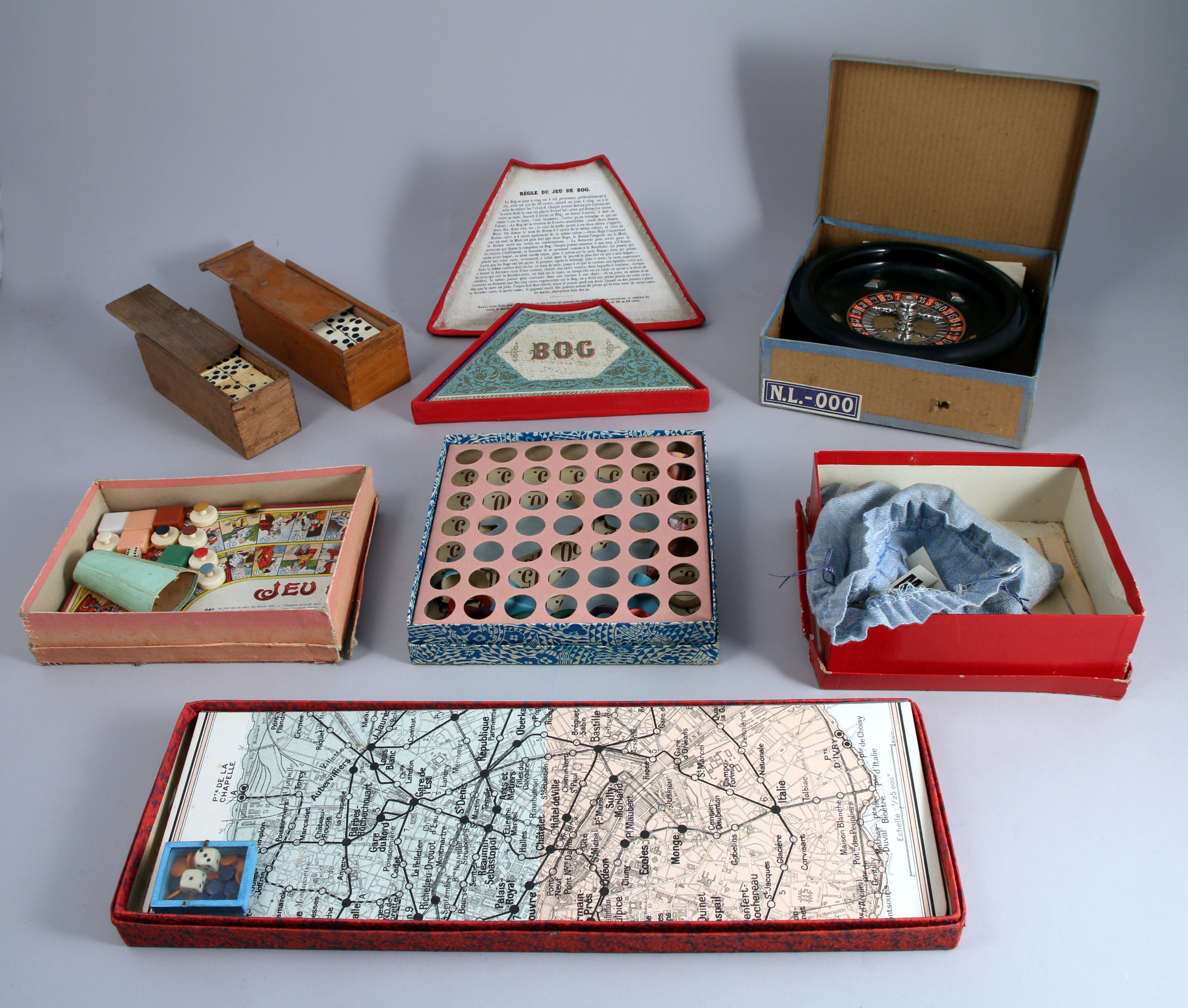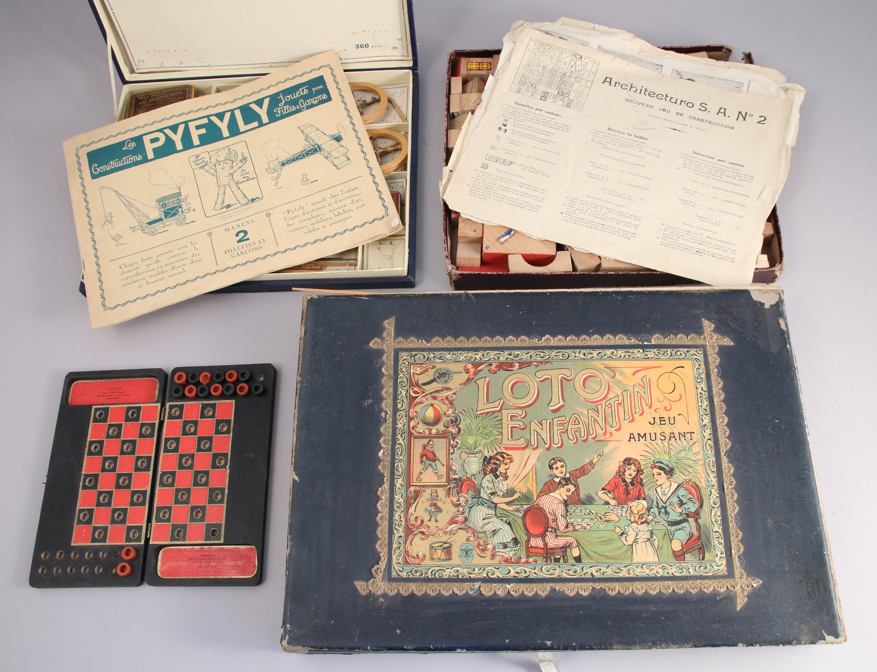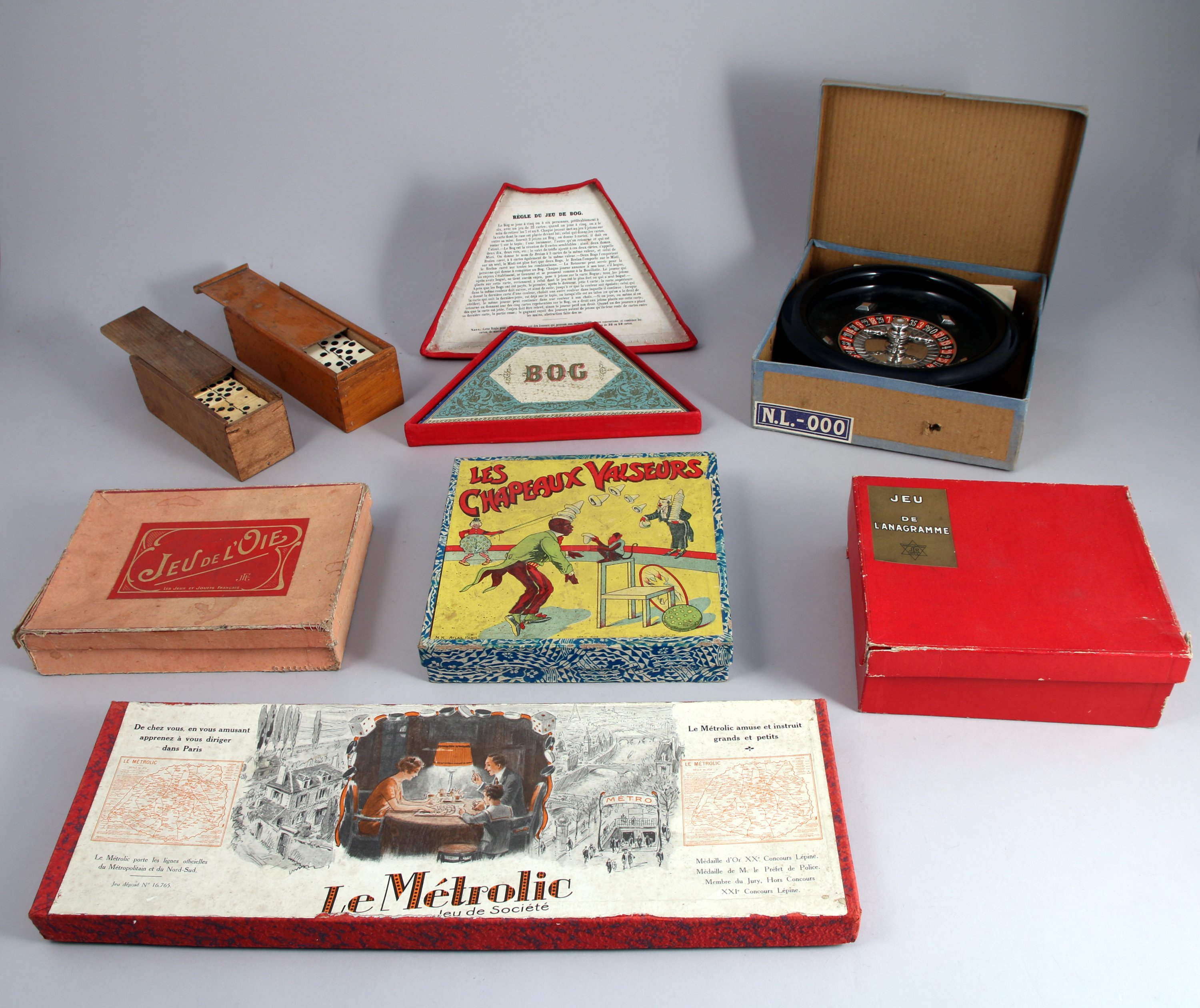 Réunion de JEUX DE SOCIÉTÉ: Jeu des Cascades; Pyfyly; Loto Enfantin; Le Métrolic; Architecturo; Roulette; Jeu de l'Anagramme; Jeu de l'Oie et Jeu de Bog.