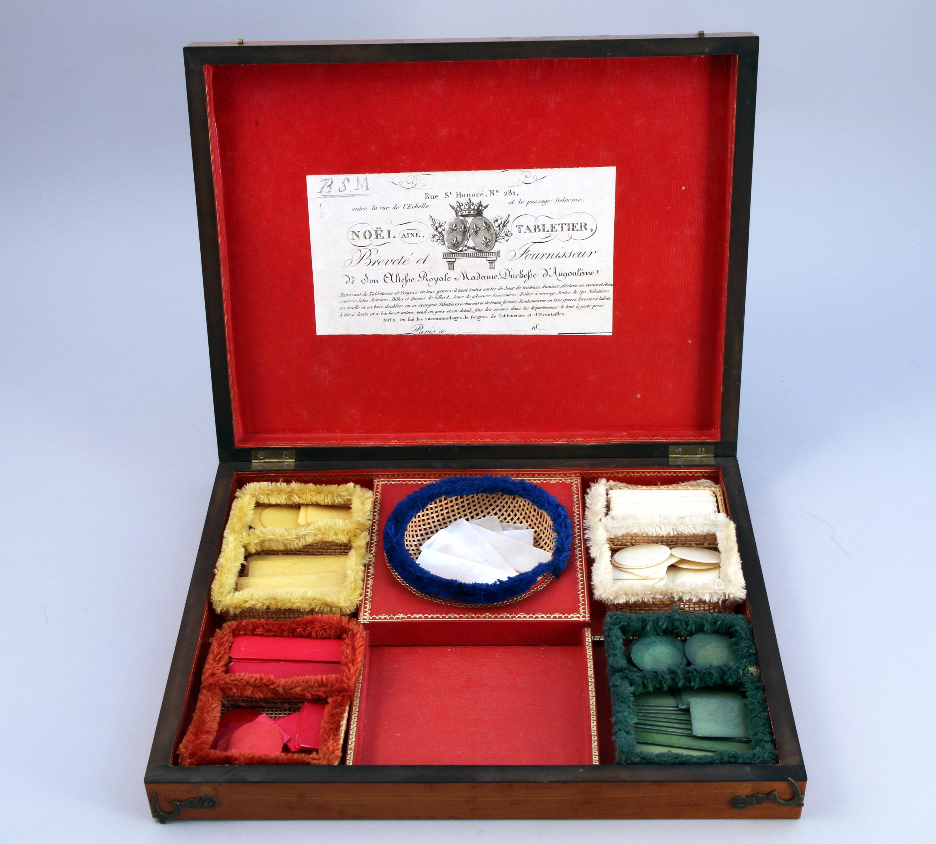 COFFRET de forme rectangulaire en placage de bois de citron. Encadrements d'ébène et filets de laiton. Le centre du couvercle incrusté d'un losange de laiton. Intérieur compartimenté gaîné d'un papier à l'imitation du maroquin rouge à frises dorées contenant 5 paniers contenant des plaquettes de nacre et d'os, certaines teintées jaune, rouge ou vert. Pour le jeu de Nain Jaune?