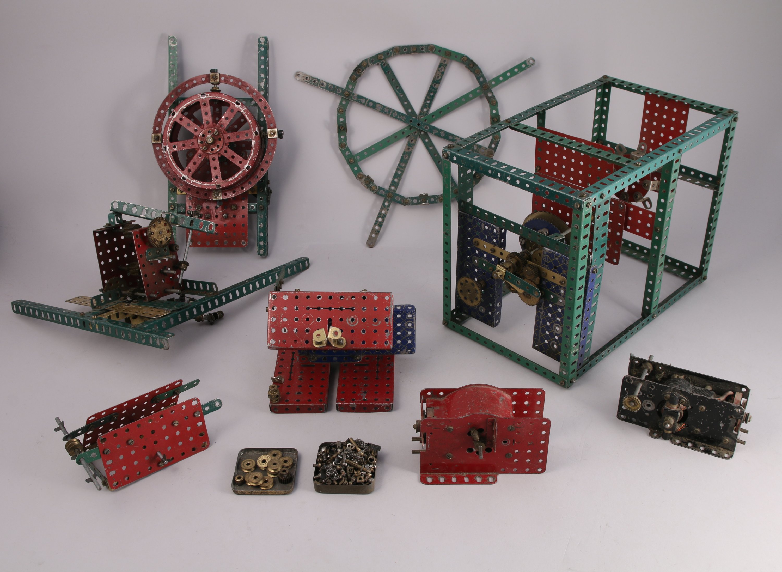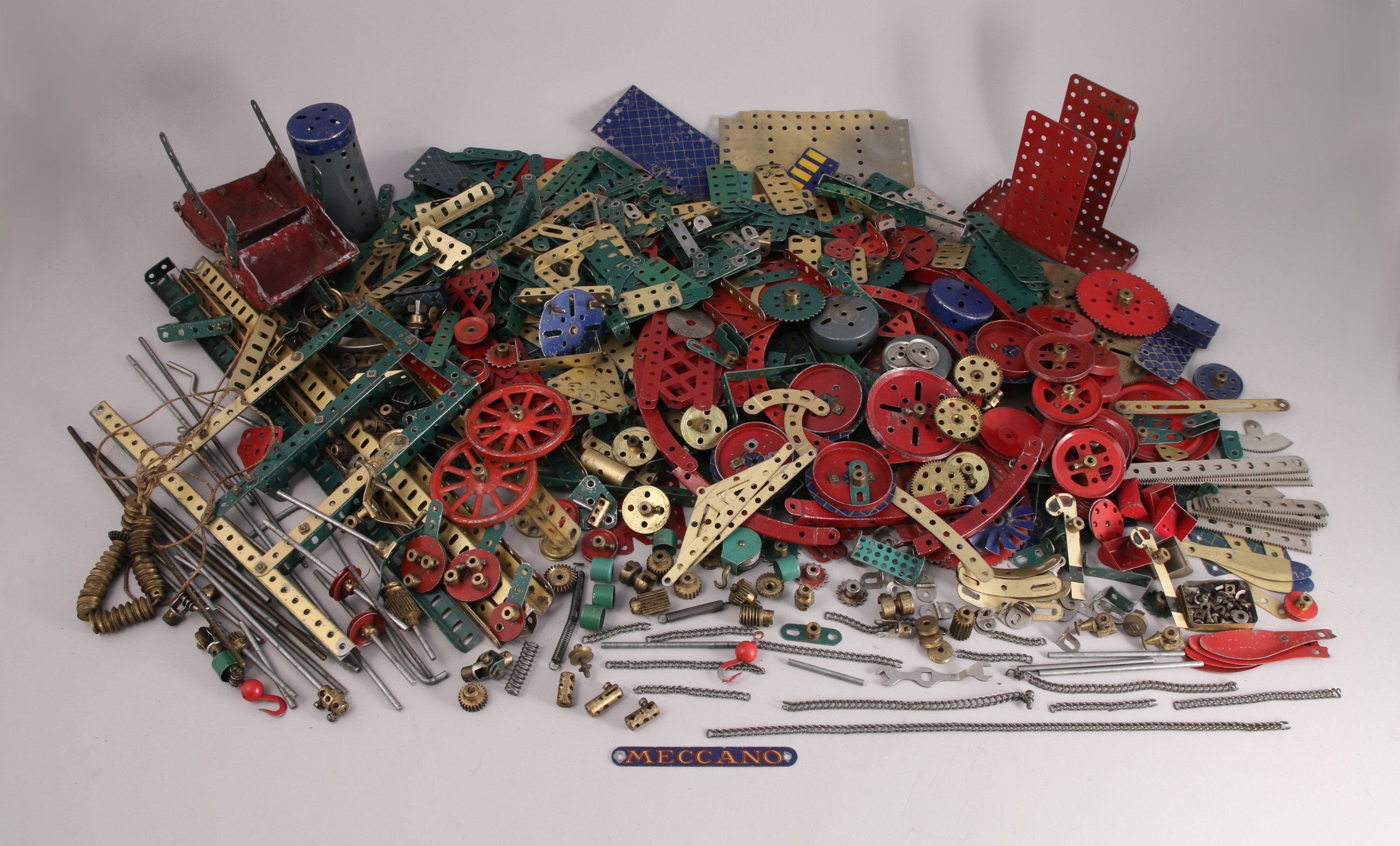 MECCANO. Ensemble de PIÈCES en métal laqué vert, rouge, or et bleu. Mécanisme à rouages.