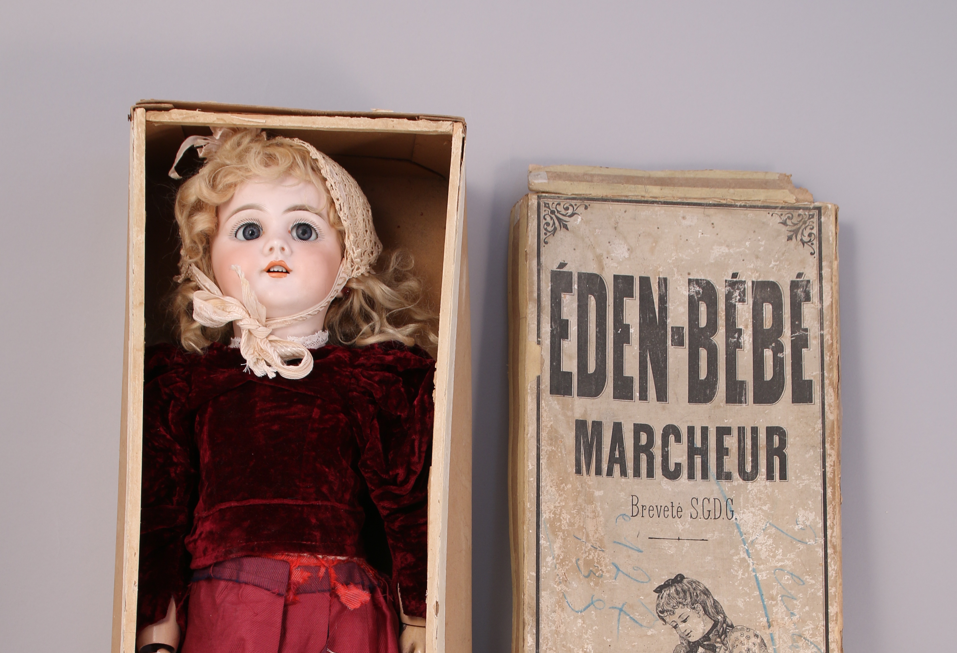 ÉDEN BÉBÉ MARCHEUR. Tête en porcelaine moulée marquée "DER" avec ses yeux bleus dormeurs, sa bouche ouverte, ses oreilles percées et sa perruque blonde. Corps articulé. Avec un trousseau de vêtements. Dans sa boite d'origine.