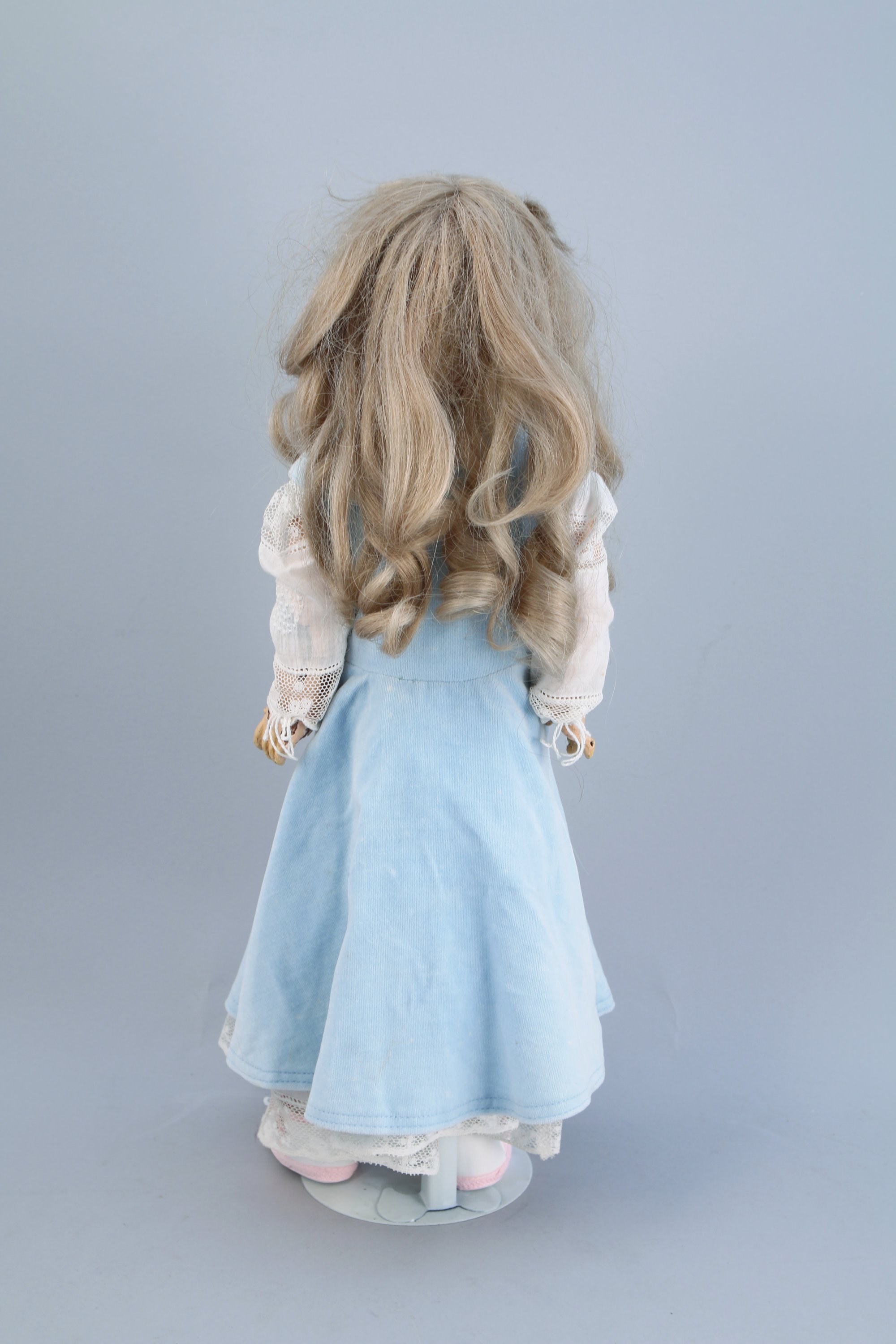 POUPÉE, tête en porcelaine marquée en creux "3". Bouche ouverte avec dents en partie supérieure, yeux bleus dormeurs en sulfure. Bras et jambes non articulés. Habits, perruque.