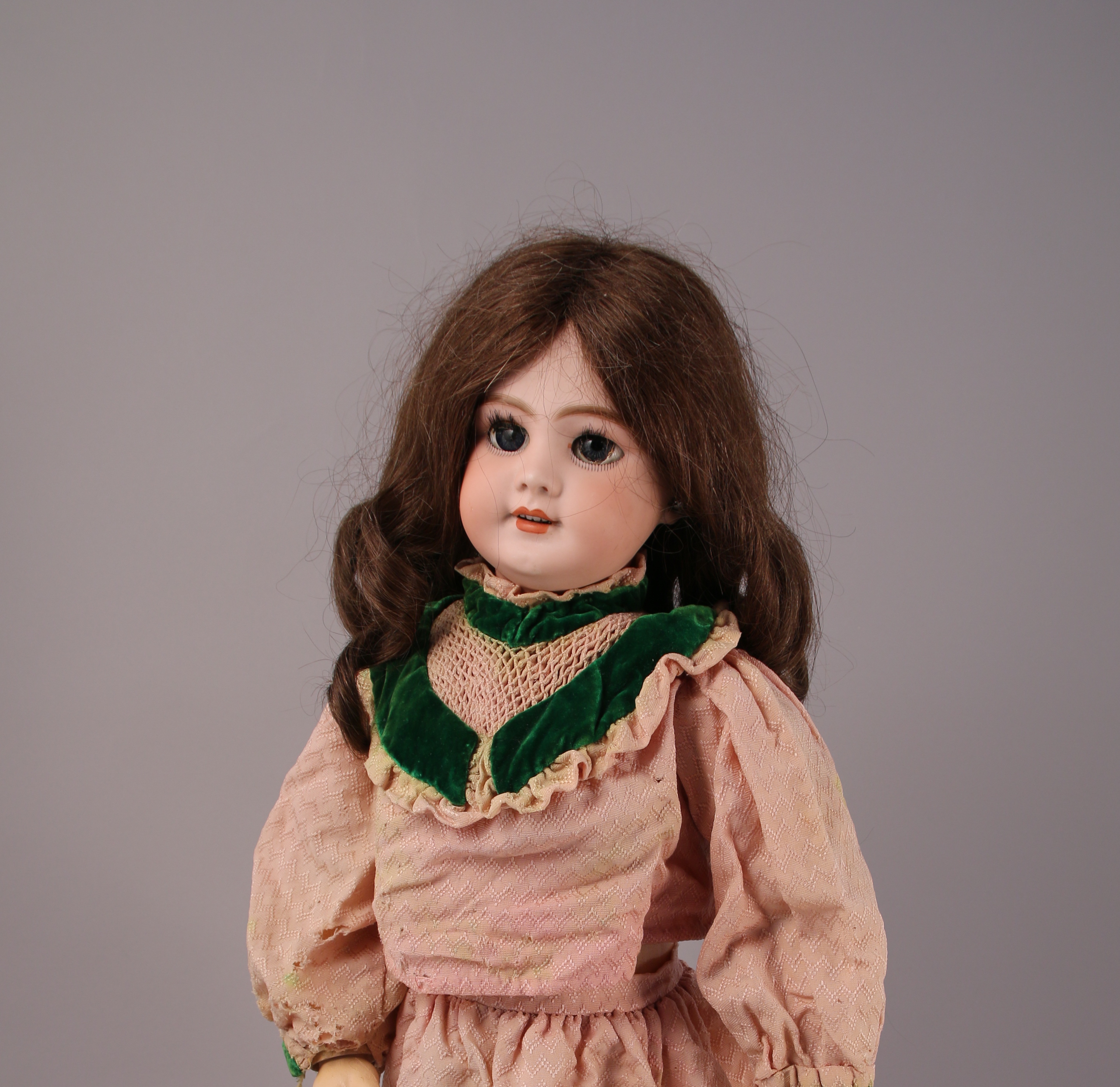 POUPÉE articulée, tête en porcelaine, yeux bleus mobiles en sulfure, bouche ouverte, cheveux châtains, oreilles ornées de boucles d'oreilles. Corps en composition. Vêtue d'un ensemble rose.