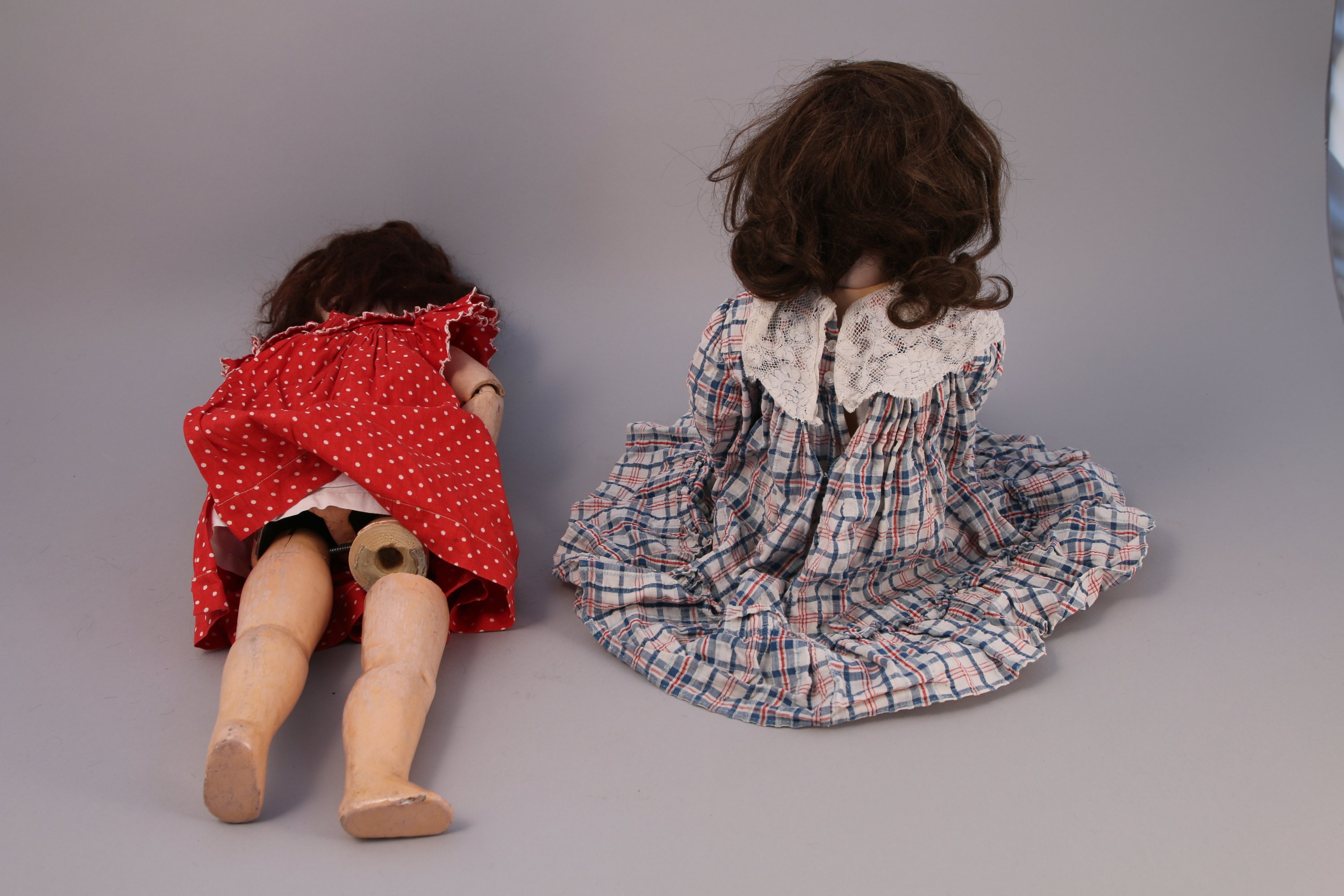 POUPÉE articulée, tête en porcelaine, yeux bleus mobiles en sulfure, bouche ouverte, cheveux châtains. Corps en composition. Vêtue d'une robe rouge à pois blancs. Marque sous les pieds "600-7".