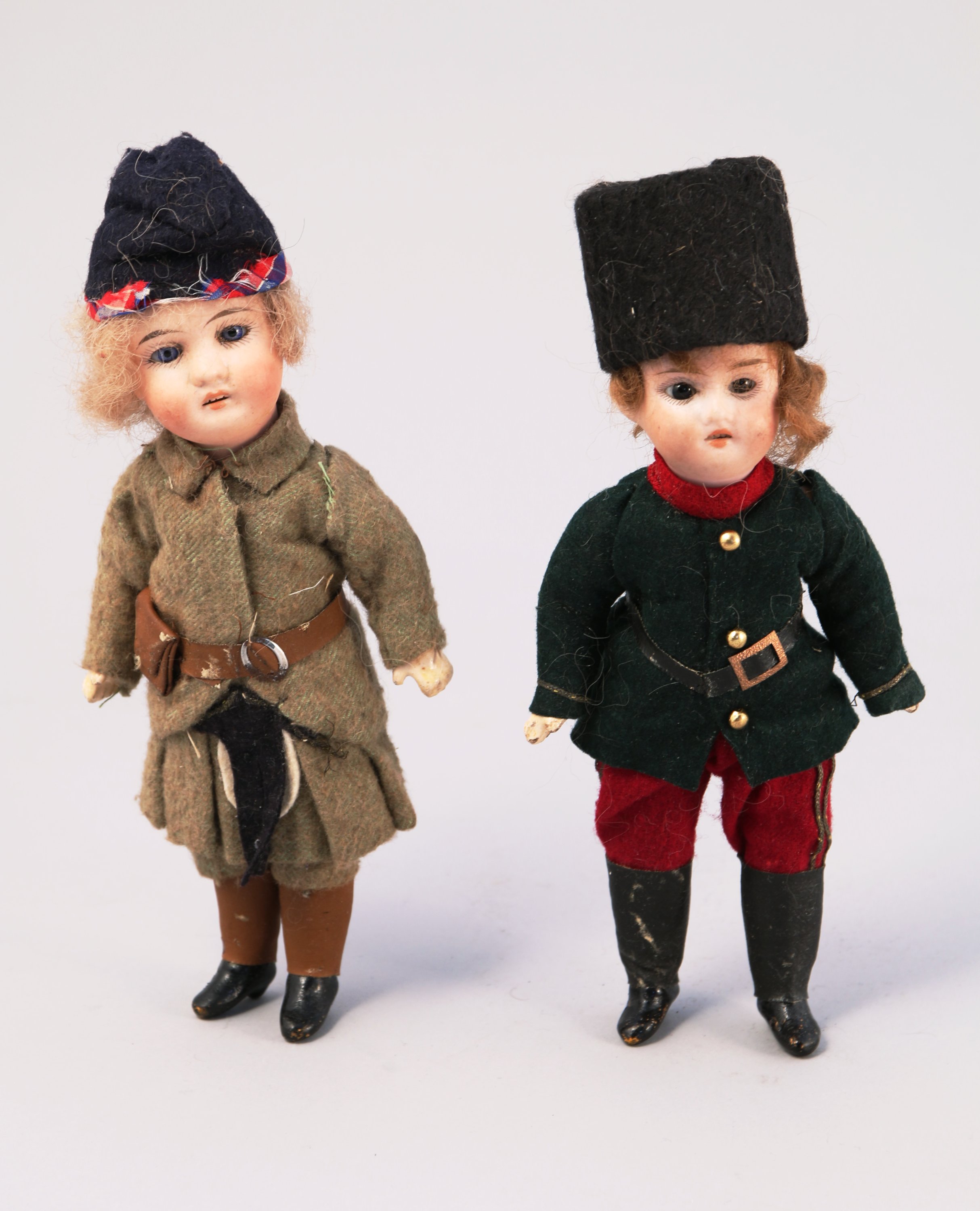 Deux MIGNONNETTES SOLDATS figurant une COSAQUE et une ÉCOSSAISE. Les têtes en biscuit signé pour l'une " MON TRÉSOR ", yeux bleus et marrons, bouches ouvertes. Corps en composition.
