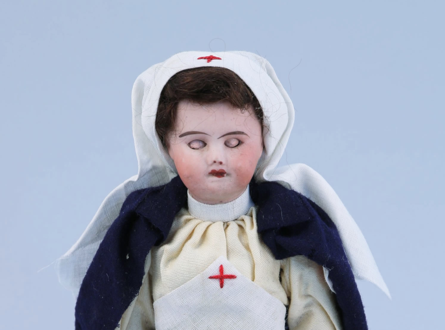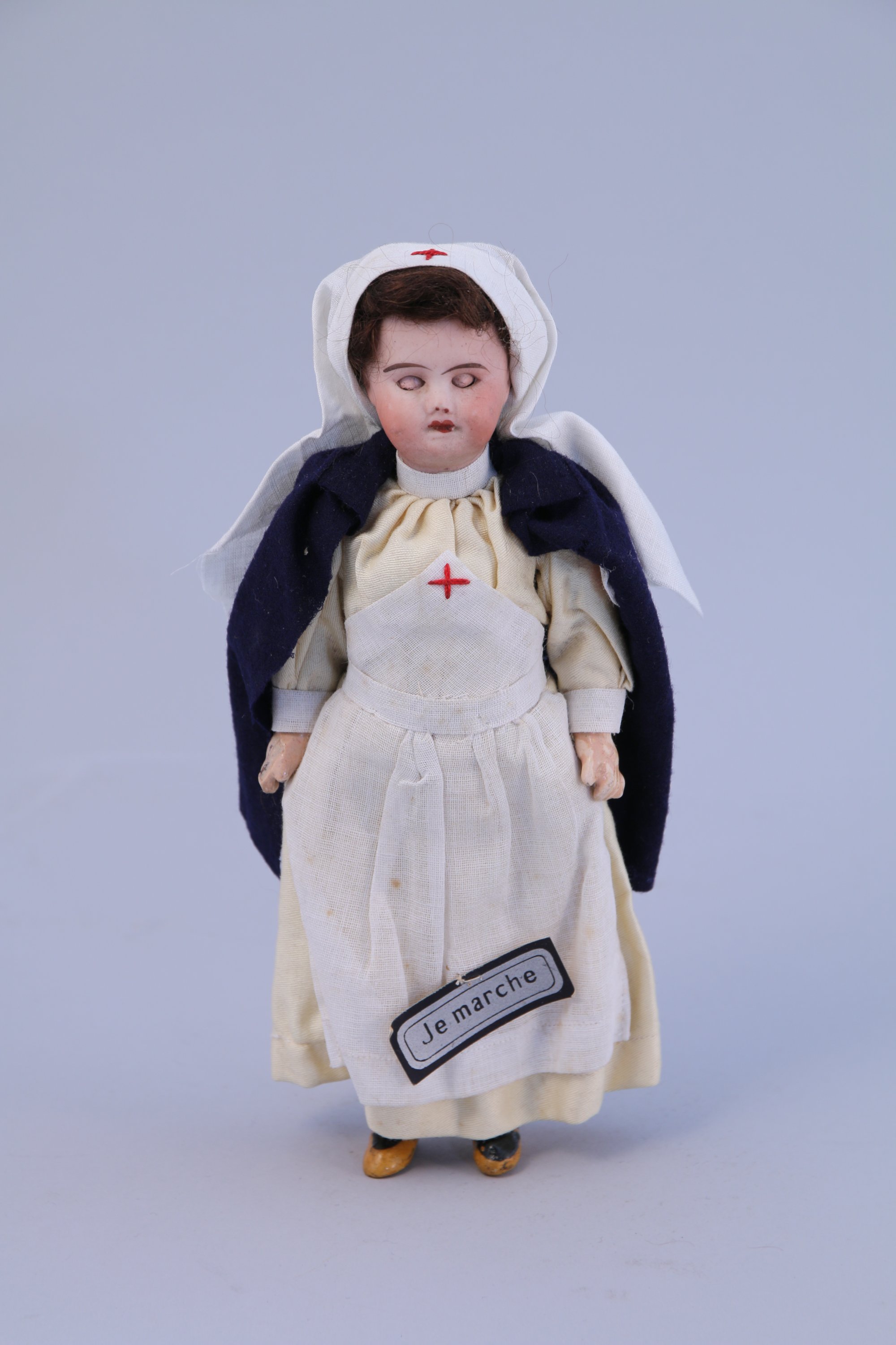 JUMEAU. MIGNONNETTE MARCHEUSE représentant une INFIRMIÈRE. La tête en biscuit signée " SFBJ 60 Paris ", les yeux foncés mobiles, coiffure châtain, bouche fermée. Corps en composition, l'action de ses jambes fait aller sa tête de droite à gauche. Avec son étiquette d'origine " je marche ".