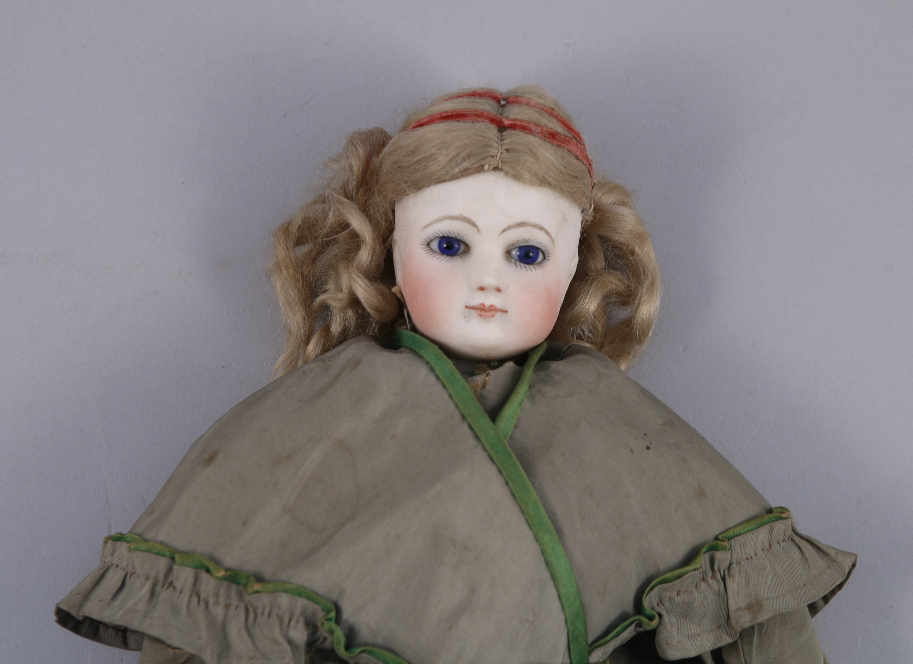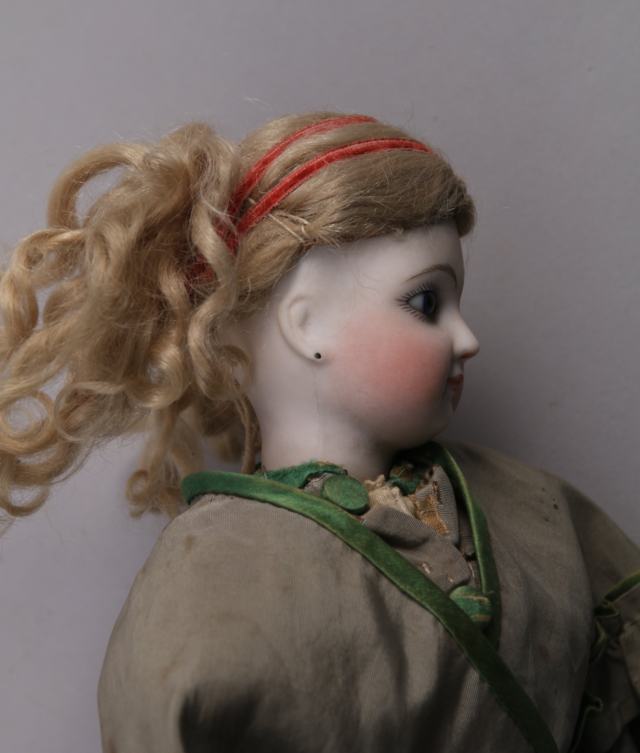 POUPÉE PARISIENNE à tête pivotante et buste en biscuit. Yeux de sulfure bleus, bouche fermée et oreilles percées. Calotte en liège et perruque blonde. Corps en peau, articulations à goussets. Robe ancienne en soie verte. Bottines et chaussettes.