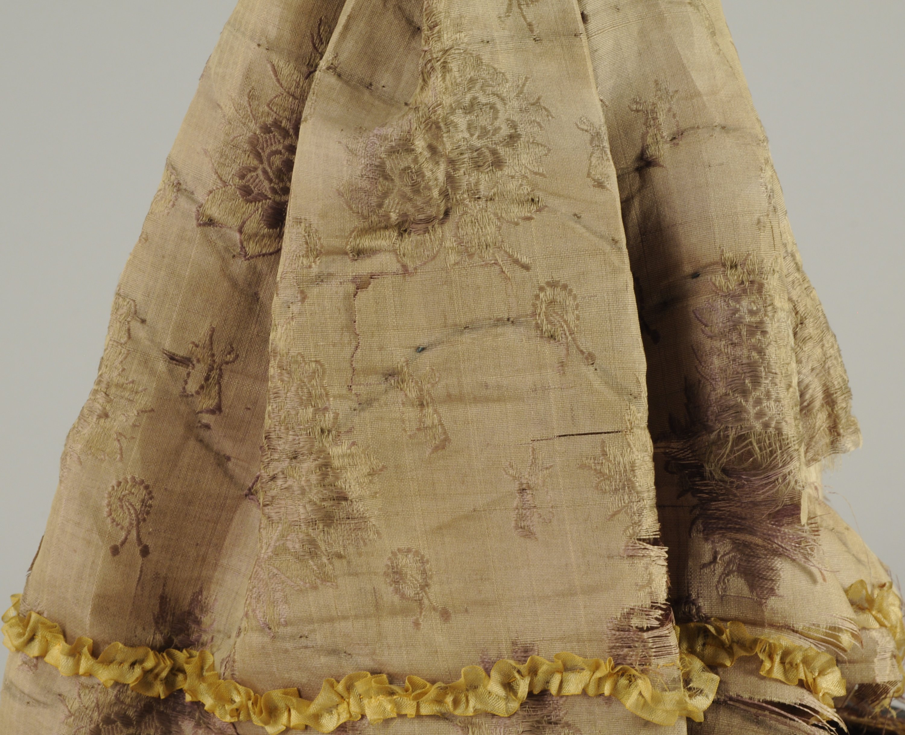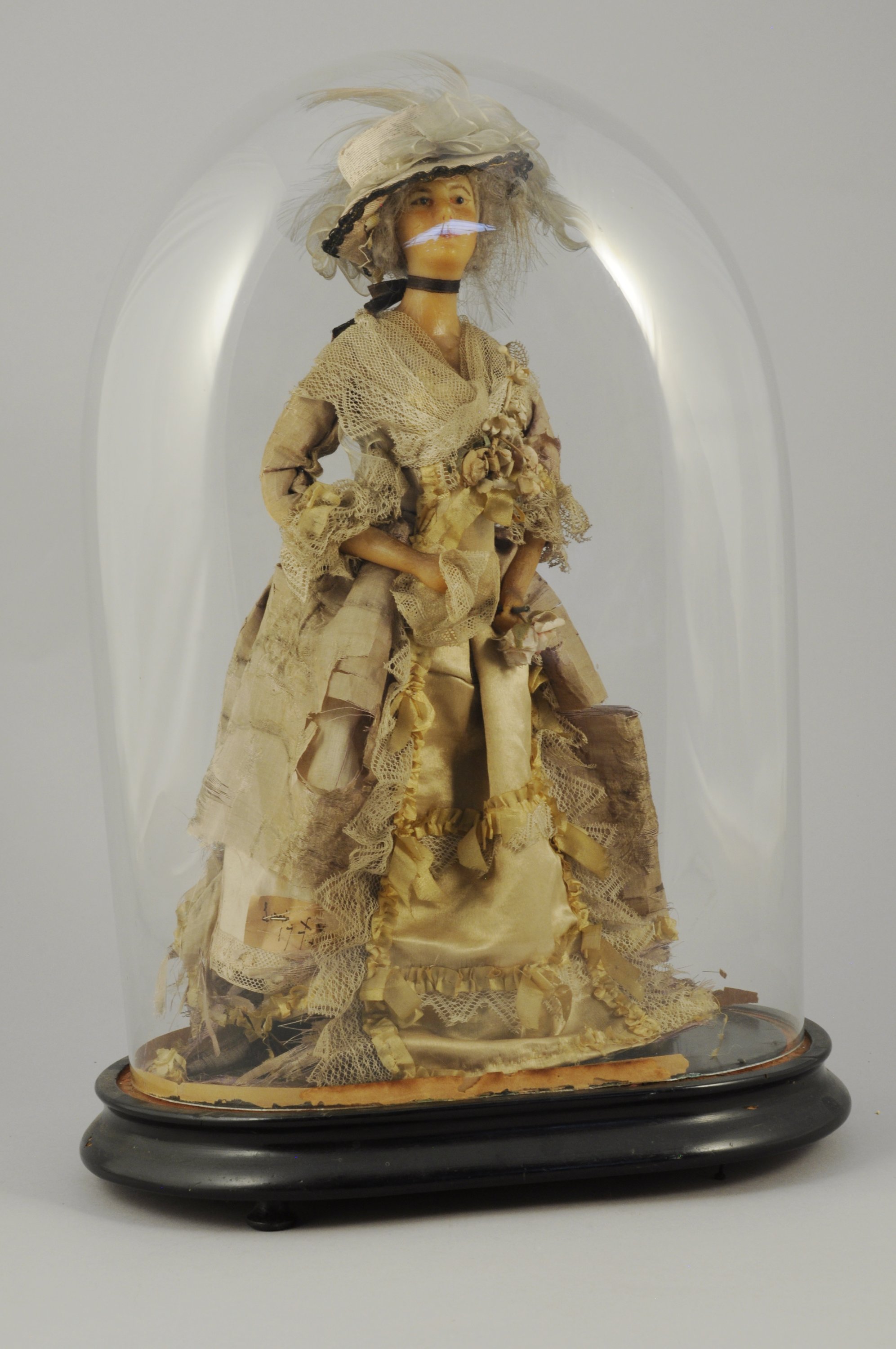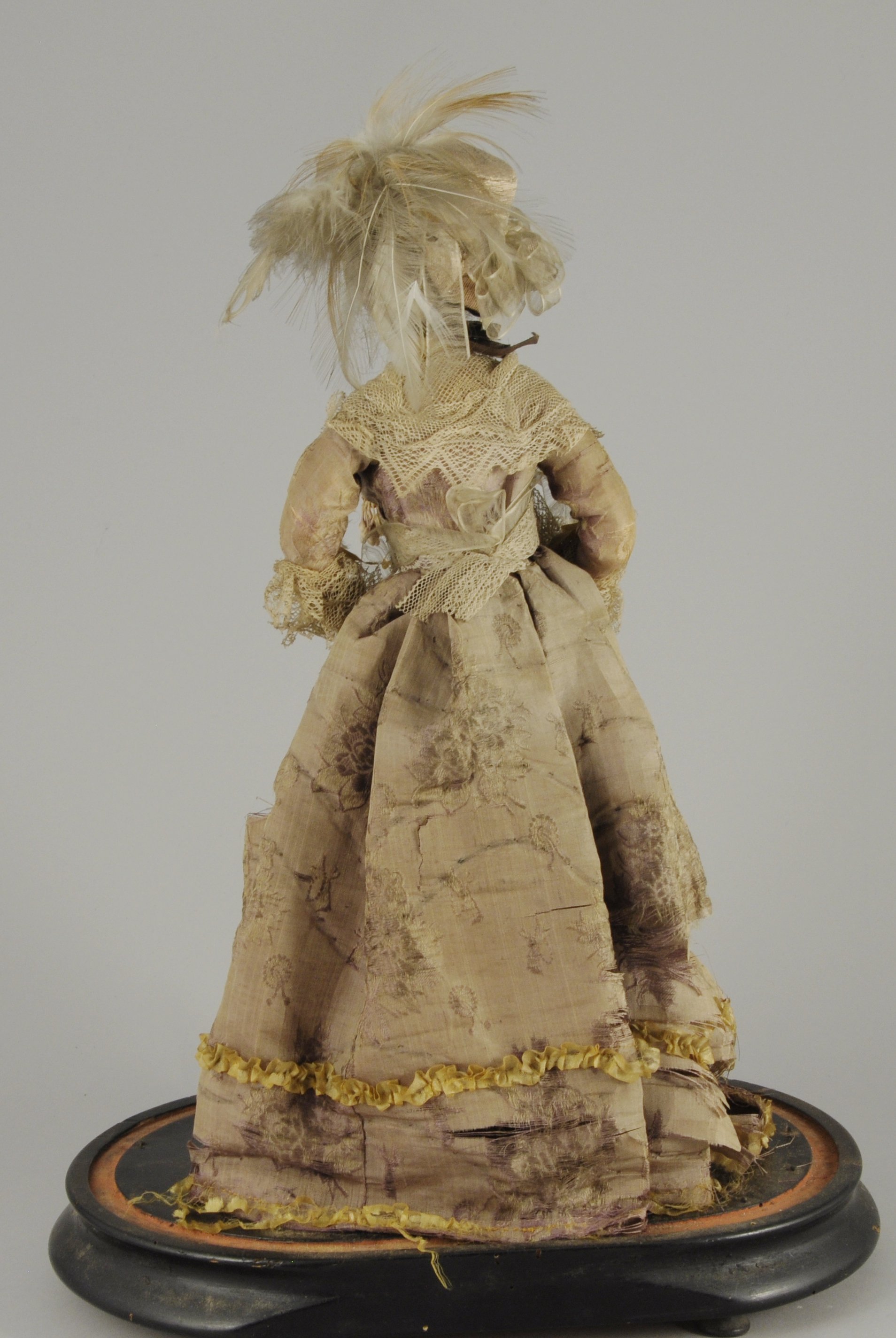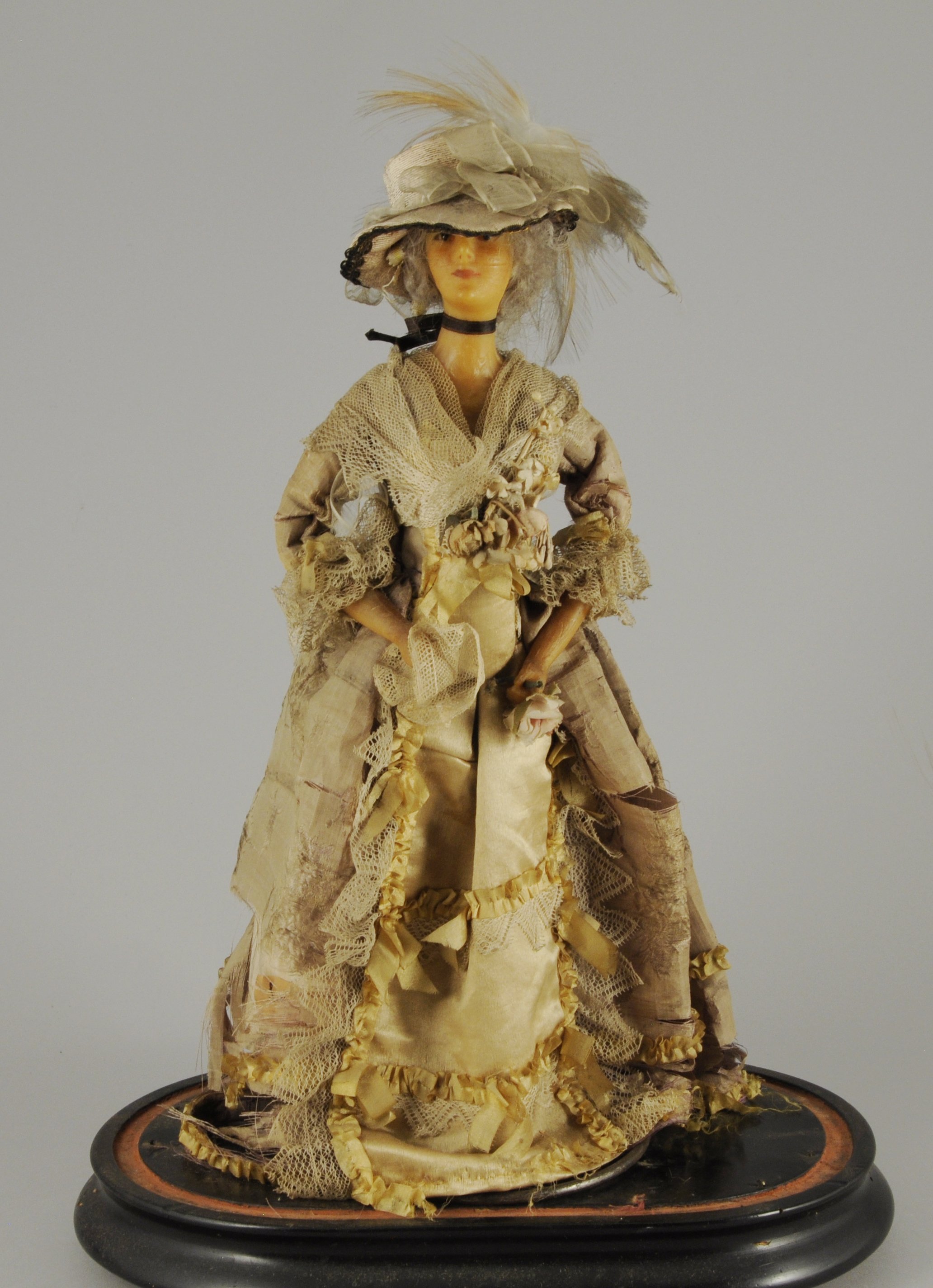 POUPÉE de mode avec buste et bras en cire. Cheveux gris naturel. Corps articulé en tissu bourré. Elle est vêtue d'une robe en dentelle et en soie jaune et beige agrémentée de fleurs et d'un chapeau à plumes dans le goût du XVIIIe siècle.