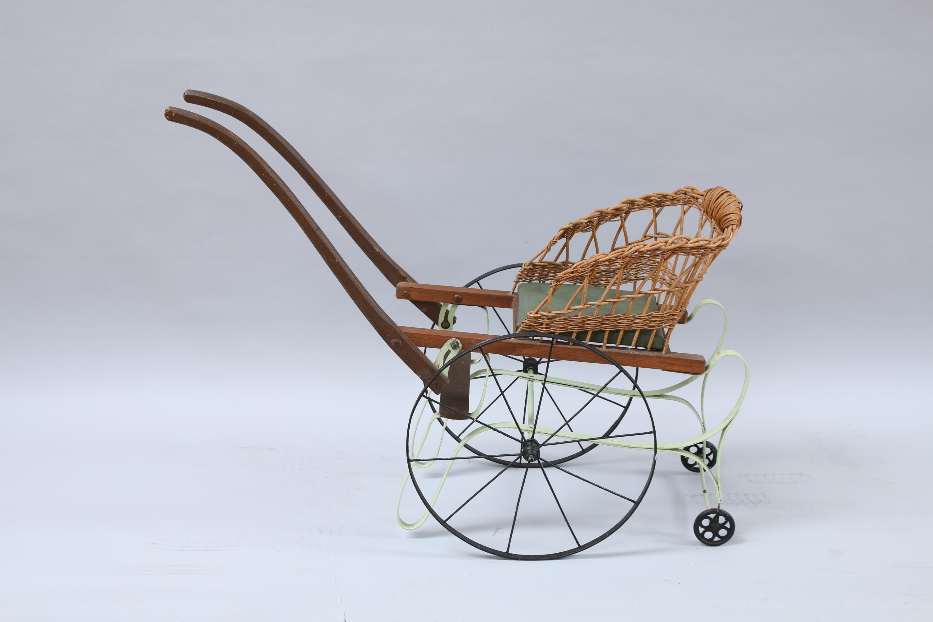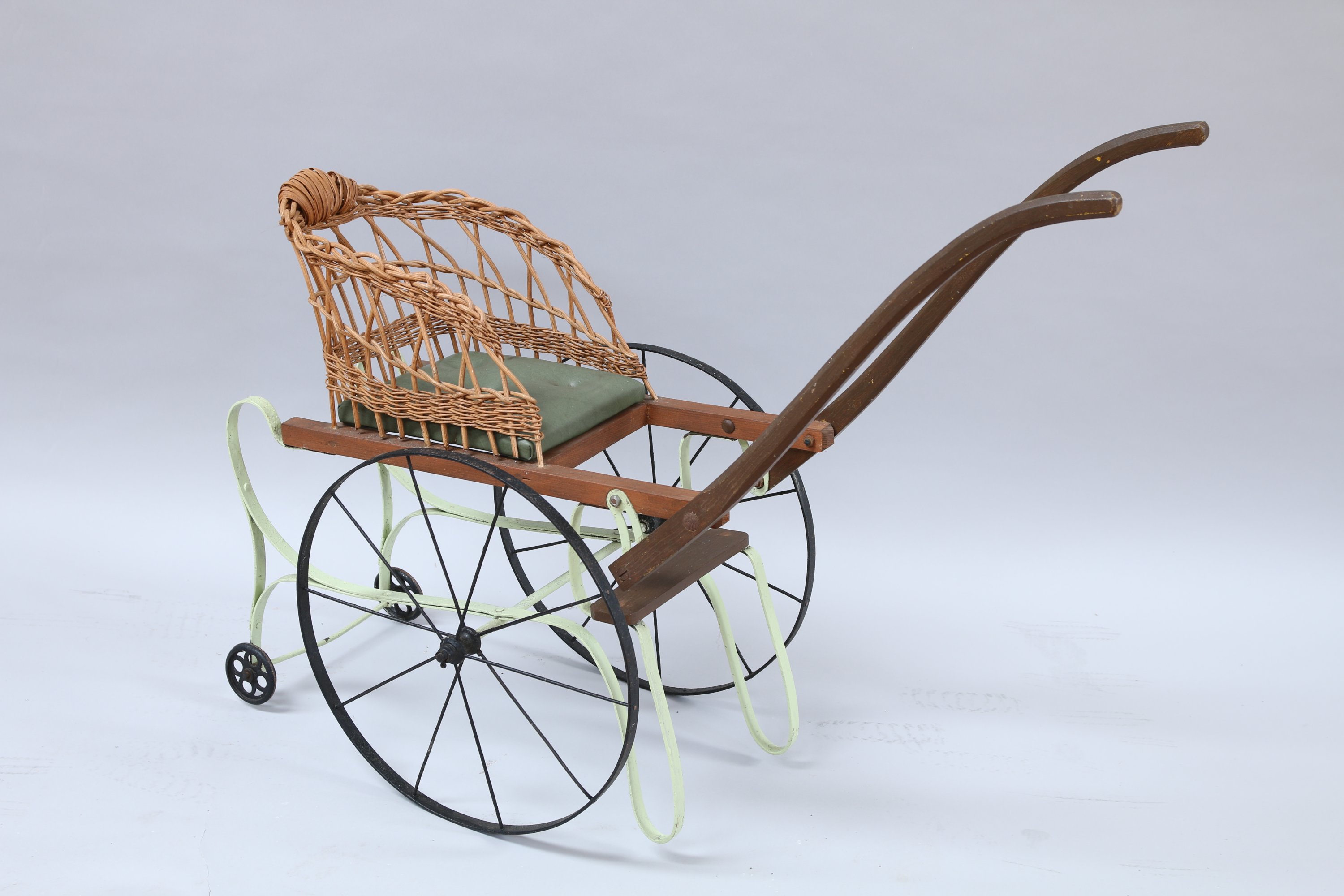 POUSSETTE en osier, bois et fer peint en vert reposant sur quatre roues. Coussin d'assise en skaï.