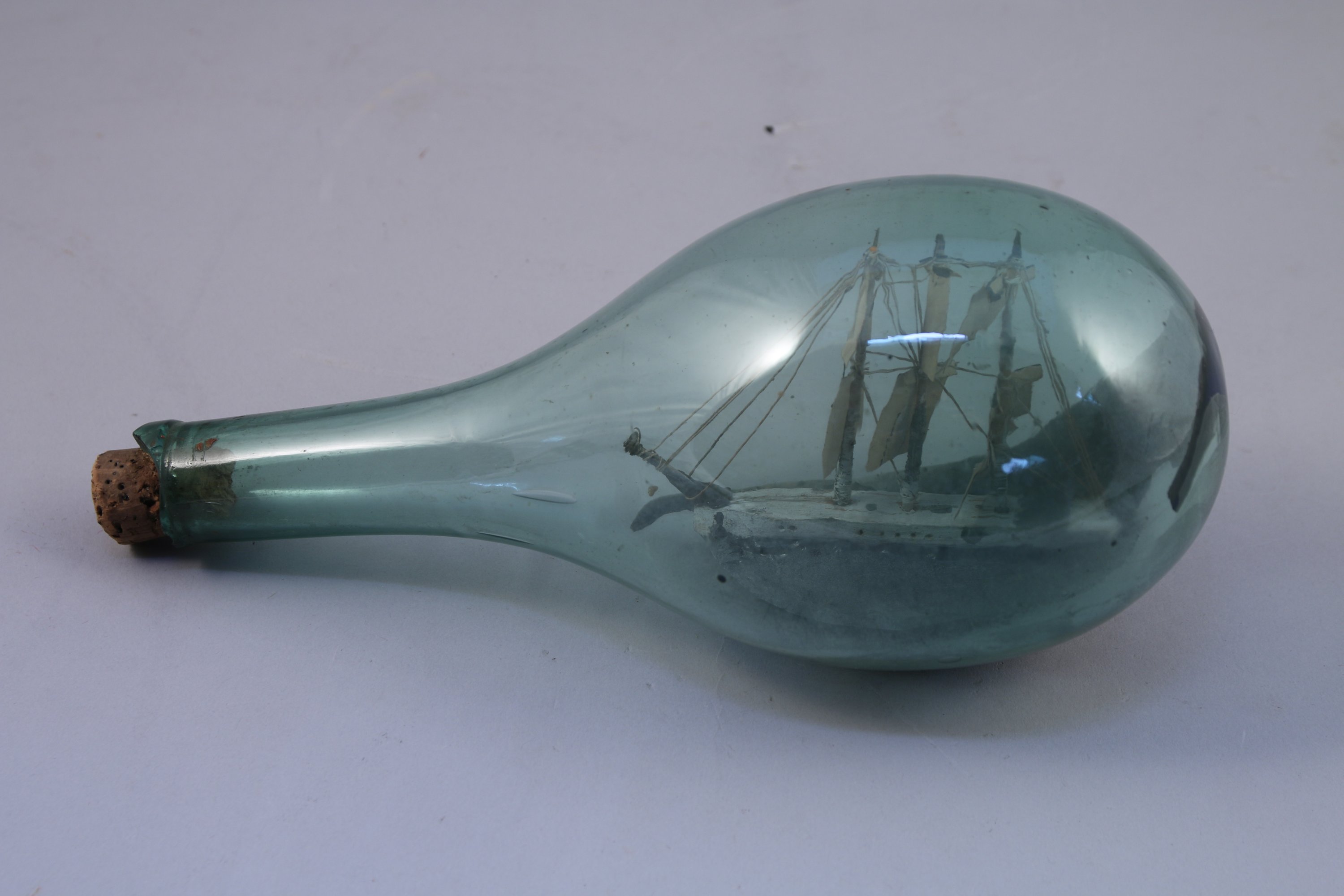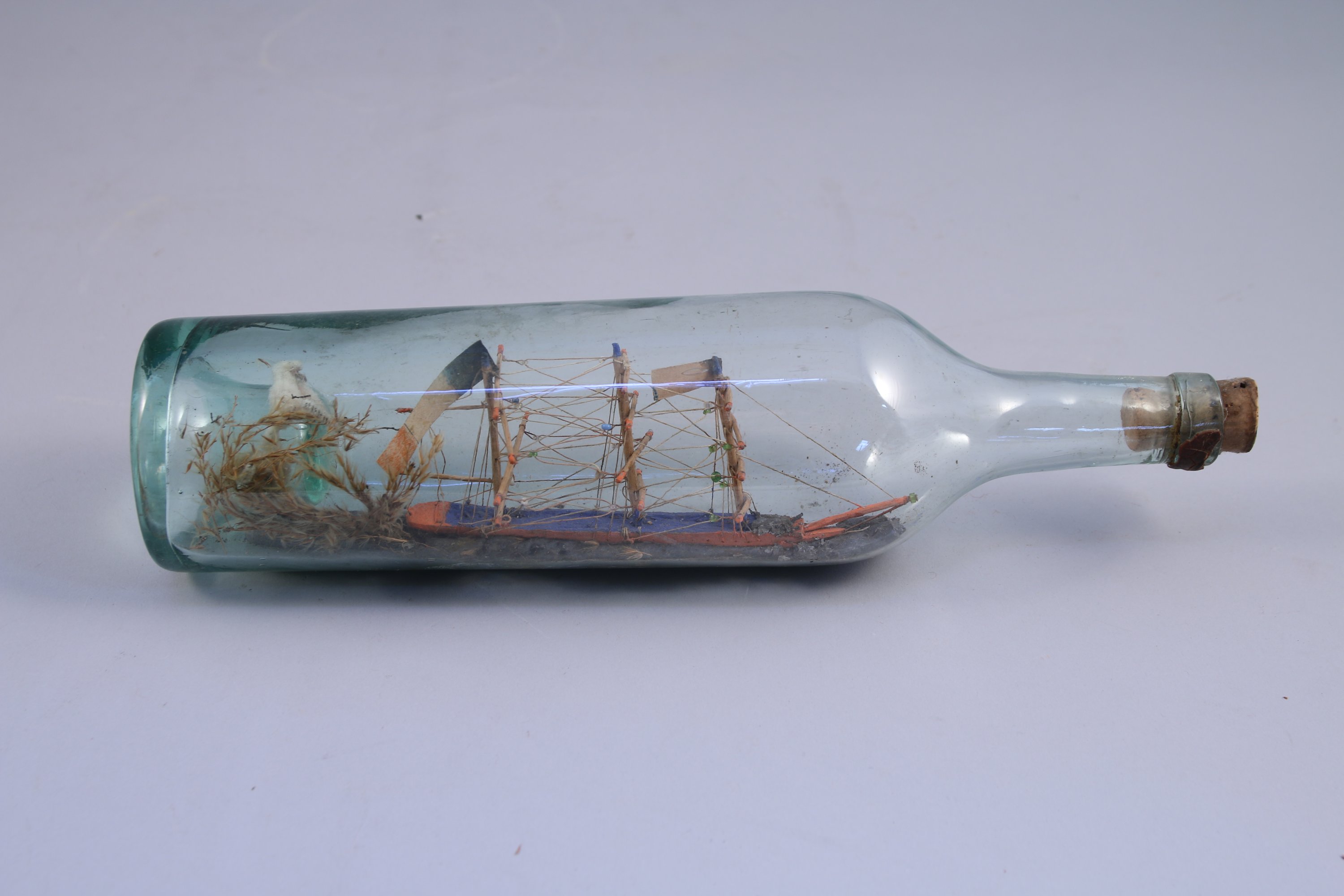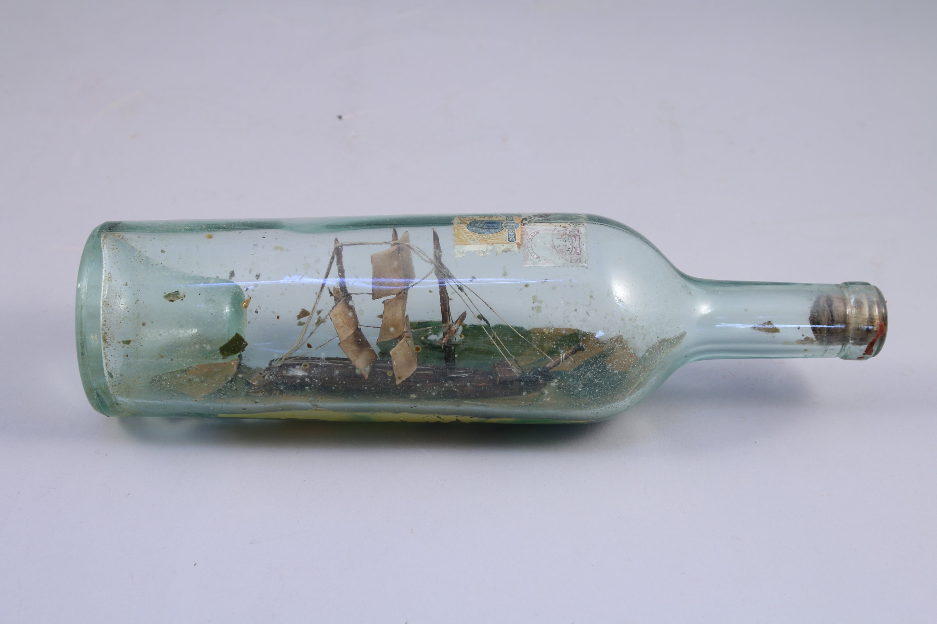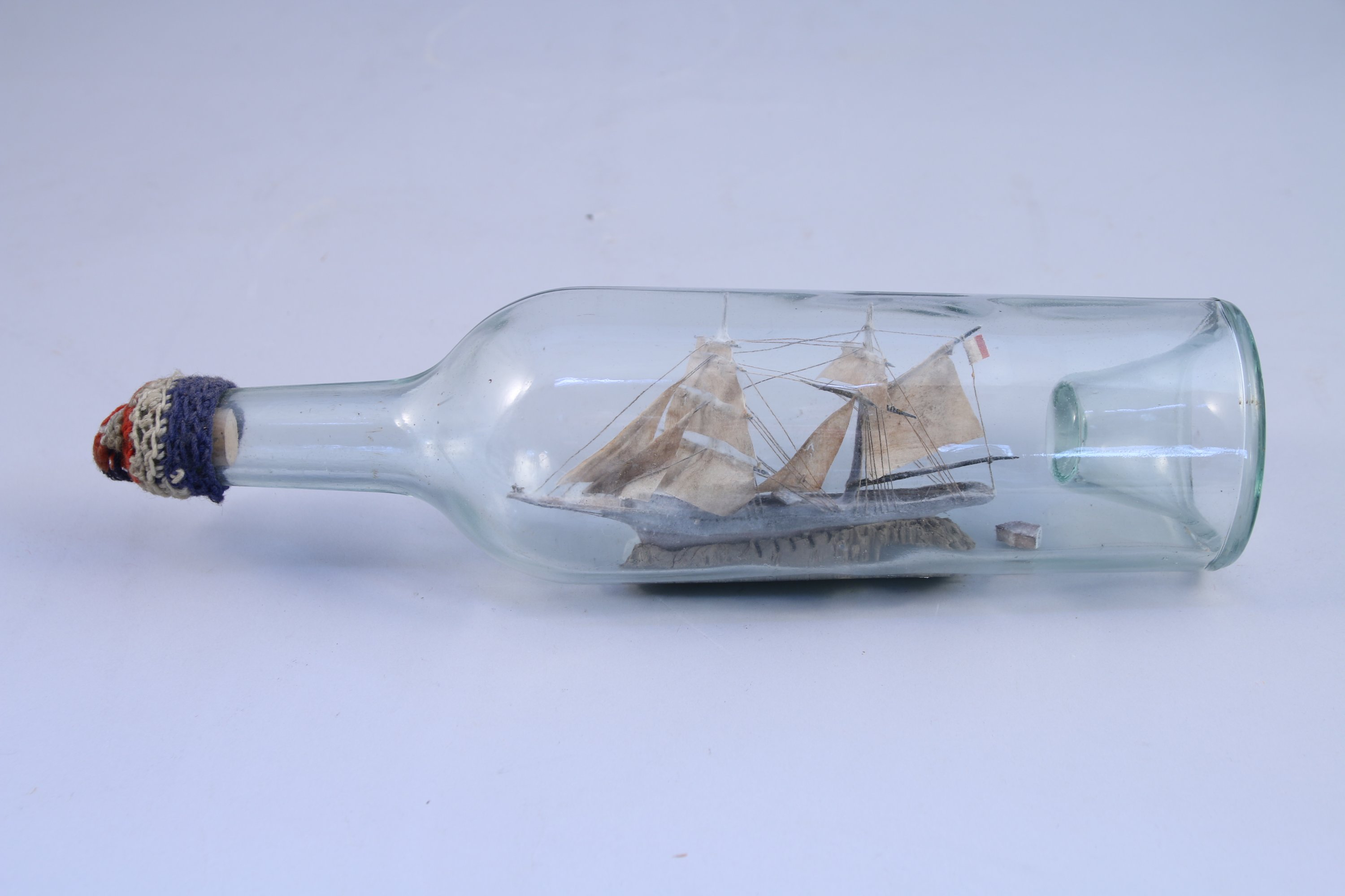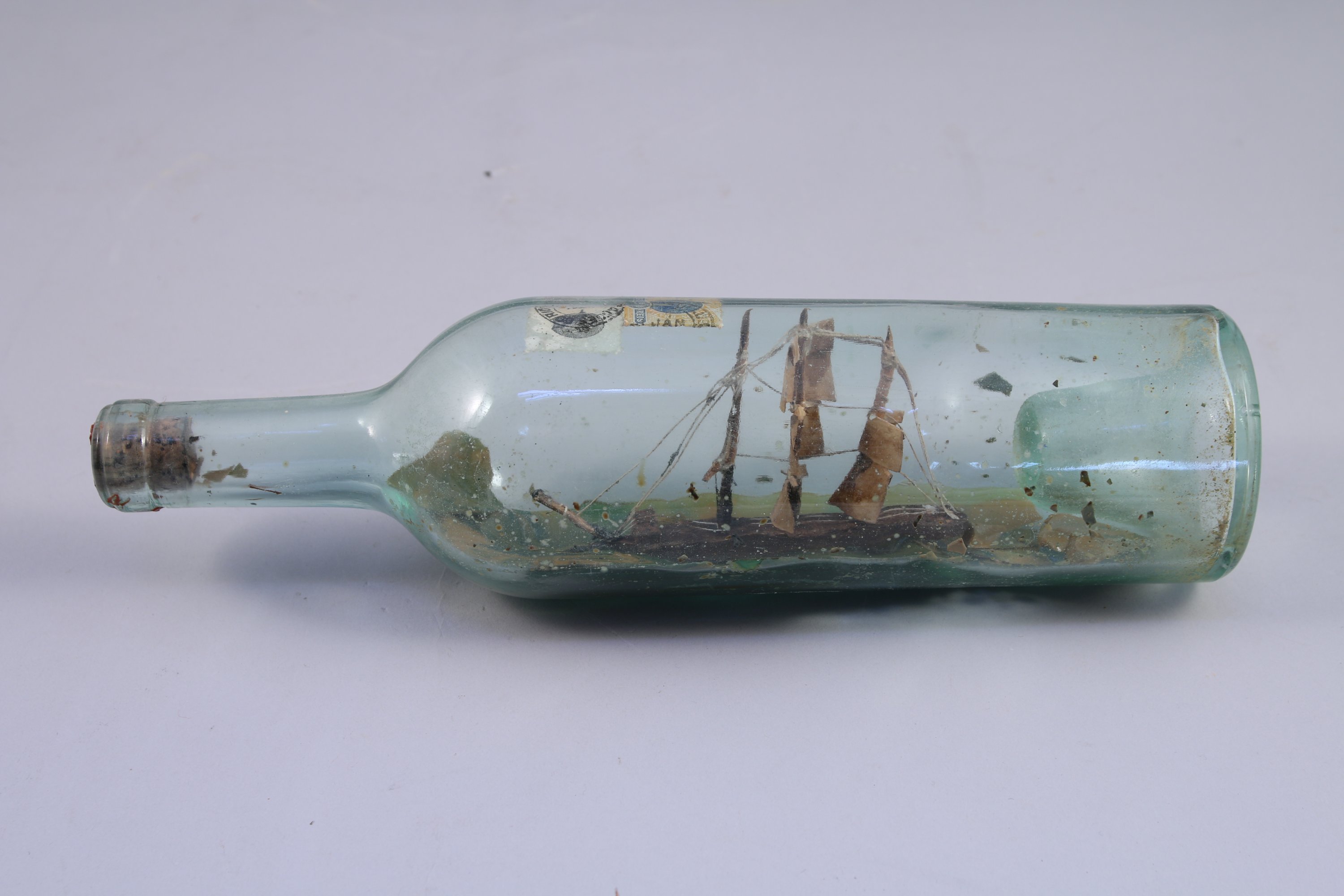 JOINT: DEUX TROIS-MÂTS EN BOUTEILLE. Fin XIXe-début XXe. Long. 30,5, et 26 cm. (en l'état)
