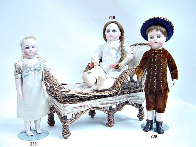 Bébé Steiner de type Motschmann, tête pleine (avec ouverture), buste, bassin, et membres en biscuit, l'ensemble intacte, articulations souples en tissu, bouche fermée, beaux yeux de sulfure bleu à rayons, robe ancienne (léger défaut de cuisson à l'arrière du bassin). 36 cm.