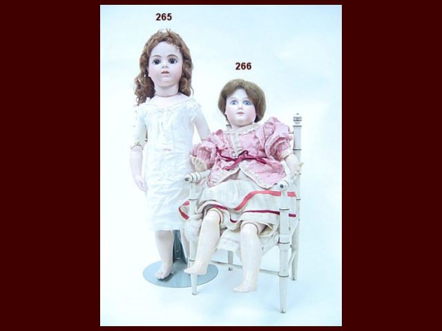 Bouche fermée, yeux de sulfure marron, oreilles percées, beau corps en peau portant l'étiquette "Bébé Bru Bté SGDG tout contre facteur sera saisi et poursuivi conformément à la loi", bras et mains en biscuit, jambes en bois peint, robe blanche et perruque.