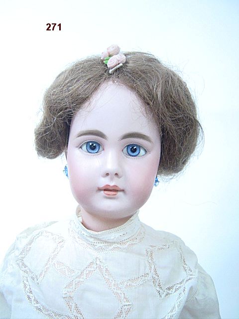 Bouche fermée, yeux fixes bleus, oreilles percées, sur un corps articulé SFBJ, habits et perruque. 62 cm.