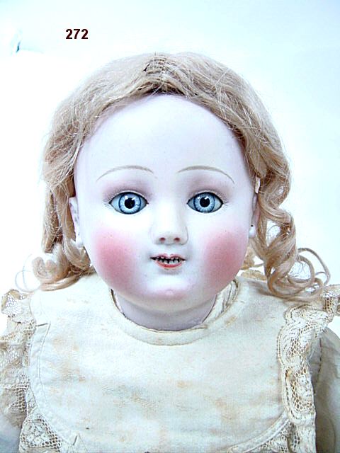 Tête en biscuit pressé, yeux bleus émaillés, oreilles percées, beau corps à 8 boules et poignets fixes (petit accident à une jambe), habits anciens, perruque. 48 cm.