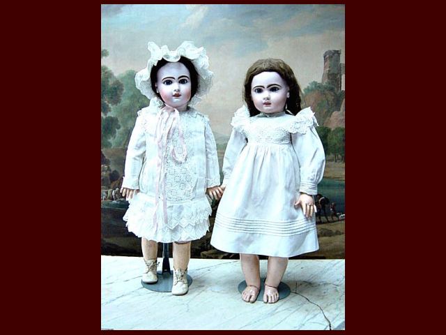 Bouche ouverte, yeux de sulfure bleu, oreilles percées et rapportées, corps articulé (accidents à la main droite), robe blanche et perruque. 86 cm.