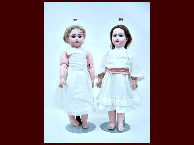 Bouche ouverte, yeux de sulfure marron mobiles, mécanisme à contre-poids, marquée au tampon rouge "Déposé Tête Jumeau 12", corps articulé, habits blancs, perruque en mohair blond. 66 cm.