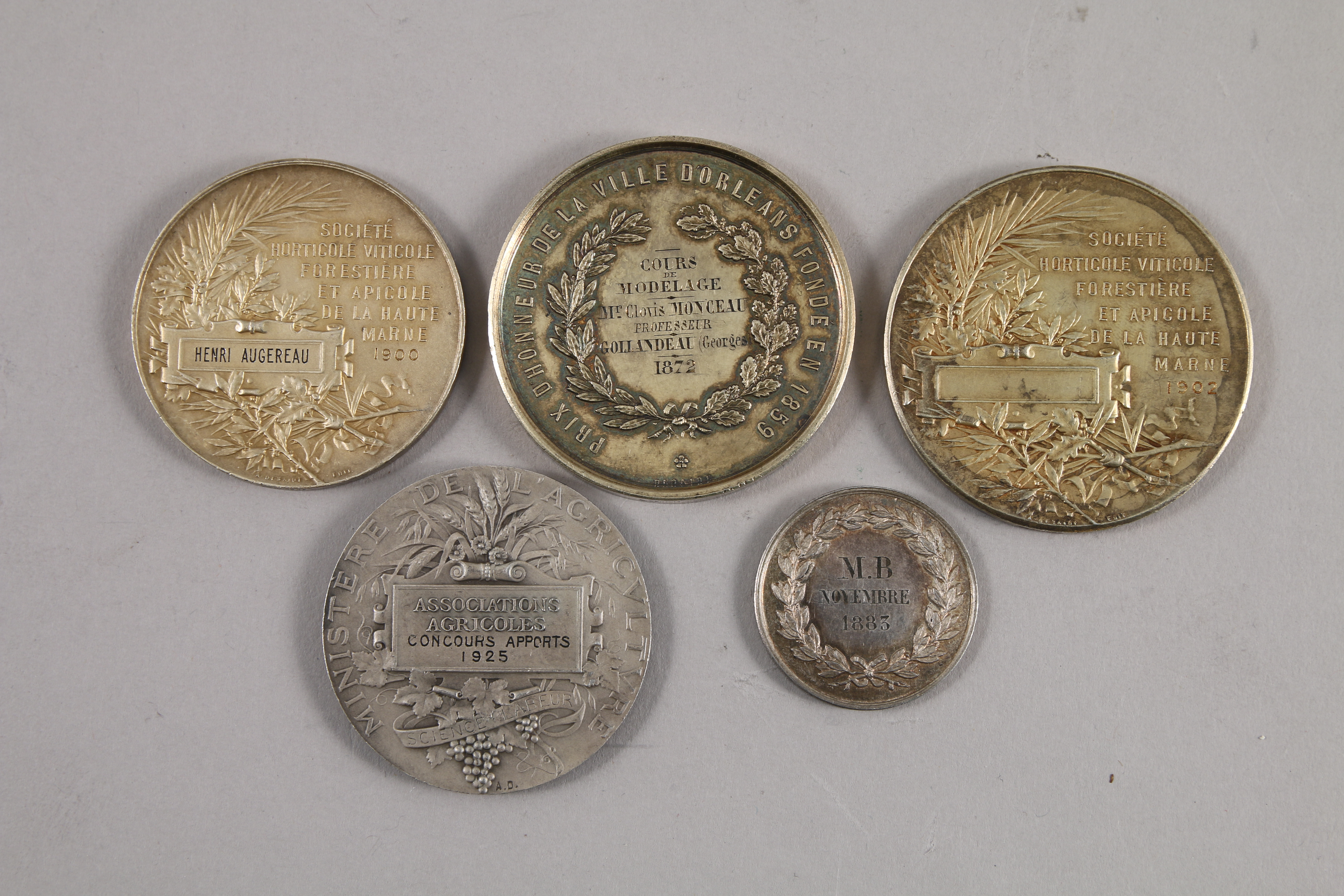 JOINT: CINQ MÉDAILLES, trois en vermeil et deux en argent dont une du prix d'honneur de la ville d'Orléans et deux de la société horticole de la Haute-Marne. Poids total: 177,7 g.
