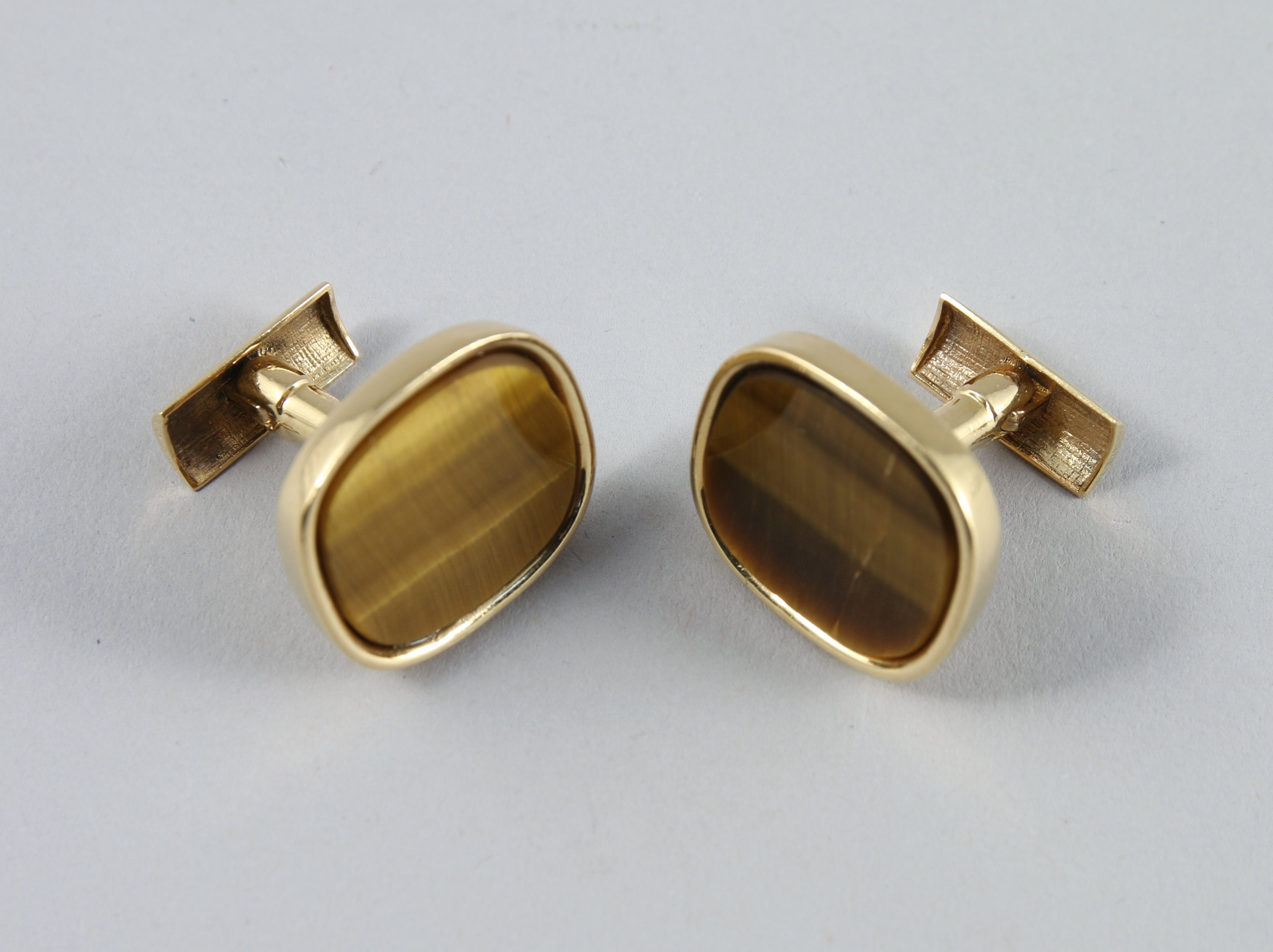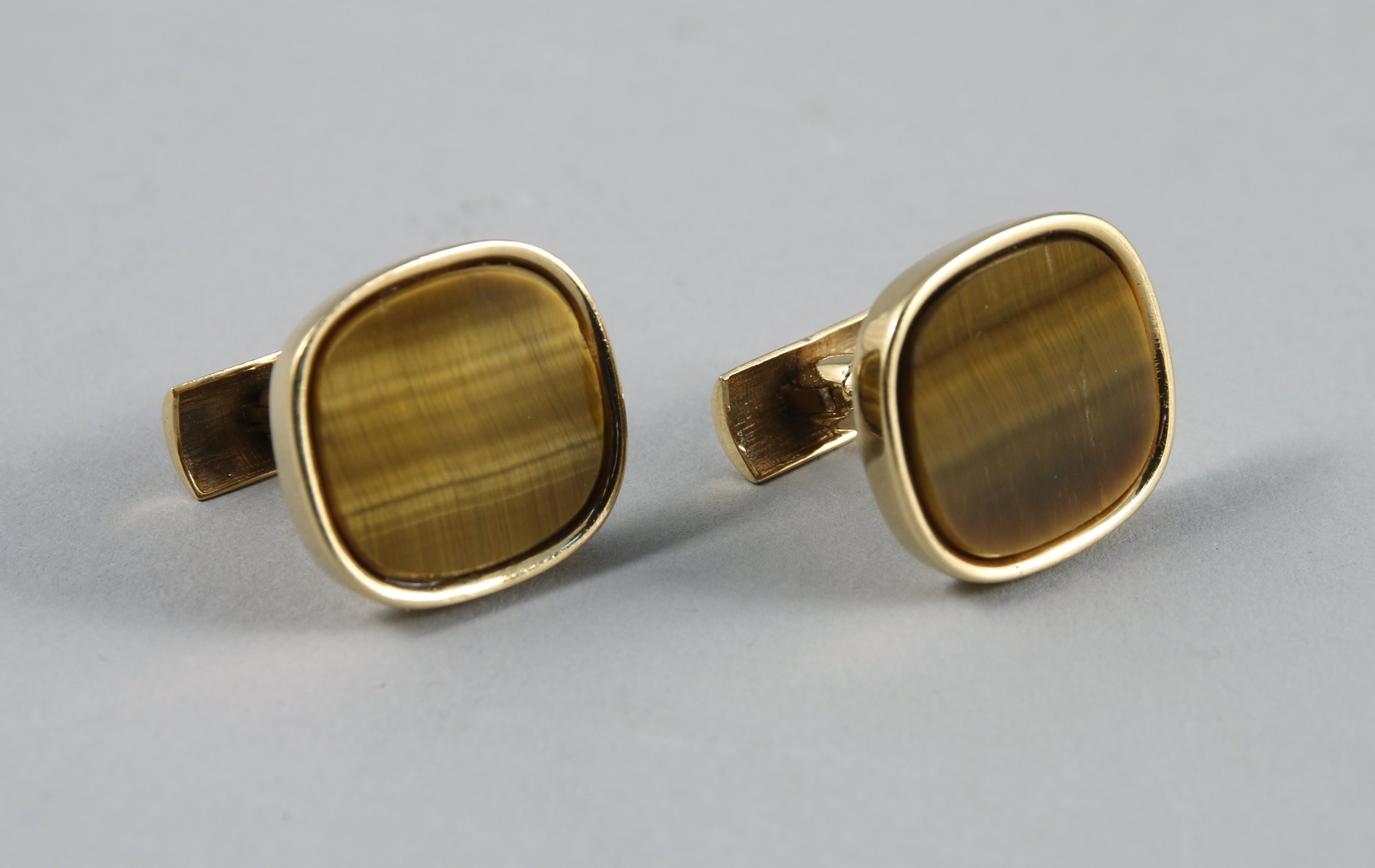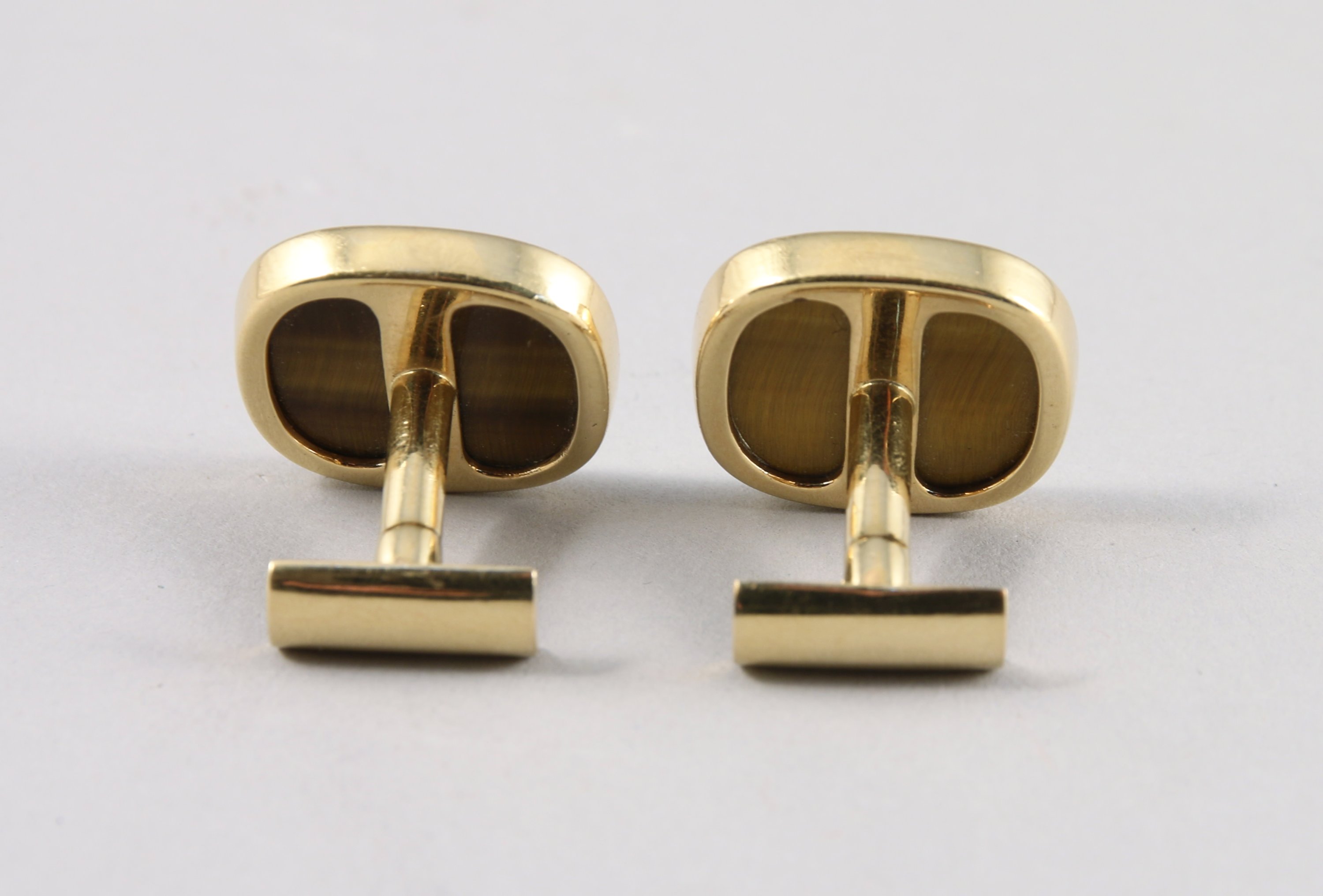 PAIRE DE BOUTONS DE MANCHETTES en or jaune 750 millièmes. Plateau de forme rectangulaire sertissant une plaque d'oeil de tigre.