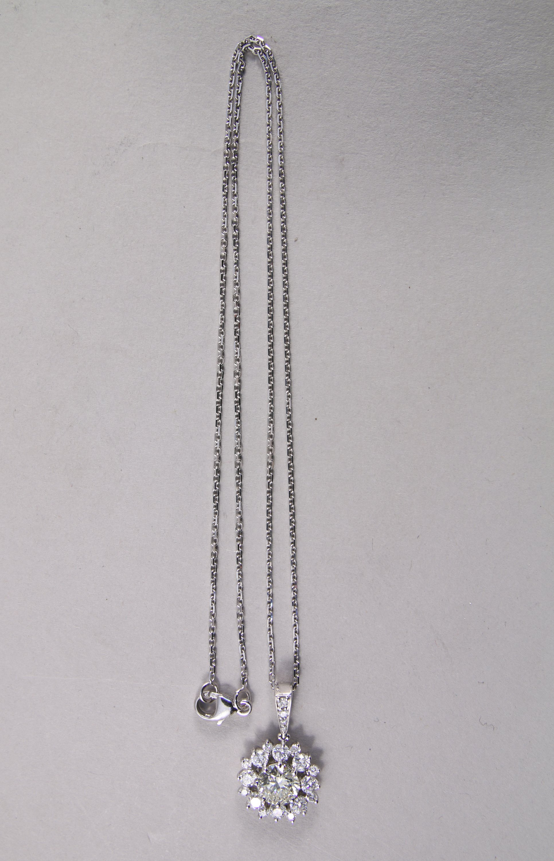 PENDENTIF marguerite en or blanc 750 millièmes orné d'un DIAMANT taille moderne de 1,02 carat dans un entourage de 20 DIAMANTS taille moderne.