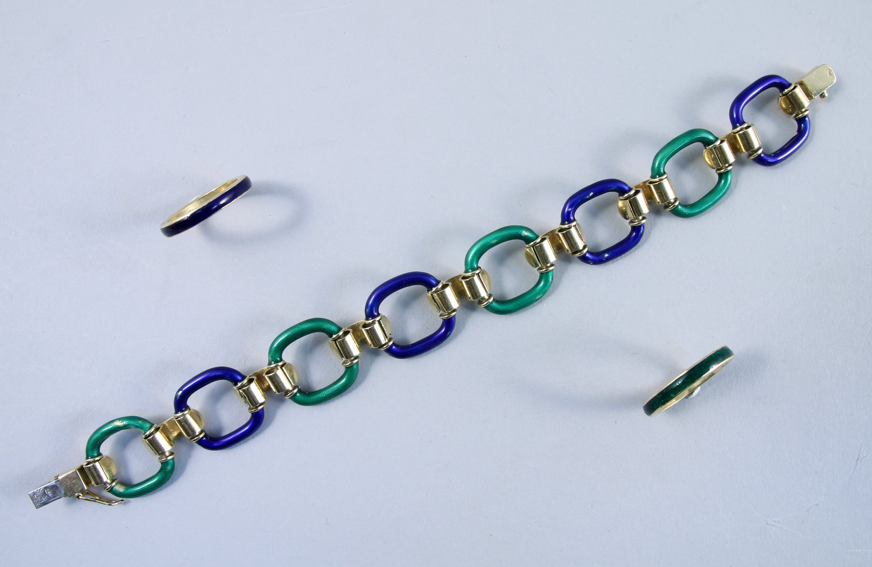 BRACELET articulé en or jaune 750 millièmes présentant des anneaux émaillés bleu et vert en alternance.