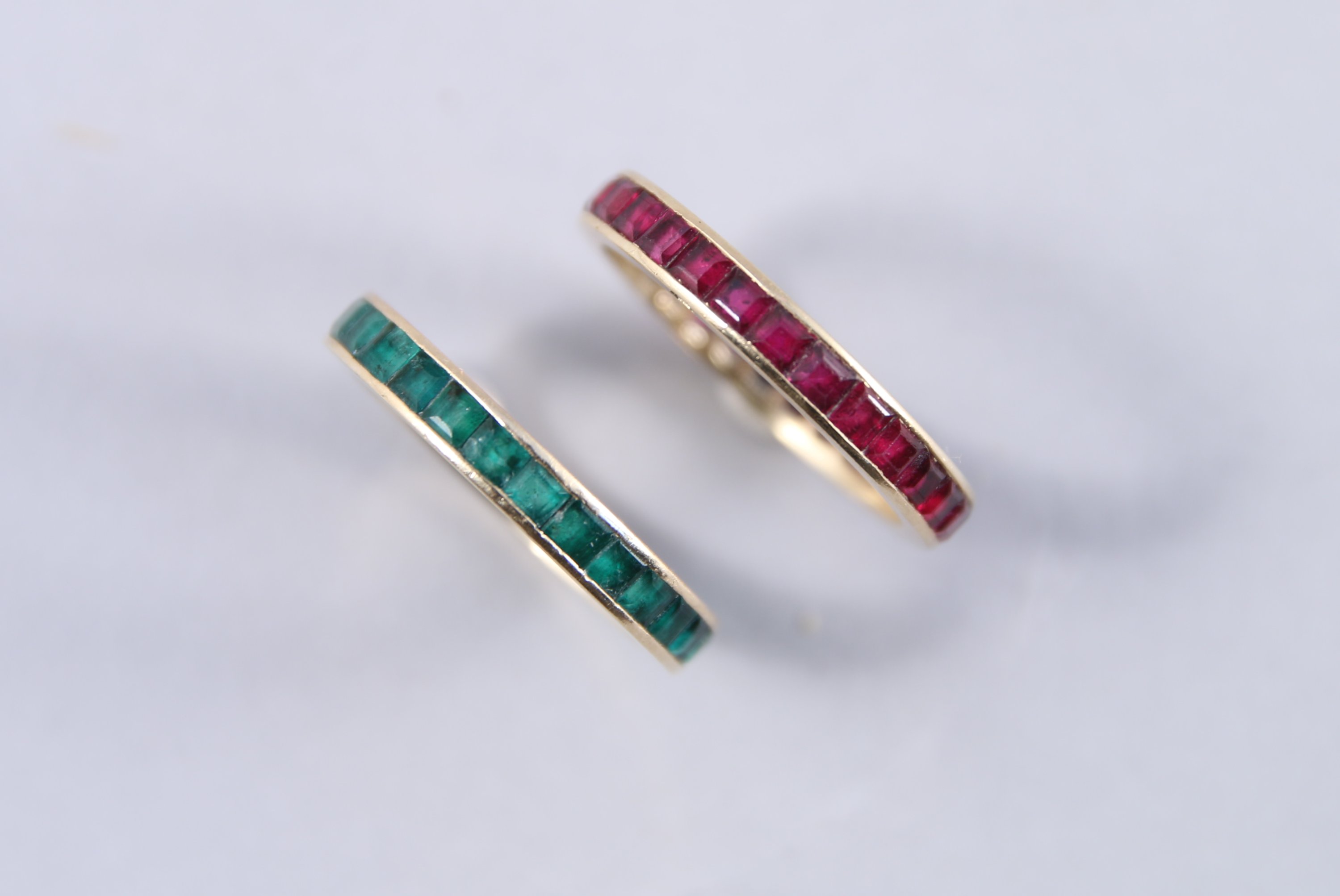 DEUX ALLIANCES AMÉRICAINES en or jaune 750 millièmes. La première sertie de RUBIS calibrés, la seconde d'ÉMERAUDES calibrées.