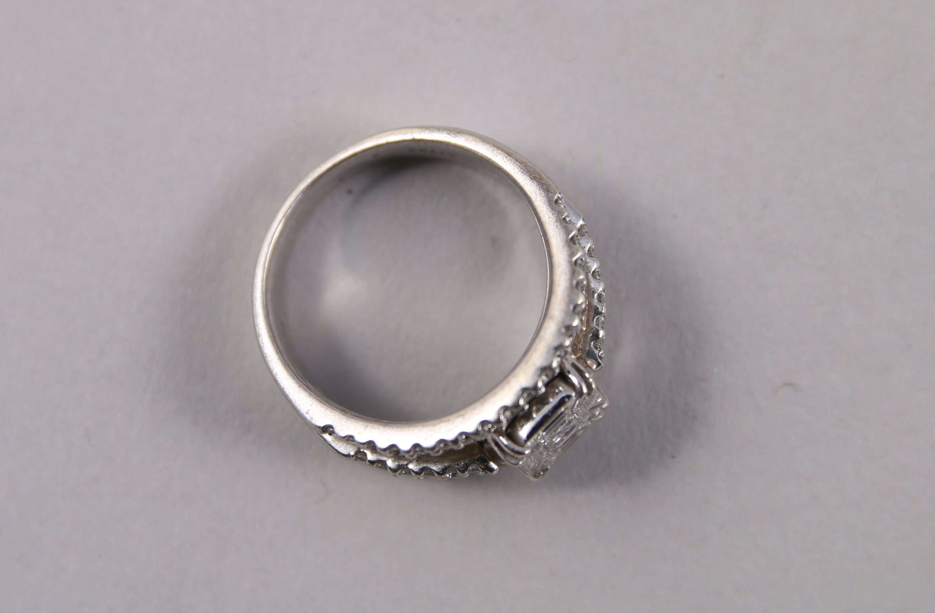 BAGUE en or blanc 750 millièmes ornée en son centre de neuf DIAMANTS taille émeraude et trapèze. Monture à cinq anneaux pavés de 74 DIAMANTS taille moderne.
