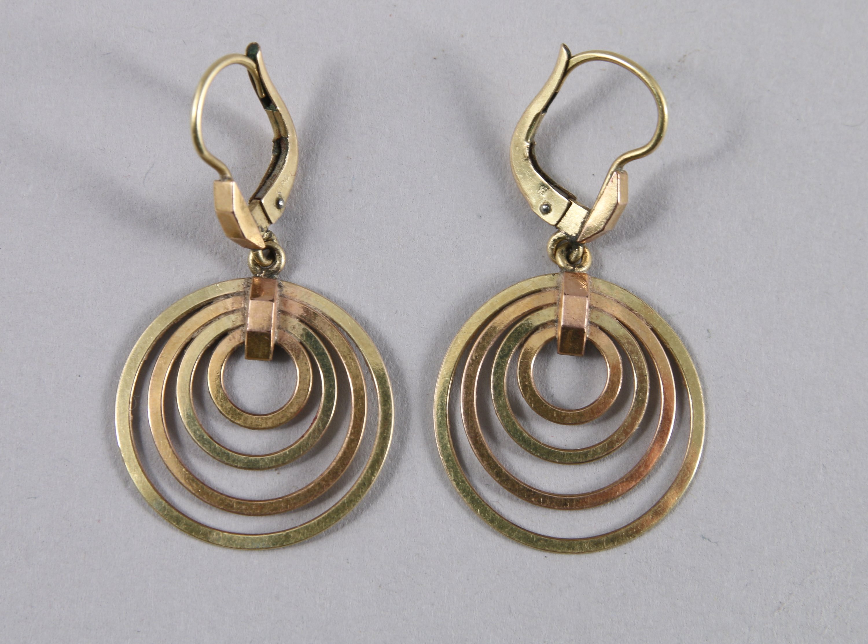 JOINT: PAIRE de PENDANTS d'OREILLE en métal doré à décor de disques concentriques.
