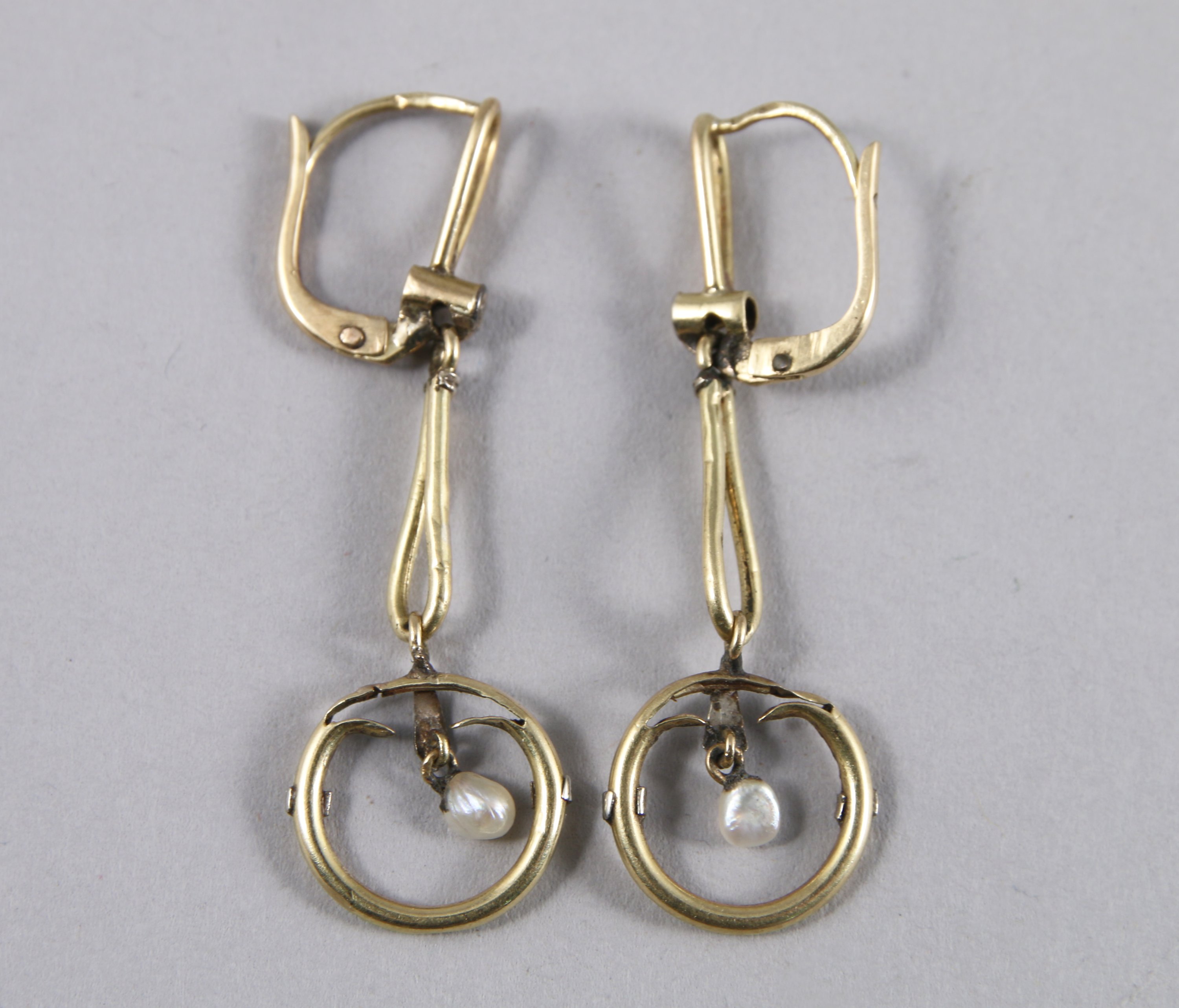 PAIRE de PENDANTS d'OREILLE en or jaune 18K, composés de trois éléments articulés. Le dernier de forme circulaire retenant une petite perle. Poinçon tête d'aigle.