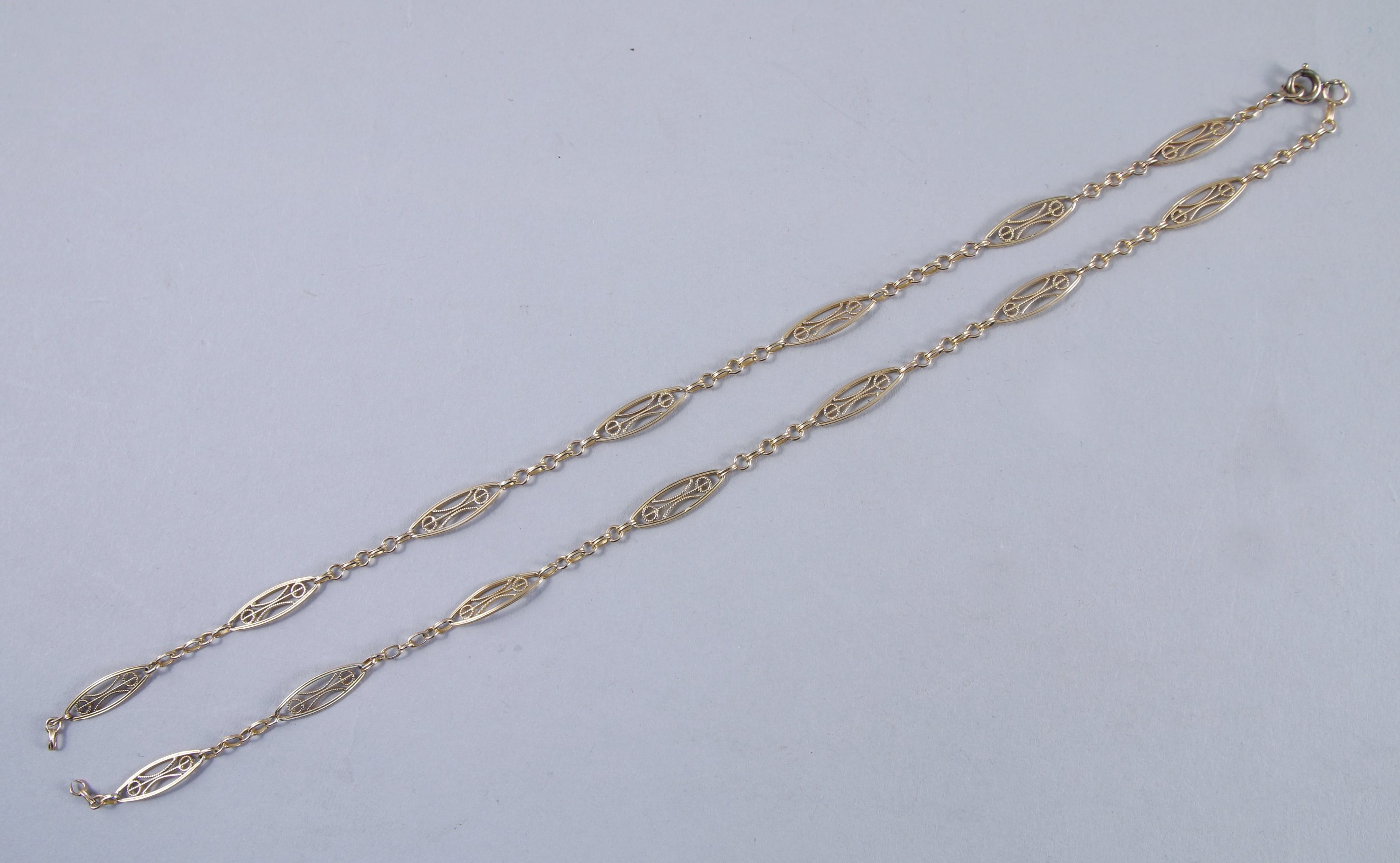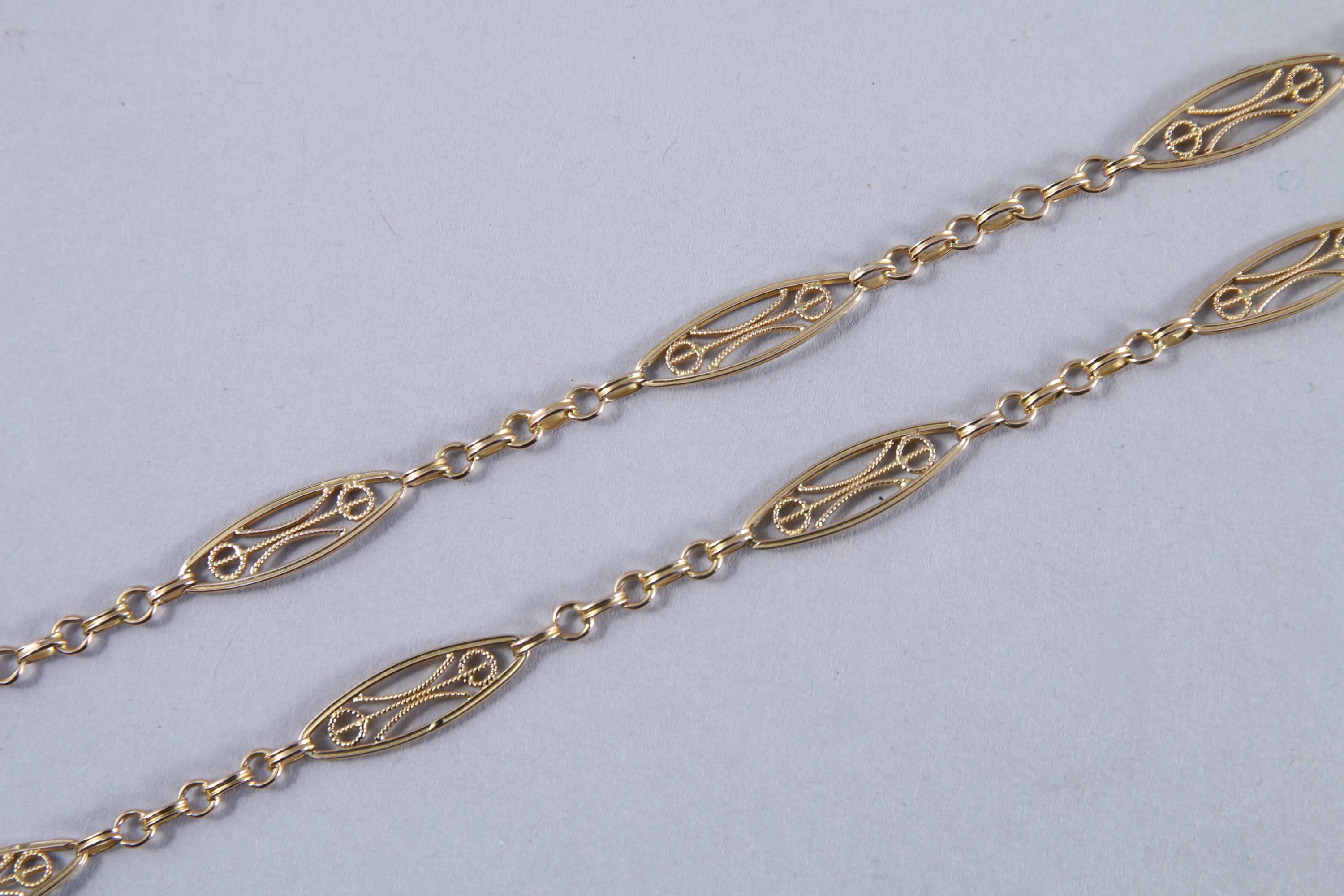 JOINT: CHAÎNE, maille jaseron agrémentée de motifs ajourés. Long. 46 cm. Poids: 6,7 g.