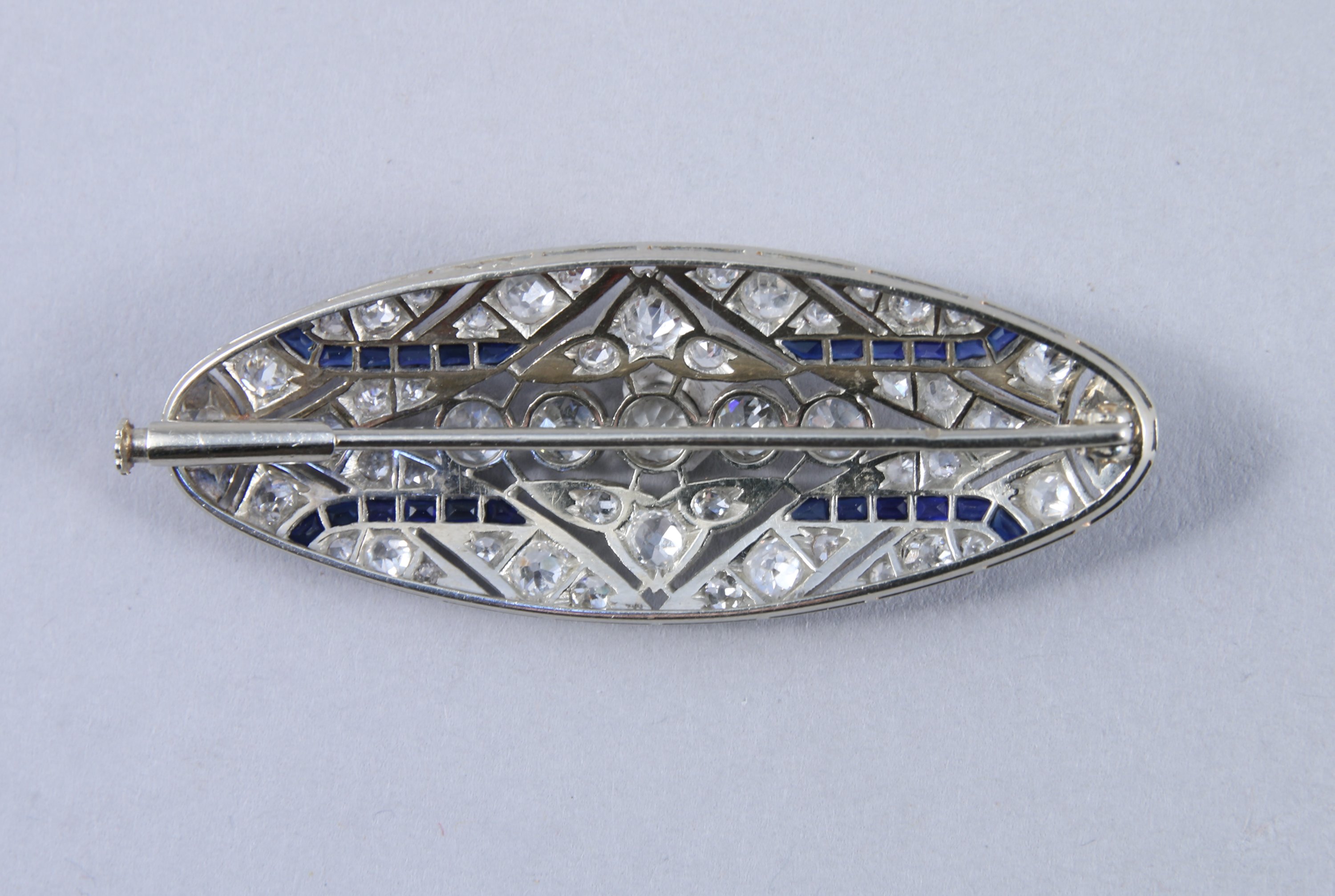 BROCHE de forme navette en or gris 750 millièmes et platine. Elle est ajourée de motifs géométriques dont un losange au centre et pavée de 76 DIAMANTS dont cinq plus importants (0,15 carat environ) et de SAPHIRS calibrés.