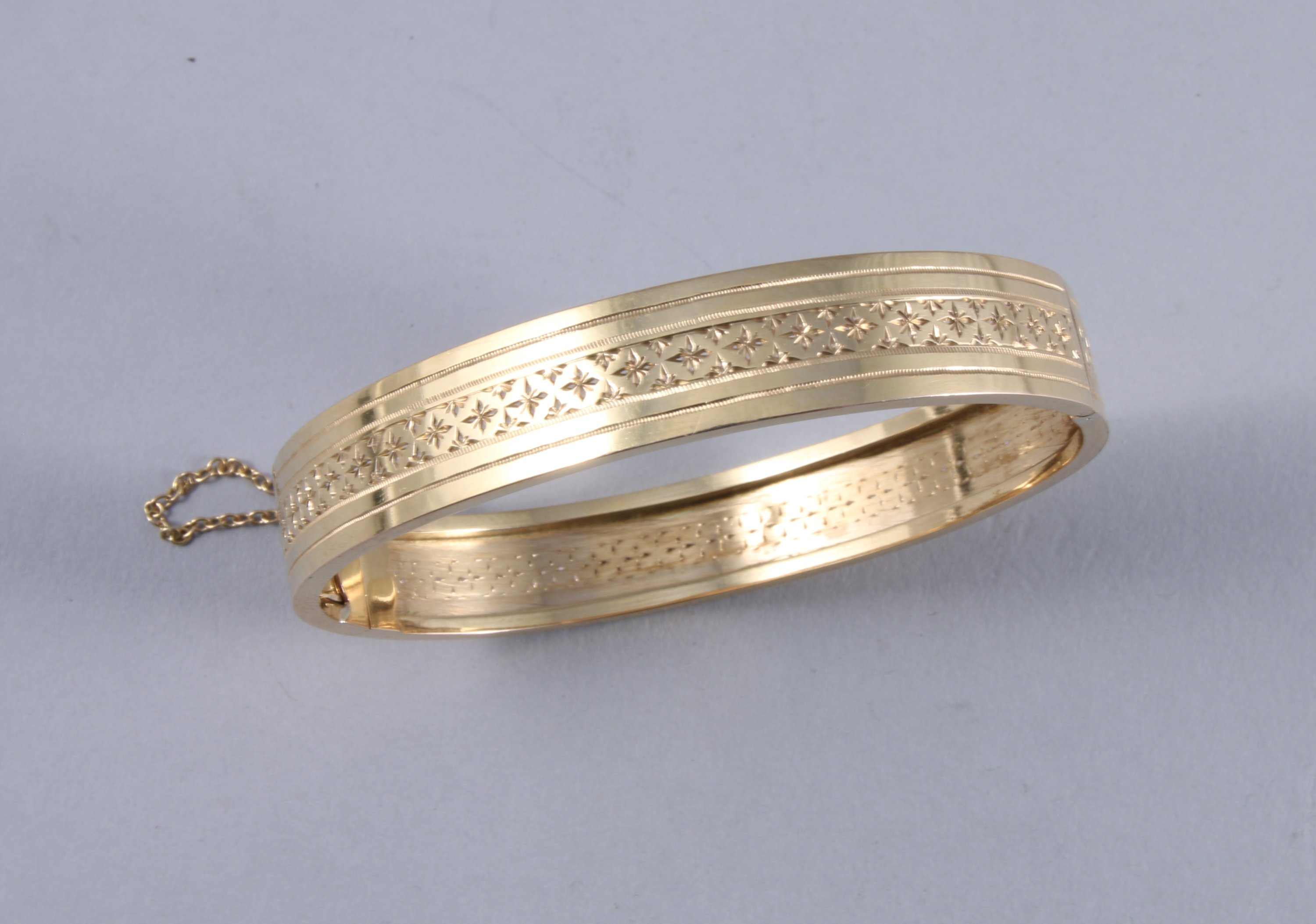 BRACELET rigide en or jaune 750 millièmes à décor d'une frise de fleurons. Il ouvre par une charnière. Écrin.