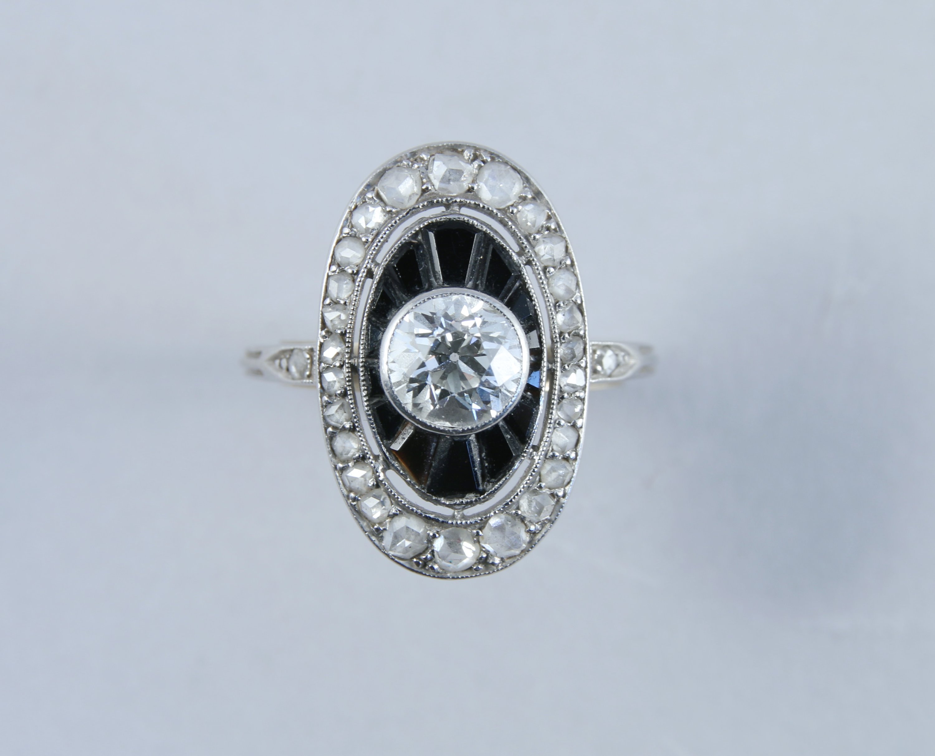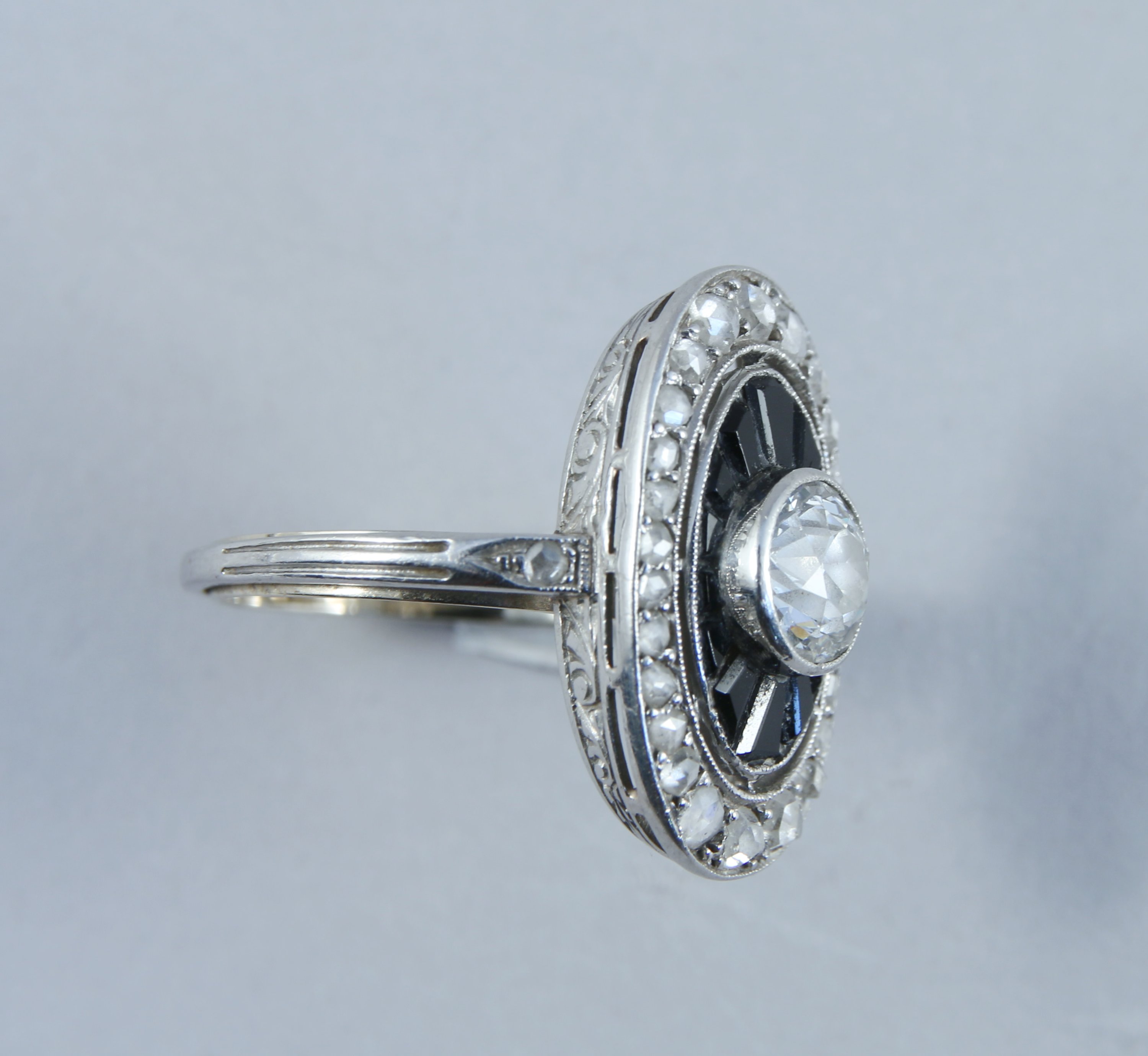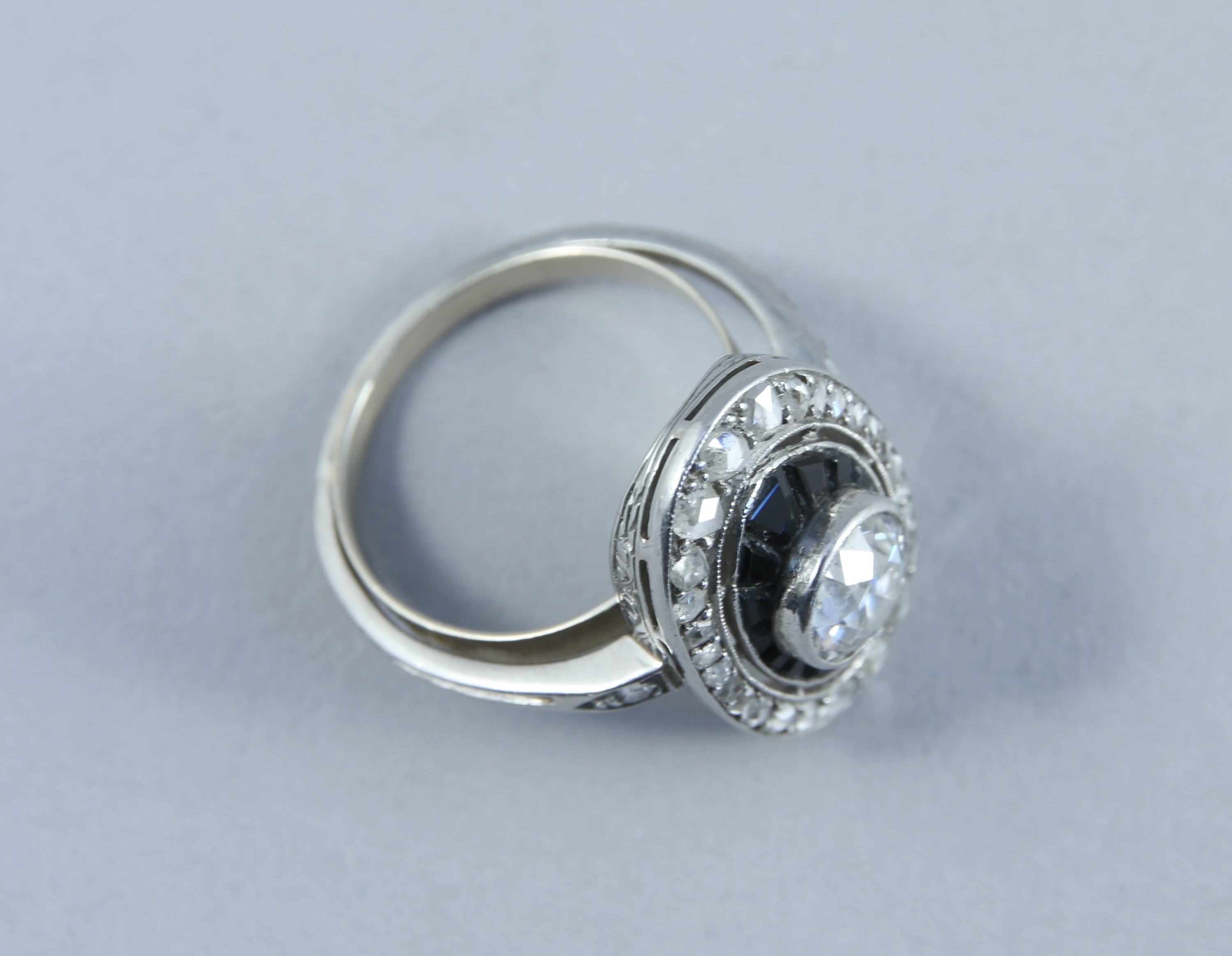 BAGUE en platine 950 millièmes ornée d'un DIAMANT d'environ un carat dans un entourage rayonnant de plaques de saphirs (?) et d'une ronde de diamants.