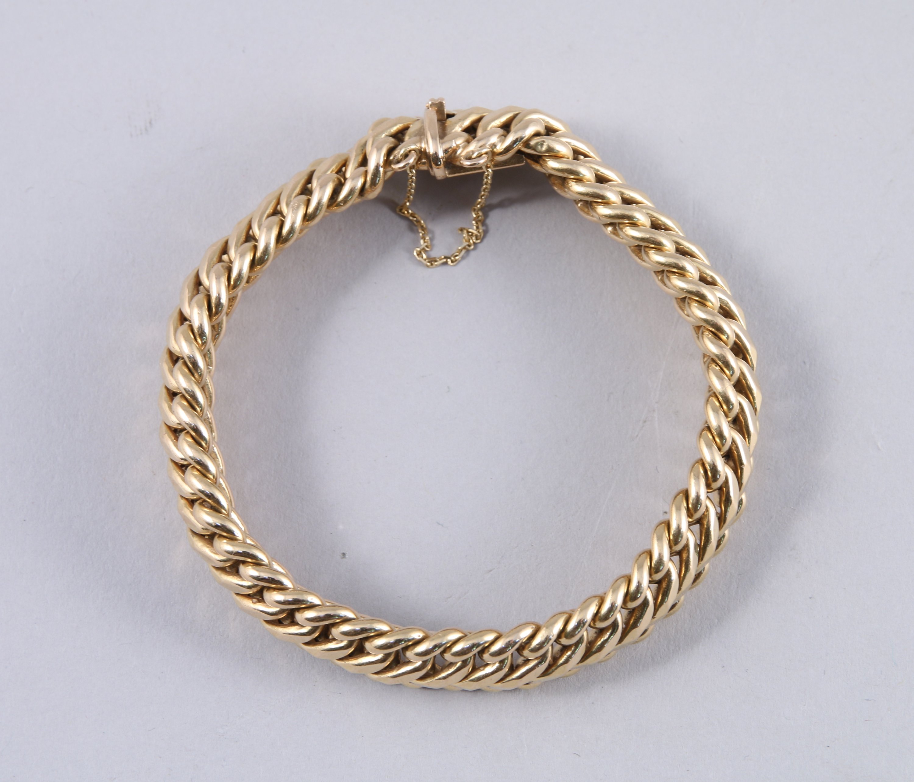 BRACELET en or jaune 750 millièmes à mailles souples, avec sa chaînette de sécurité.