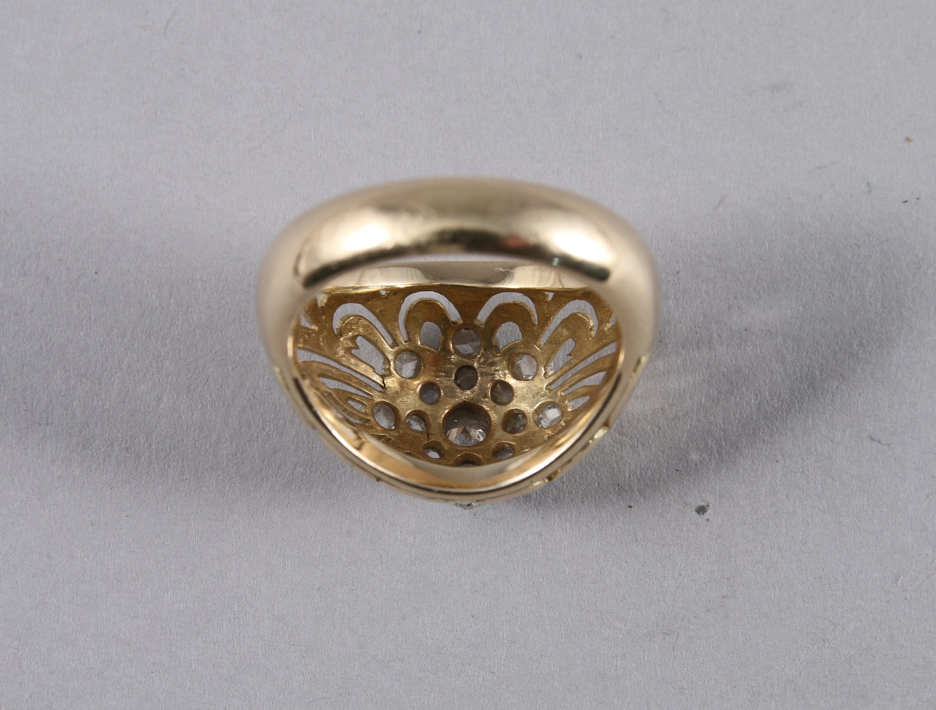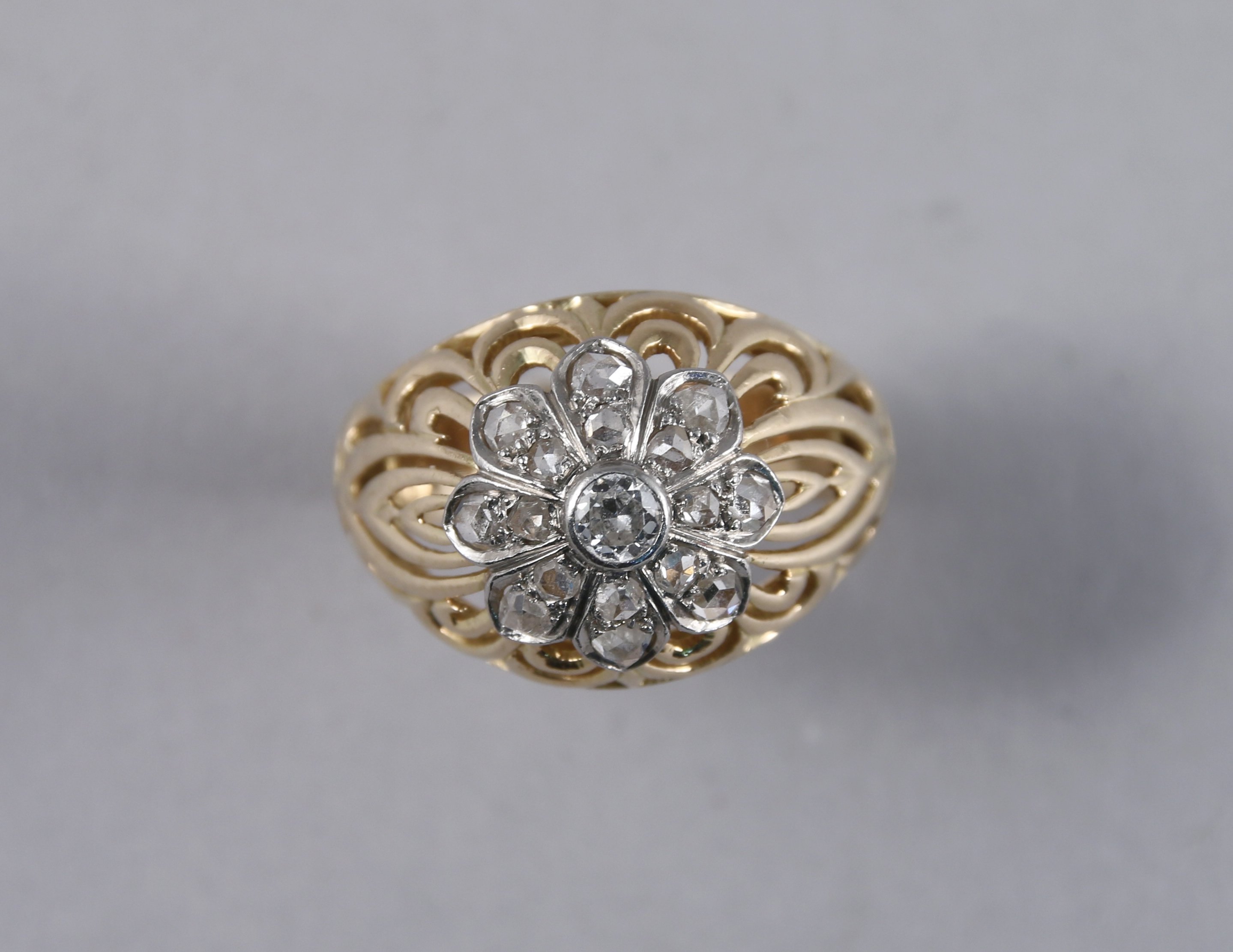 BAGUE DÔME en or jaune 750 millièmes ornée au sommet d'une fleur en platine (?) pavée de brillants dans un entourage ajouré de volutes et motifs lancéolés.