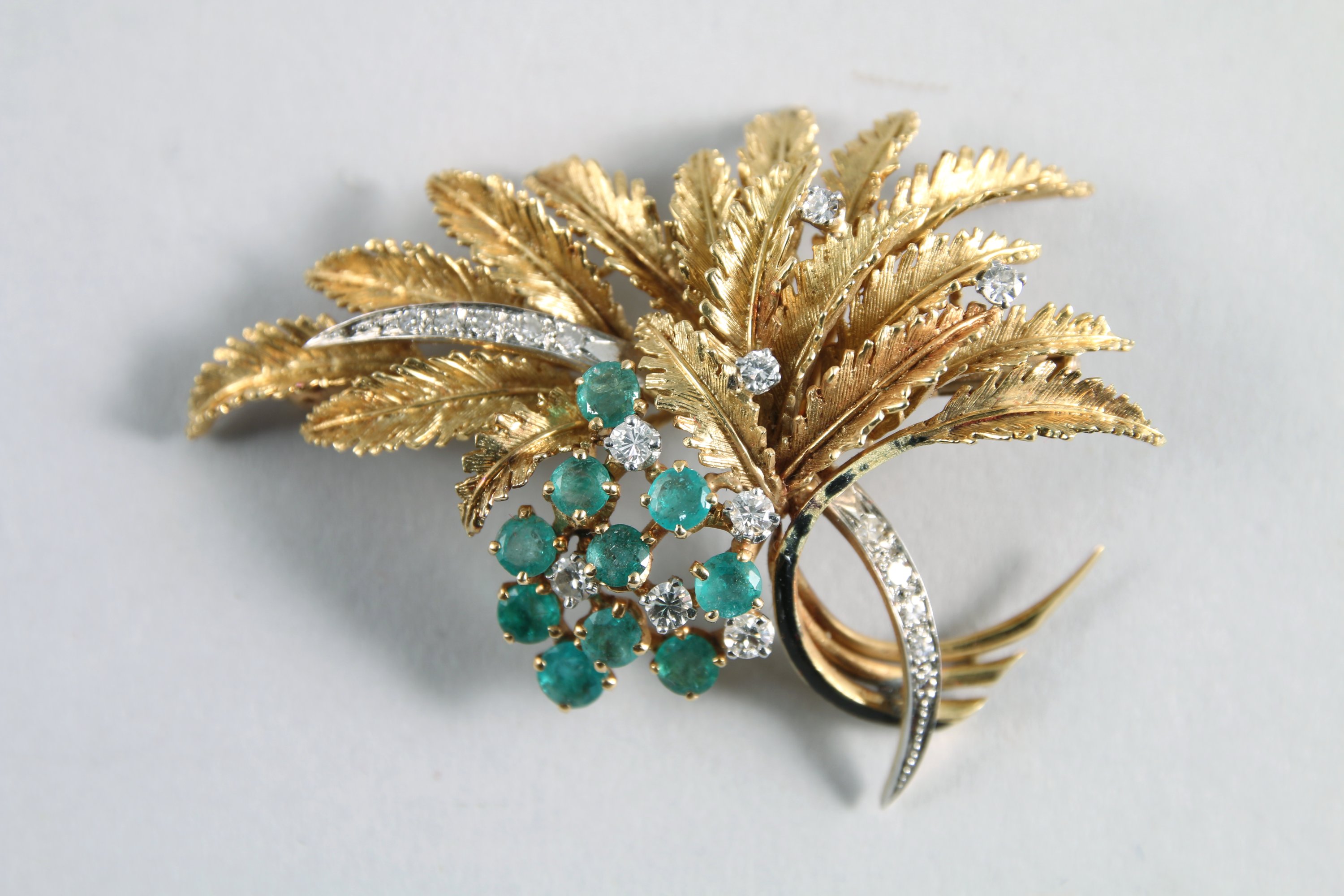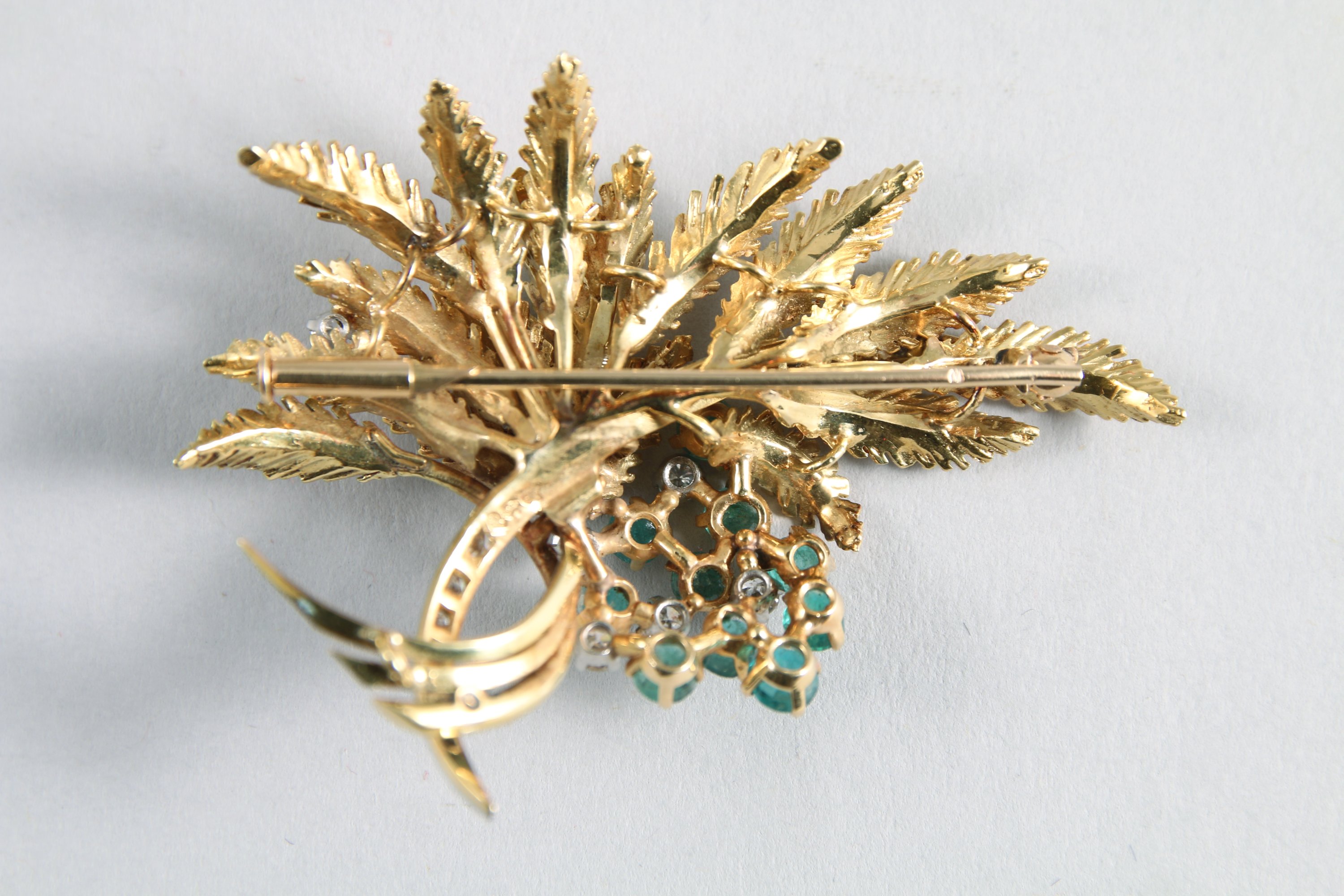 BROCHE FEUILLE en or jaune 750 millièmes pavée de brillants, émaillée noir (manques) et ornée de 8 brillants dont 2 DIAMANTS et de 10 pierres vertes (ÉMERAUDES?).