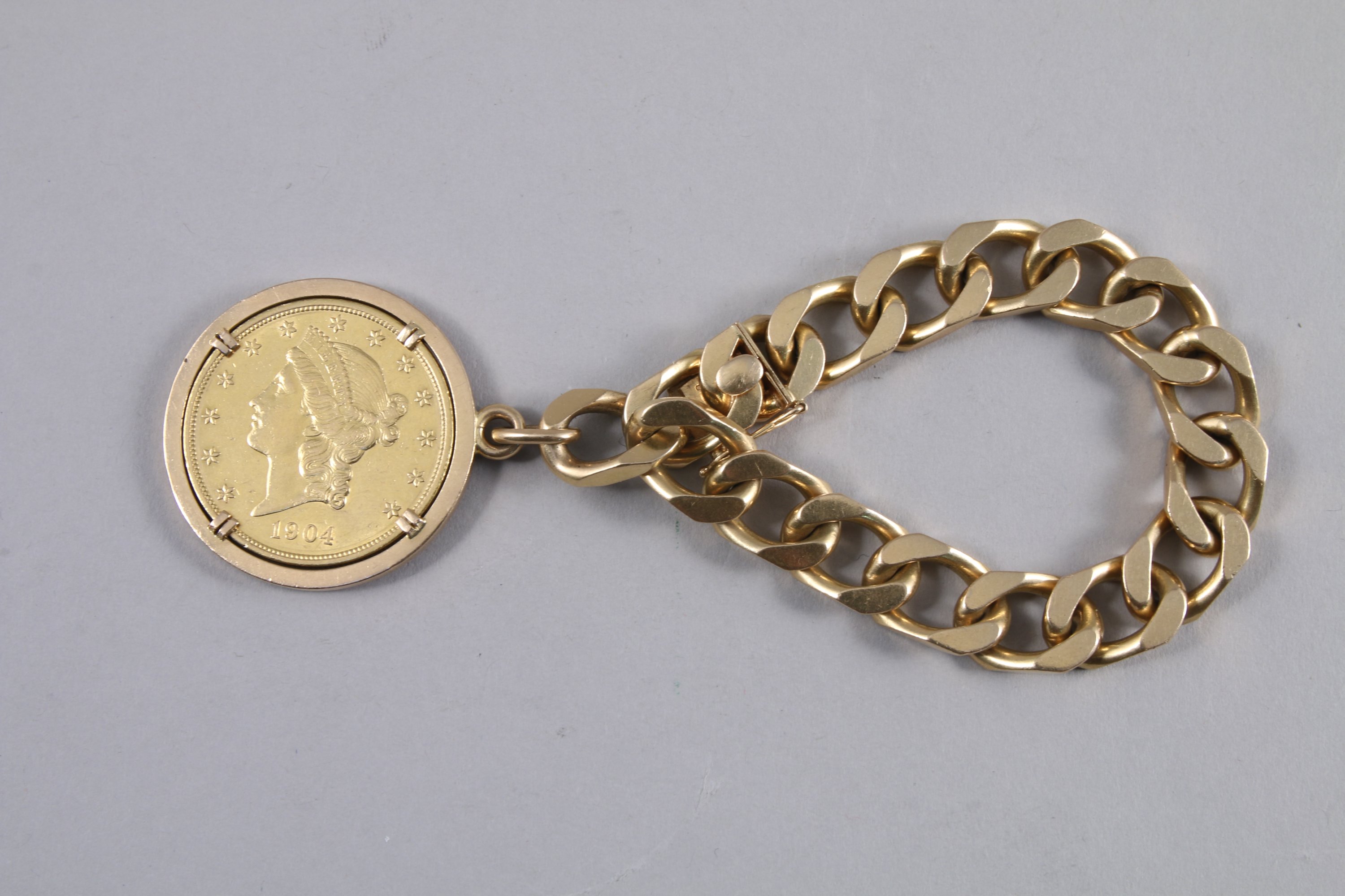 BRACELET en or jaune 750 millièmes à maille forçat retenant et une PIÈCE de 20 DOLLARS or type Liberty (1904) sertie dans un anneau en or 18K.