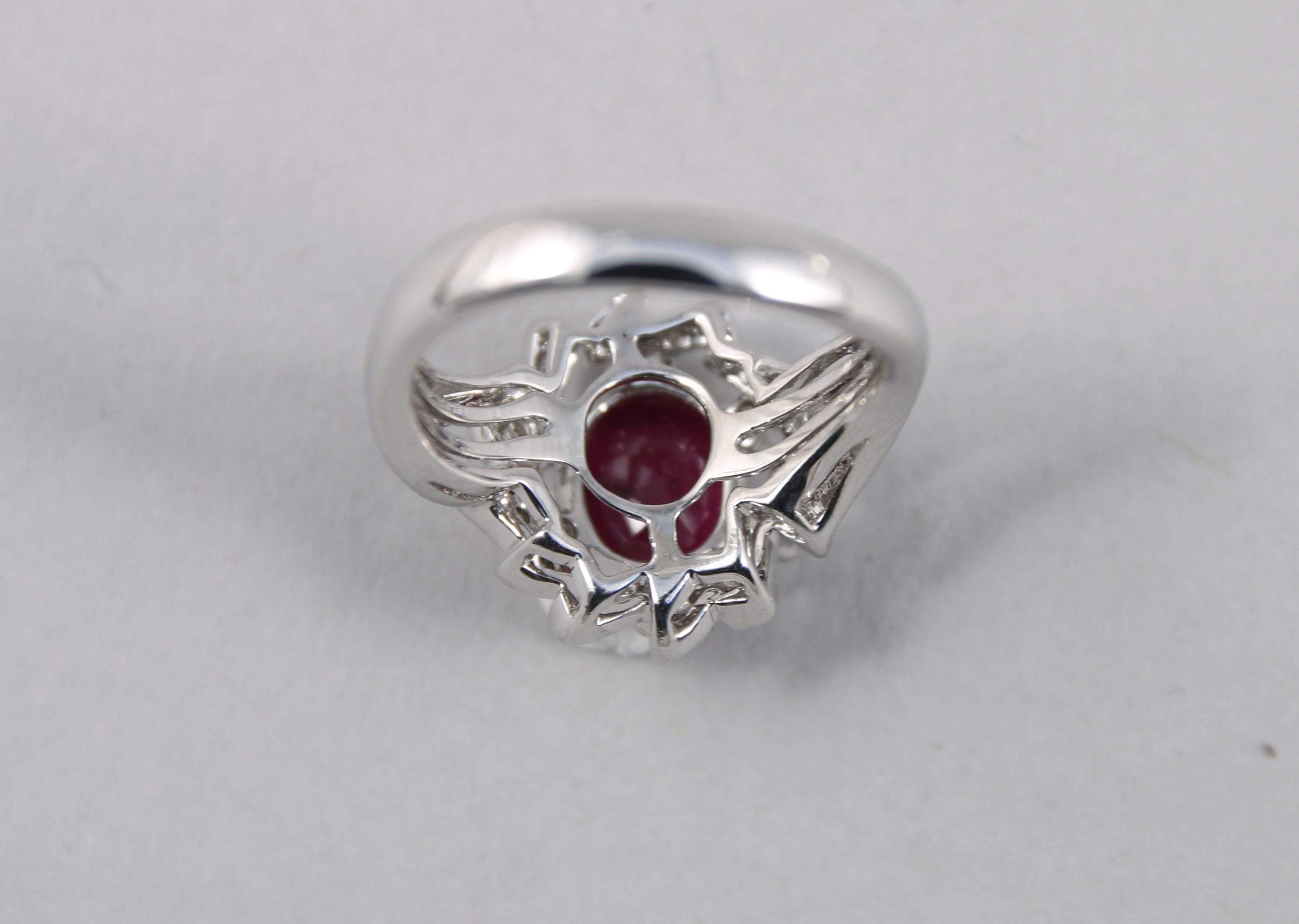 BAGUE en or blanc 750 millièmes ornée d'un RUBIS taille ovale de 2,32 carats dans un entourage rayonnant pavé de 30 DIAMANTS taille moderne.