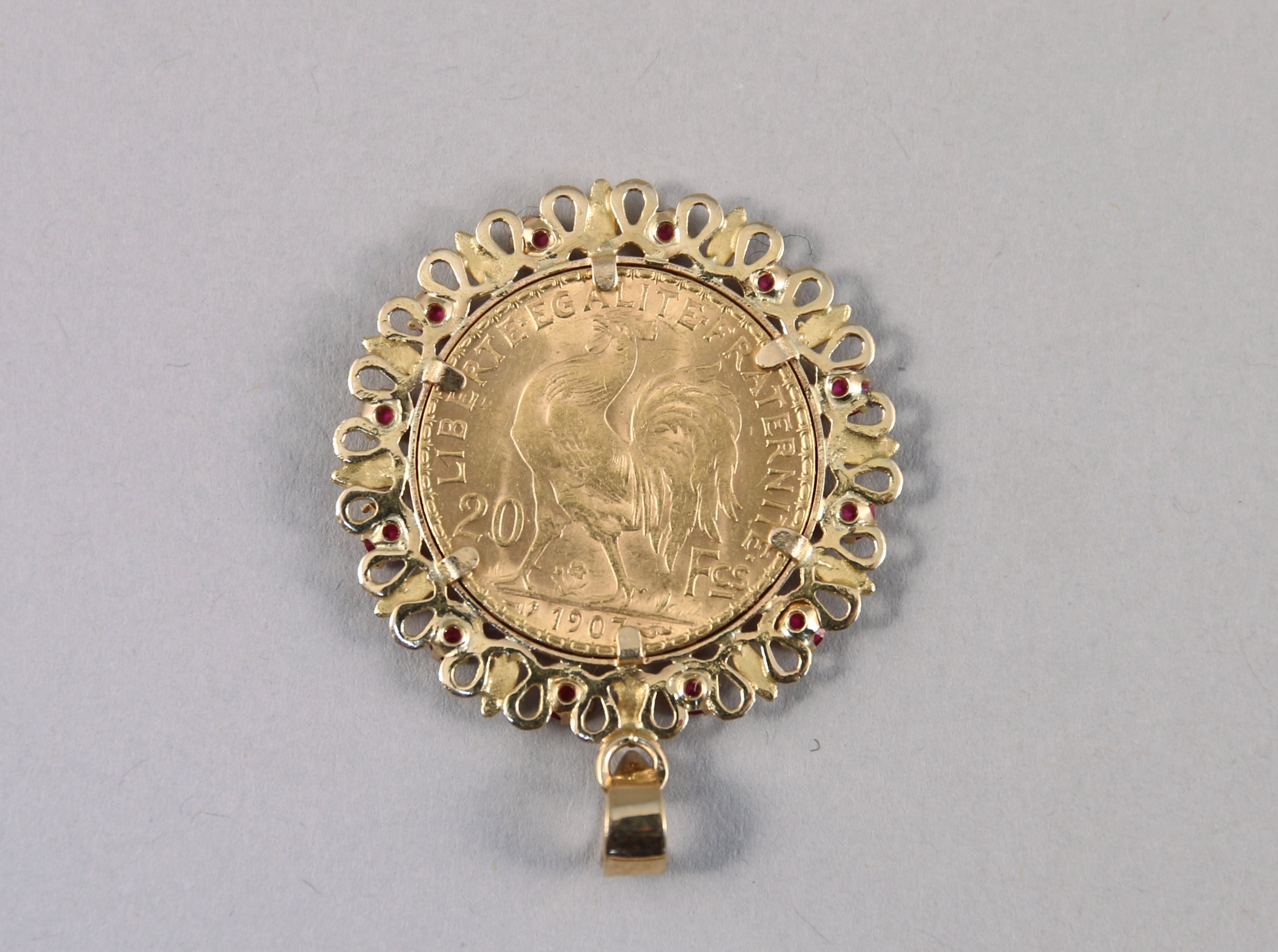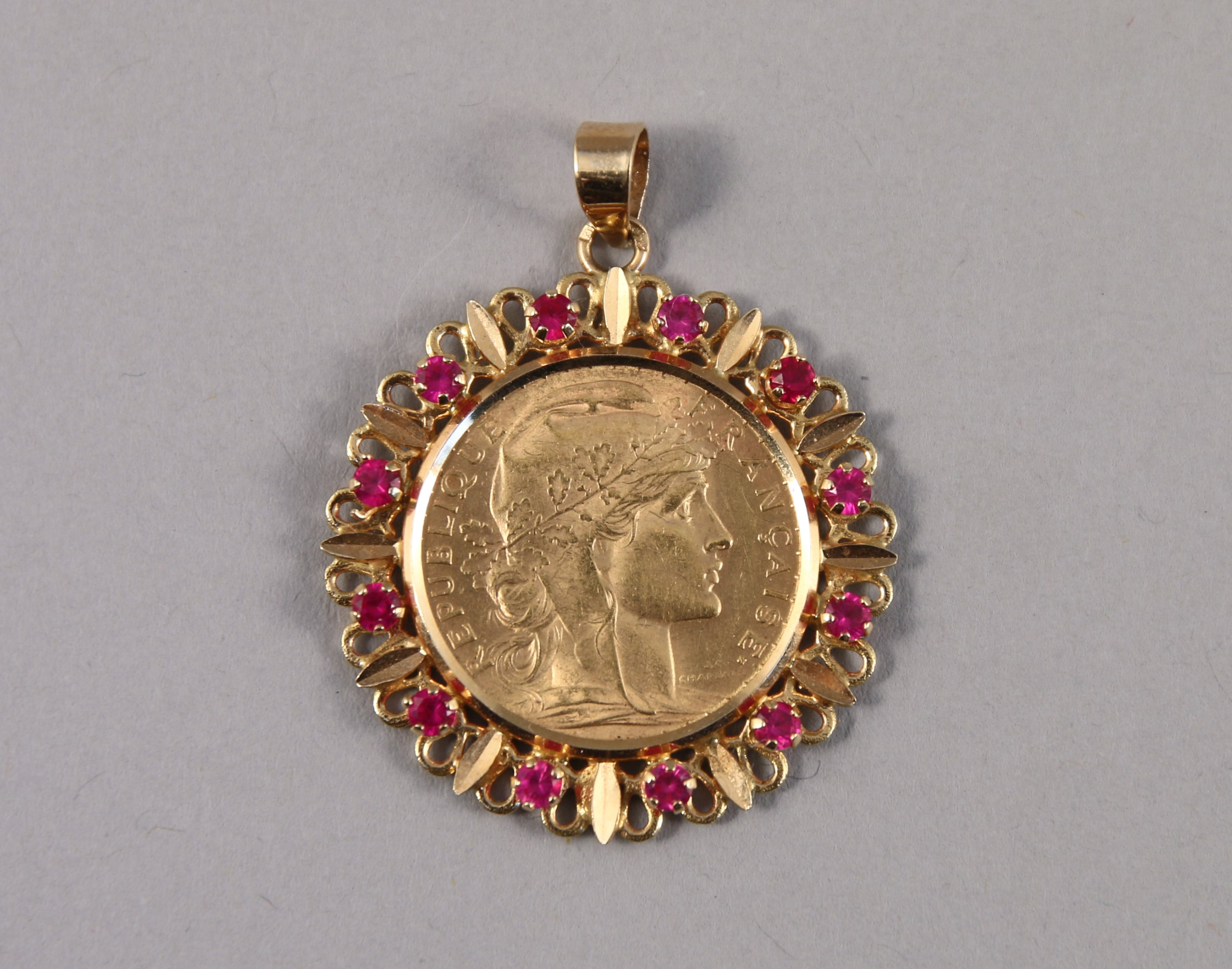 PENDENTIF sertissant une pièce de 20 F or, coq, 1907. Monture en or jaune 750 millièmes à décor ajouré de noeuds et motifs lancéolés agrémentée de petites pierres de synthèse rouge.
