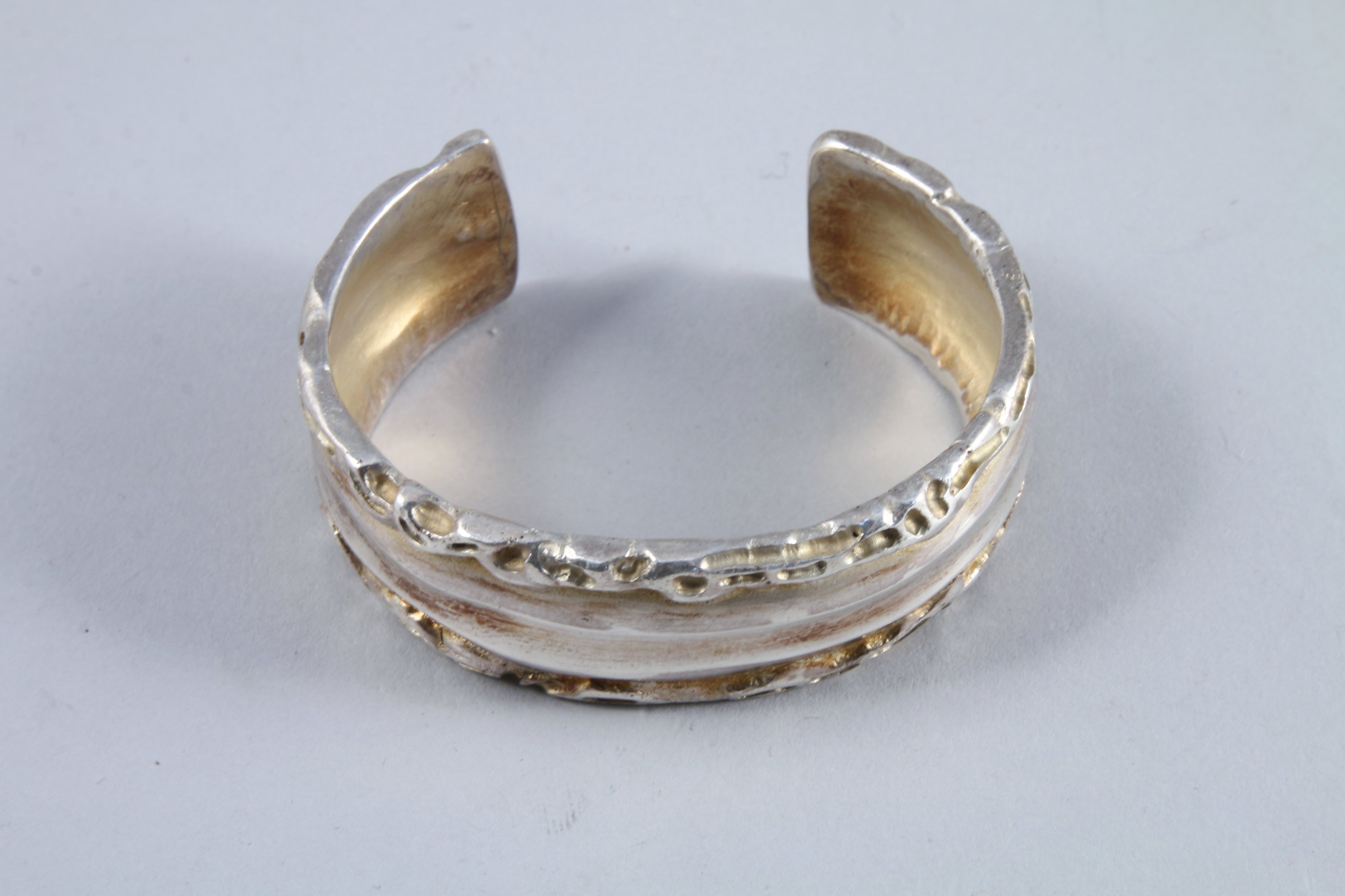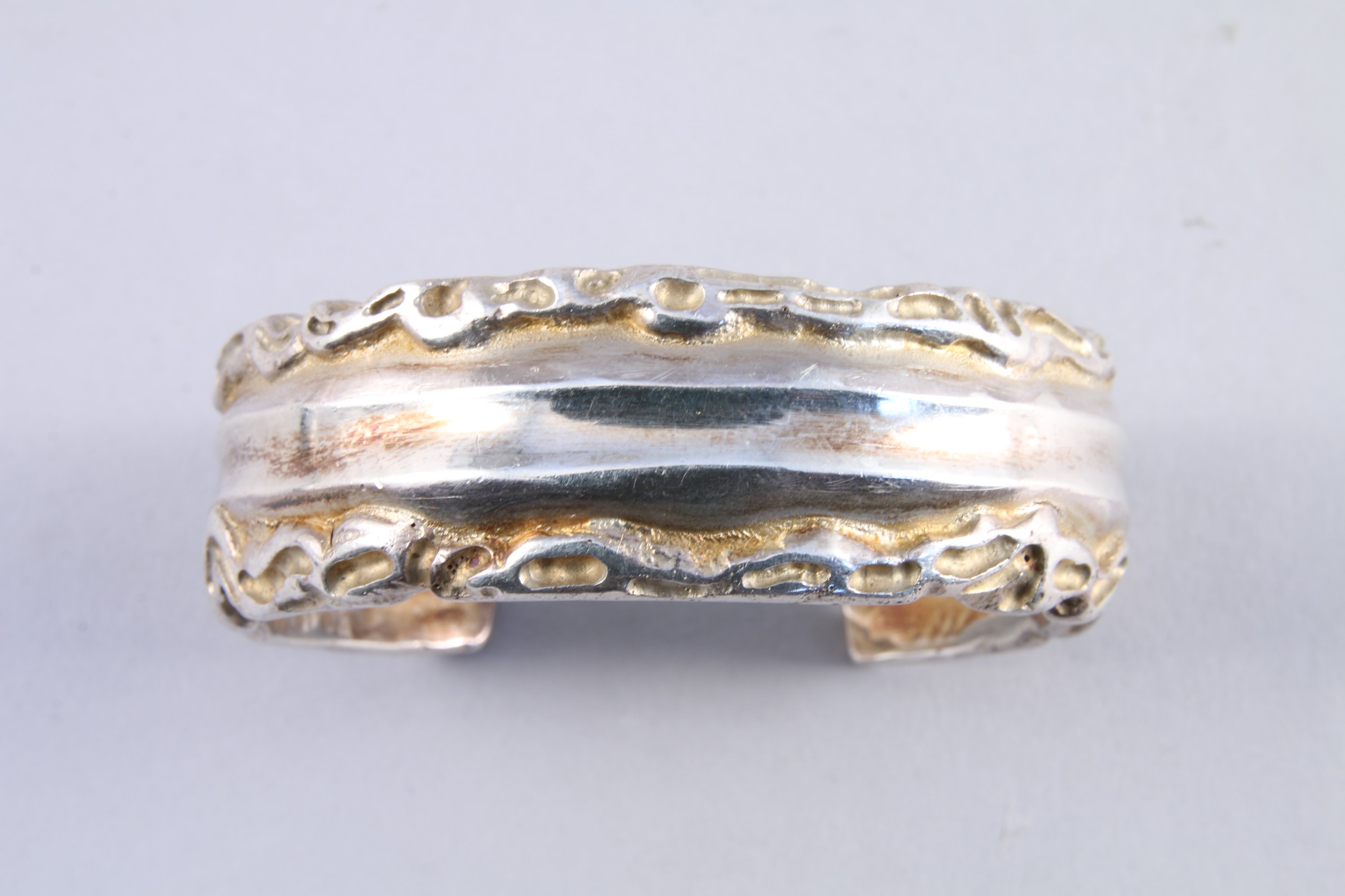 BRACELET rigide en argent et vermeil. Il est orné d'une cannelure centrale et de motifs vermiculés sur les bords. Larg. 2 cm. Poids: 66 g.