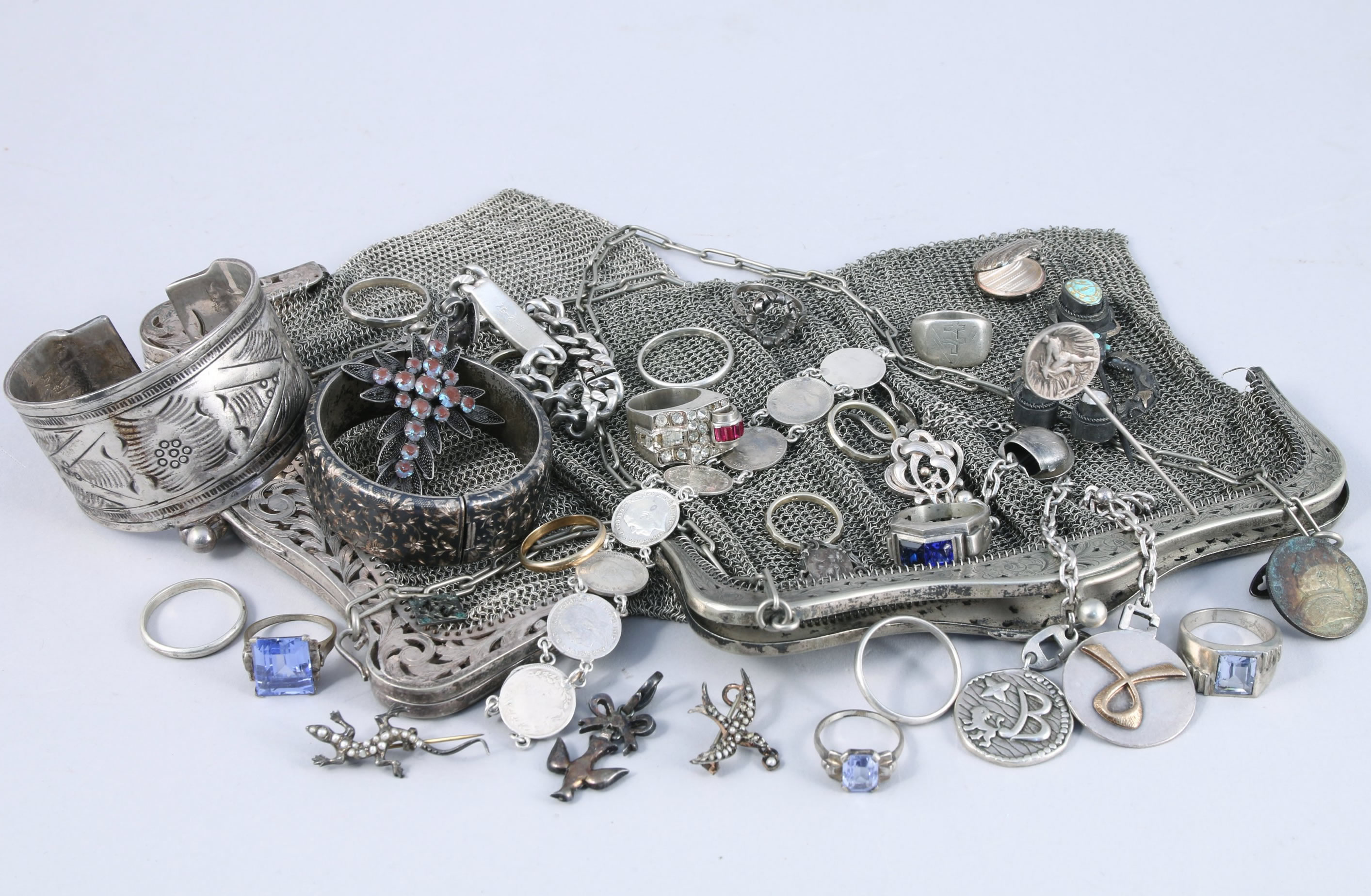 Réunion de BIJOUX en argent comprenant notamment six bagues dont une tank et une gravée d'une croix de Lorraine et du "V" de la victoire, deux sacs cotte de maille, un bracelet rigide en argent niellé, une fibule, un bracelet constitué de neuf pièces de monnaie anglaises en argent, une épingle à cravate figurant un homme terrassant un aigle légendée "Le Poilu 1915", huit alliances, une gourmette...