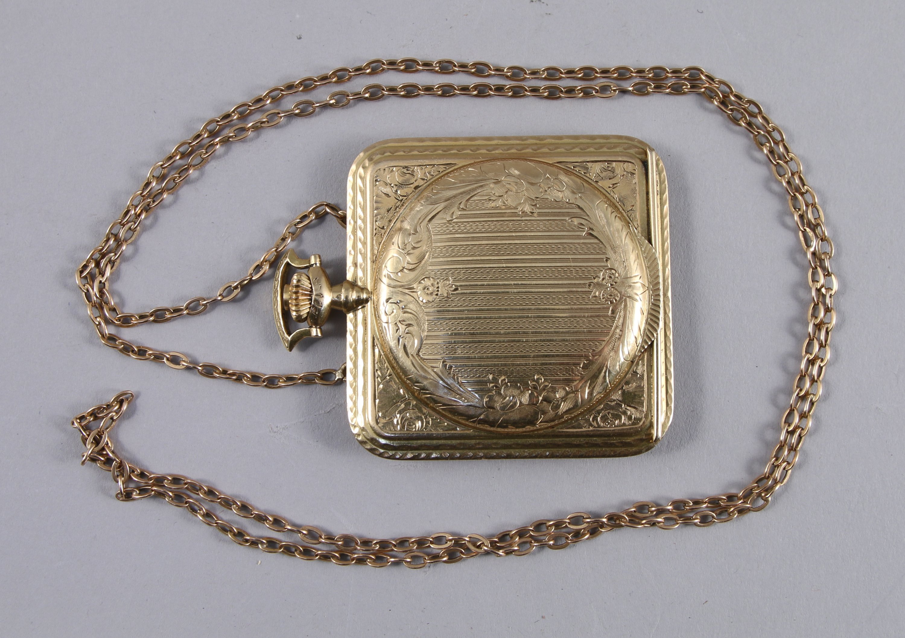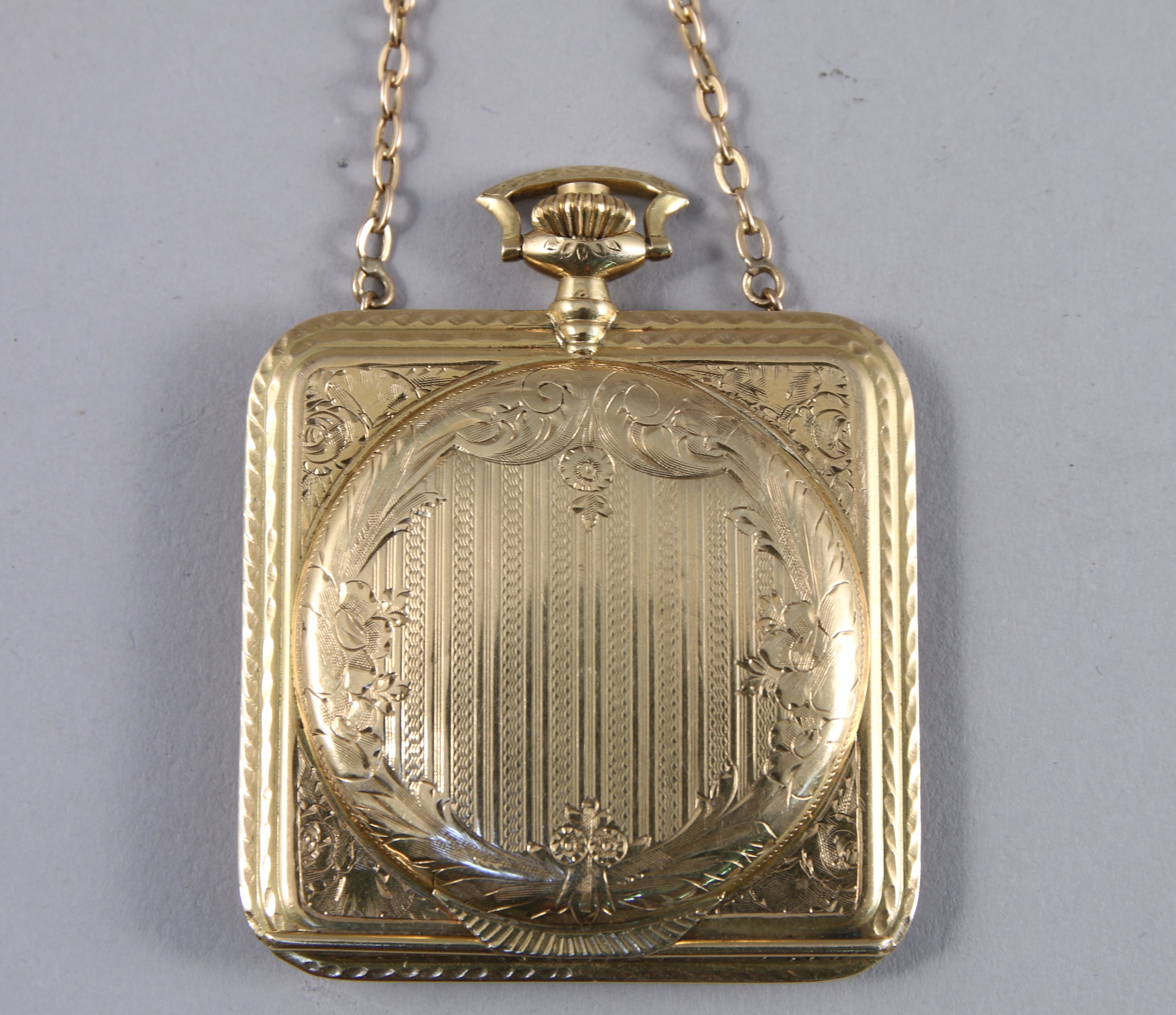 Rare MONTRE REMONTOIR en or guilloché et ciselé. Elle se présente dans un pendentif médaillon, de style Louis XVI, de forme carrée à coins arrondis - et retenu par une chaîne de cou.