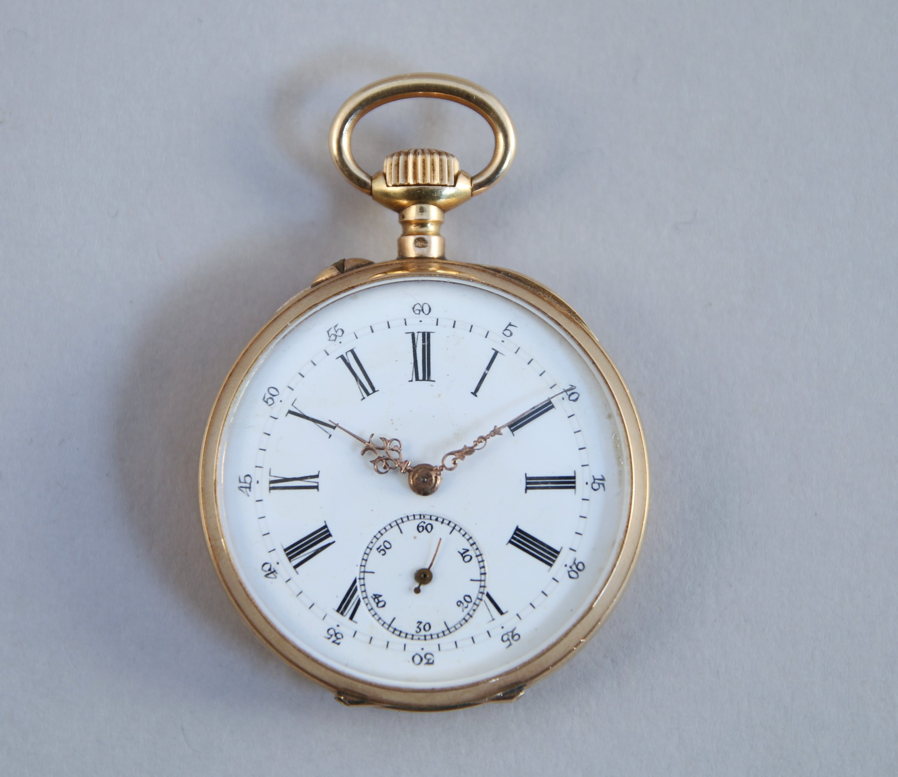 MONTRE DE GOUSSET à remontoir en or, cadran émaillé blanc présentant les heures en chiffres romains et les minutes en chiffres arabes autour d'un chemin de fer. Trotteuse à 6h.