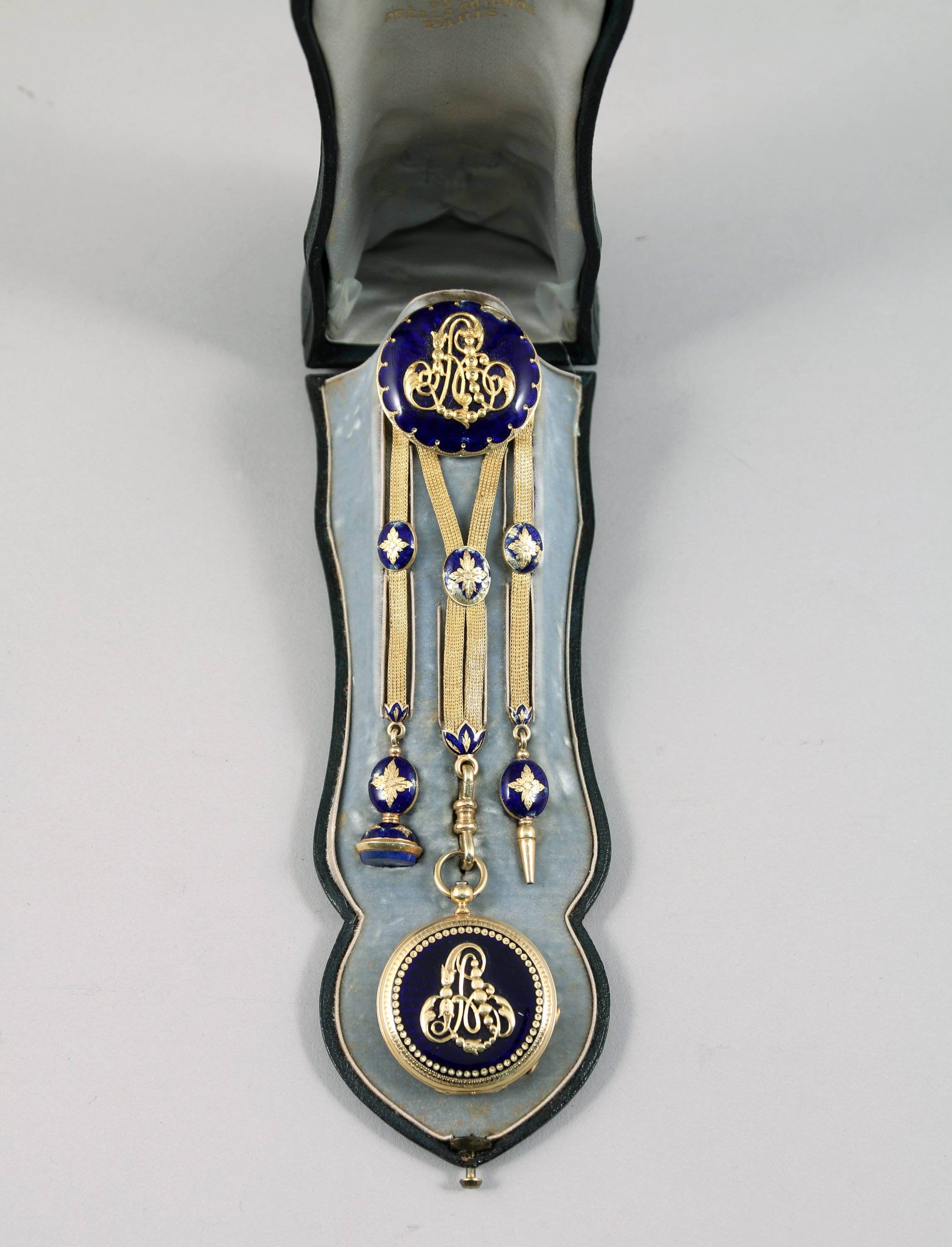 MONTRE et sa CHATELAINE en or jaune émaillé bleu nuit. Sceau en lapis lazuli. Boîtier en or, cadran émaillé blanc, les heures indexées en chiffres romains, les secondes par des bâtonnets.