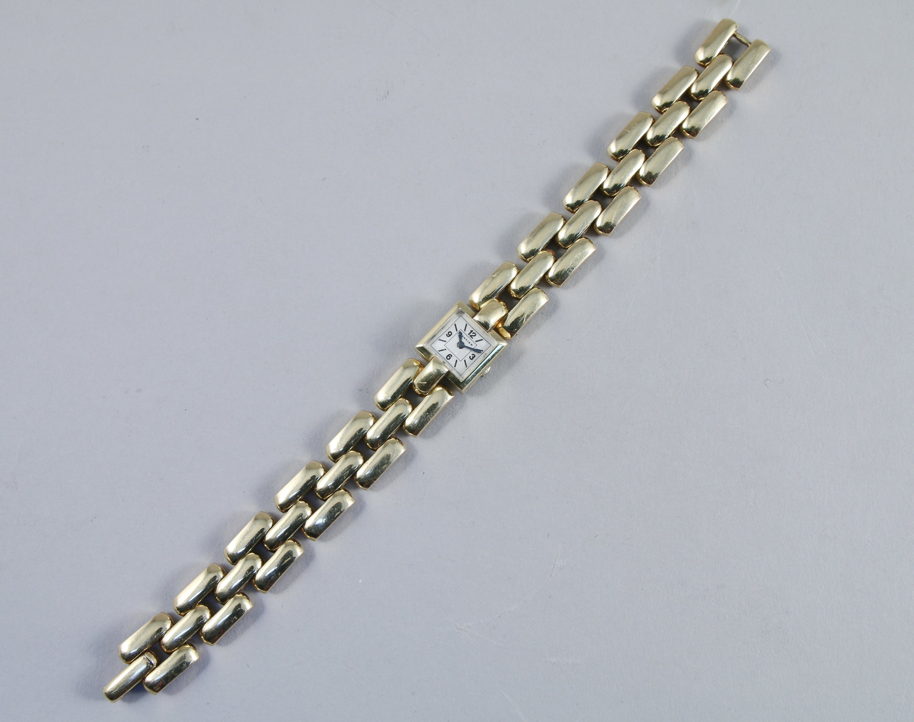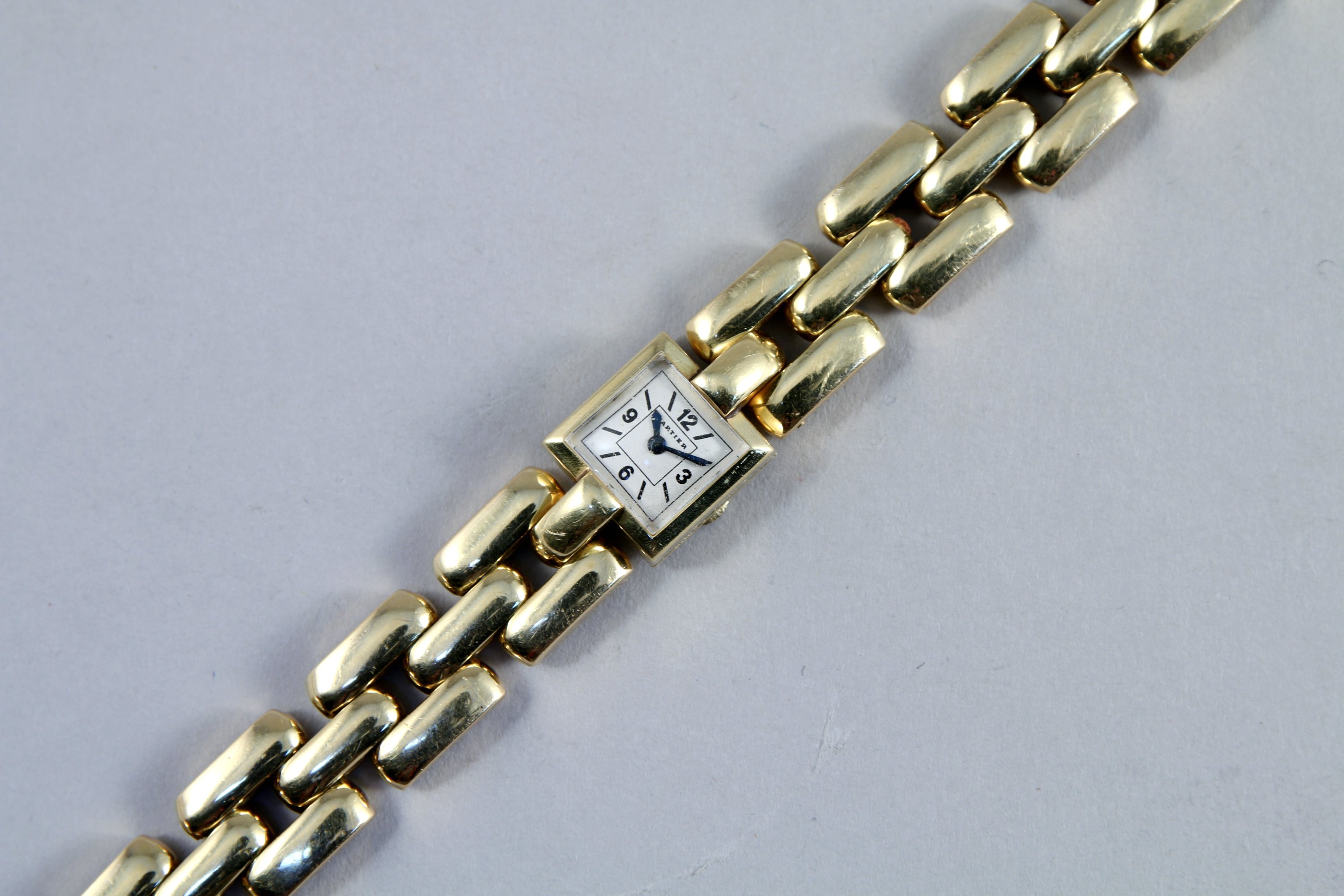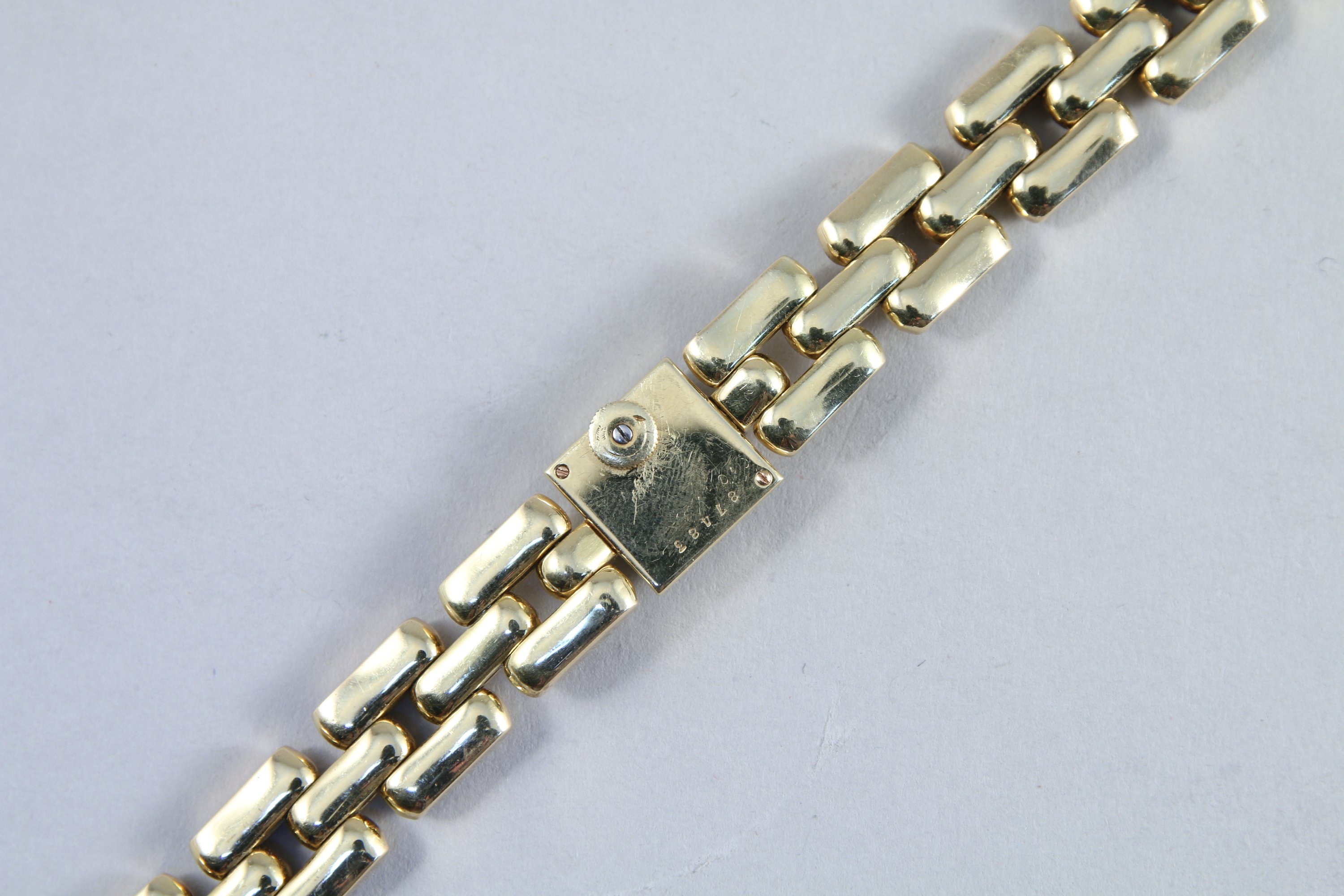 CARTIER. MONTRE de DAME et son BARCELET TANK en or jaune 750 millièmes. Le cadran carré signé est gradué avec en chiffres arabes "3, 6, 9 et 12" heures. Remontoir manuel sous le boitier en o, qui est numéroté "87483". Les douze maillons en or jaune du bracelet sont articulés.