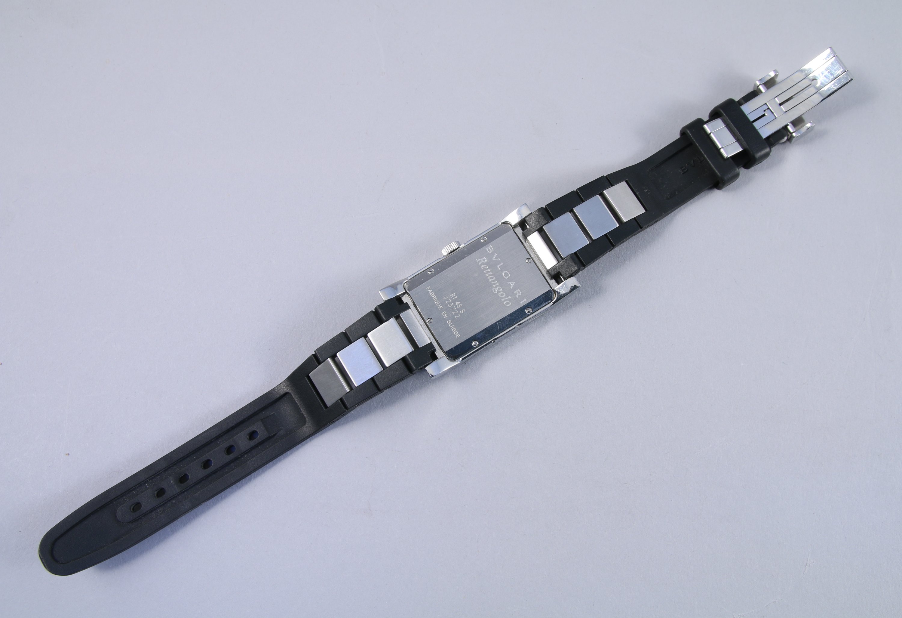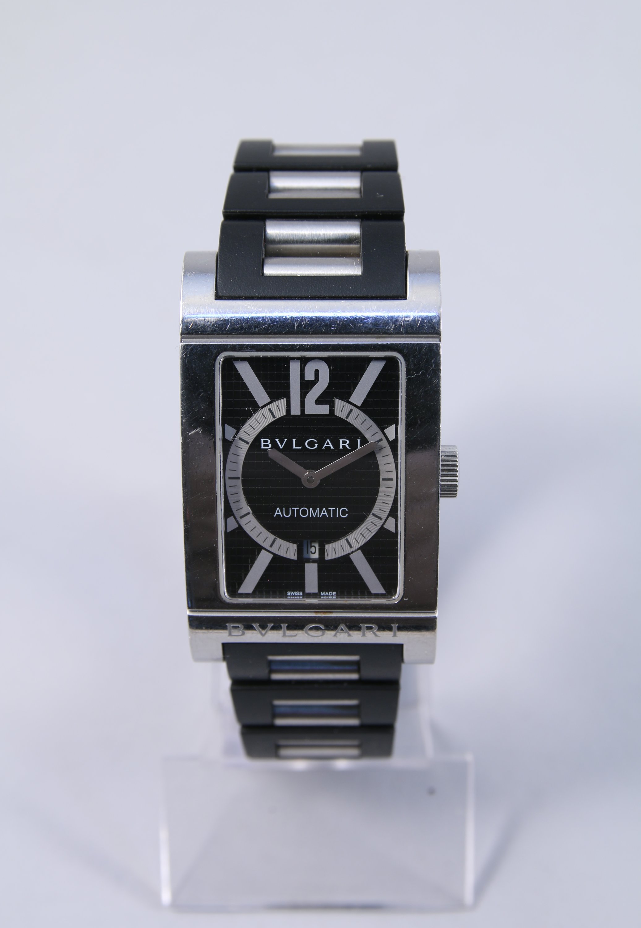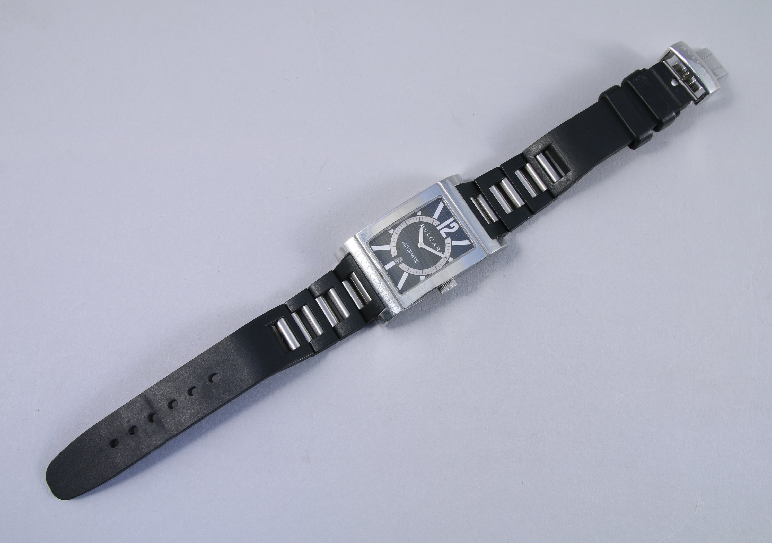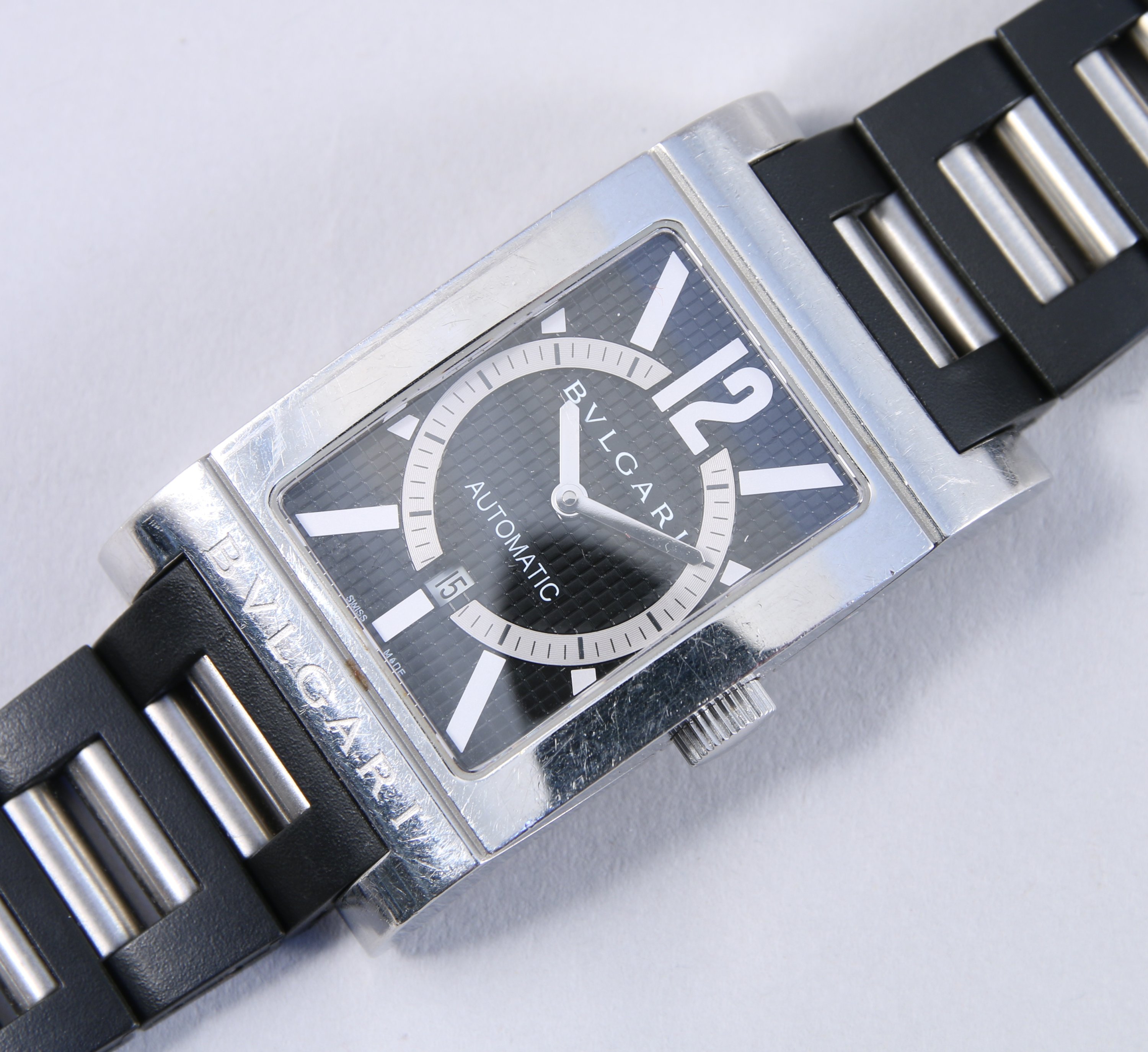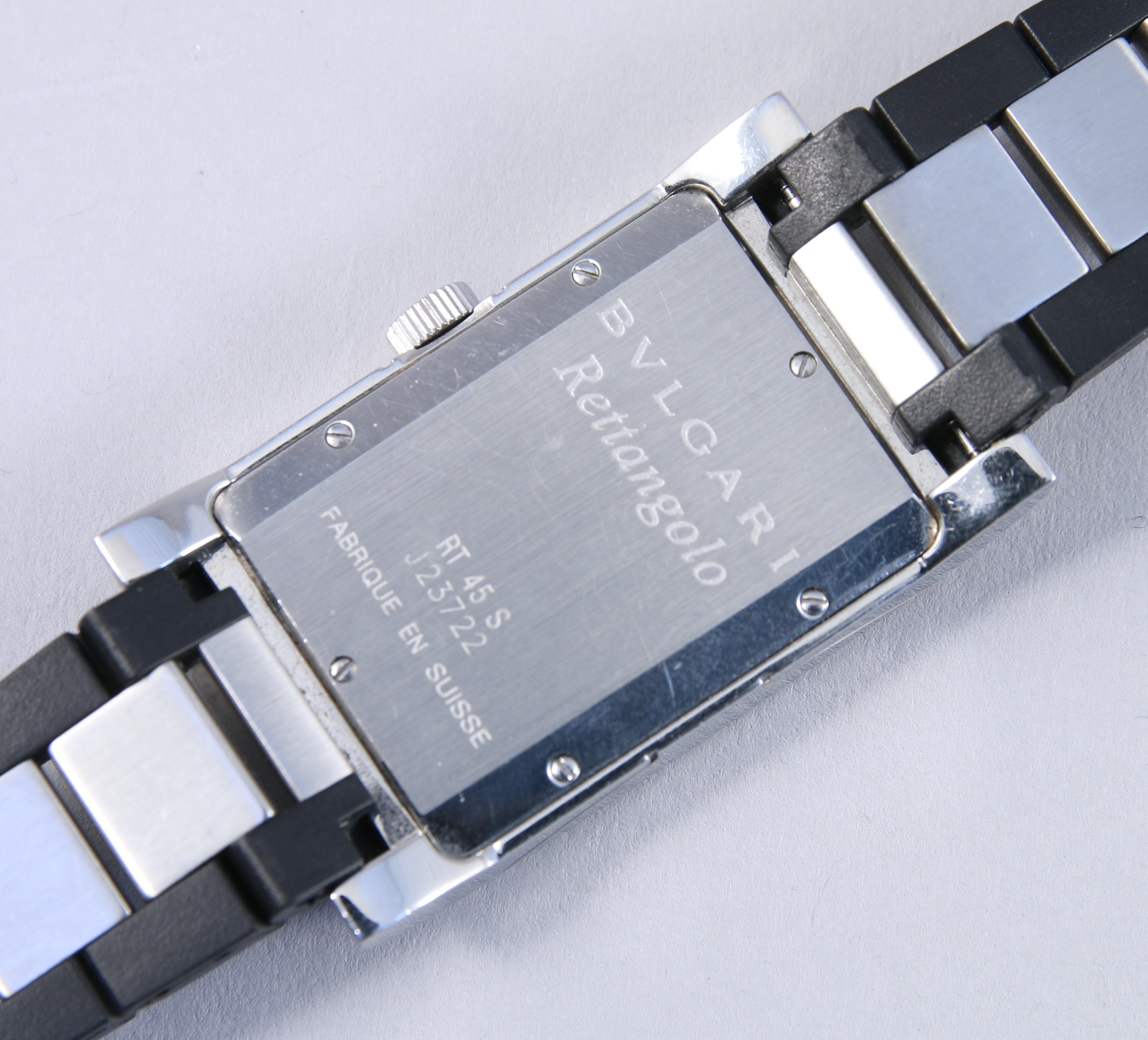 BULGARI. Montre RETTANGLO, modèle rt 45 s, le boitier en acier, mouvement automatique. Diam. 26 mm. Bracelet articulé en acier et plastique noir.