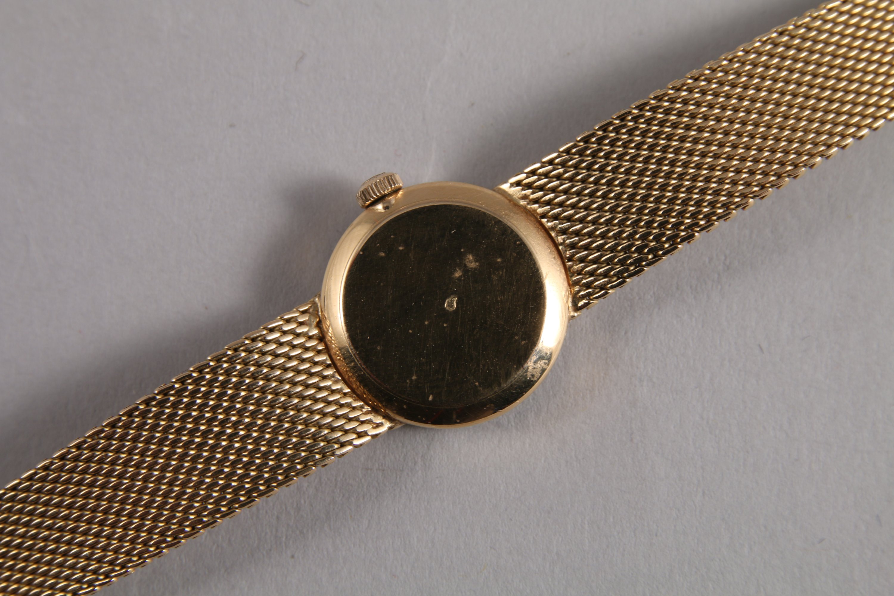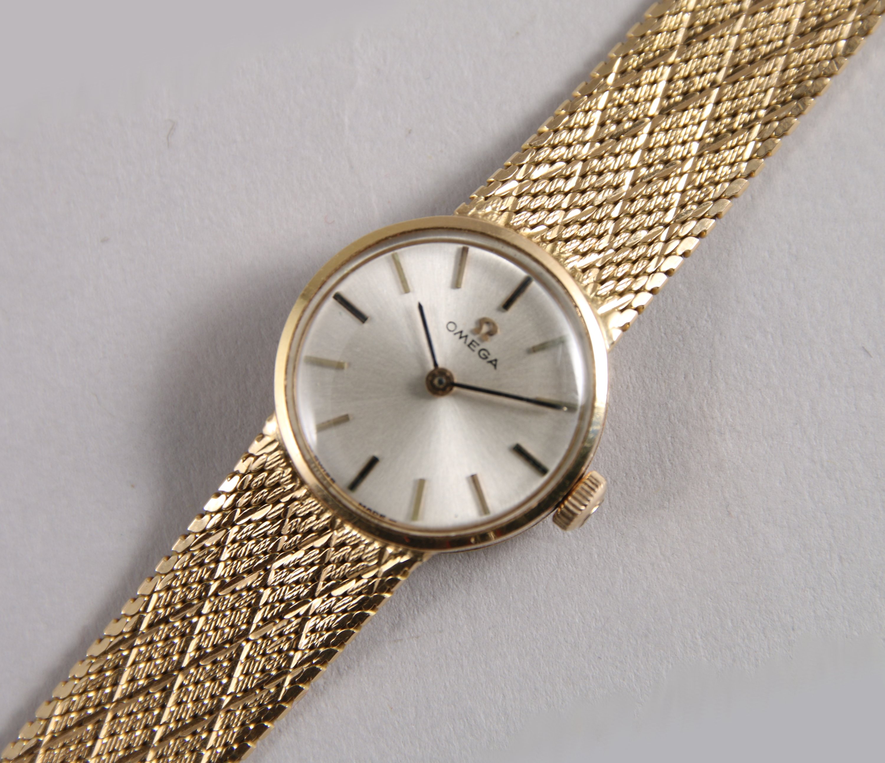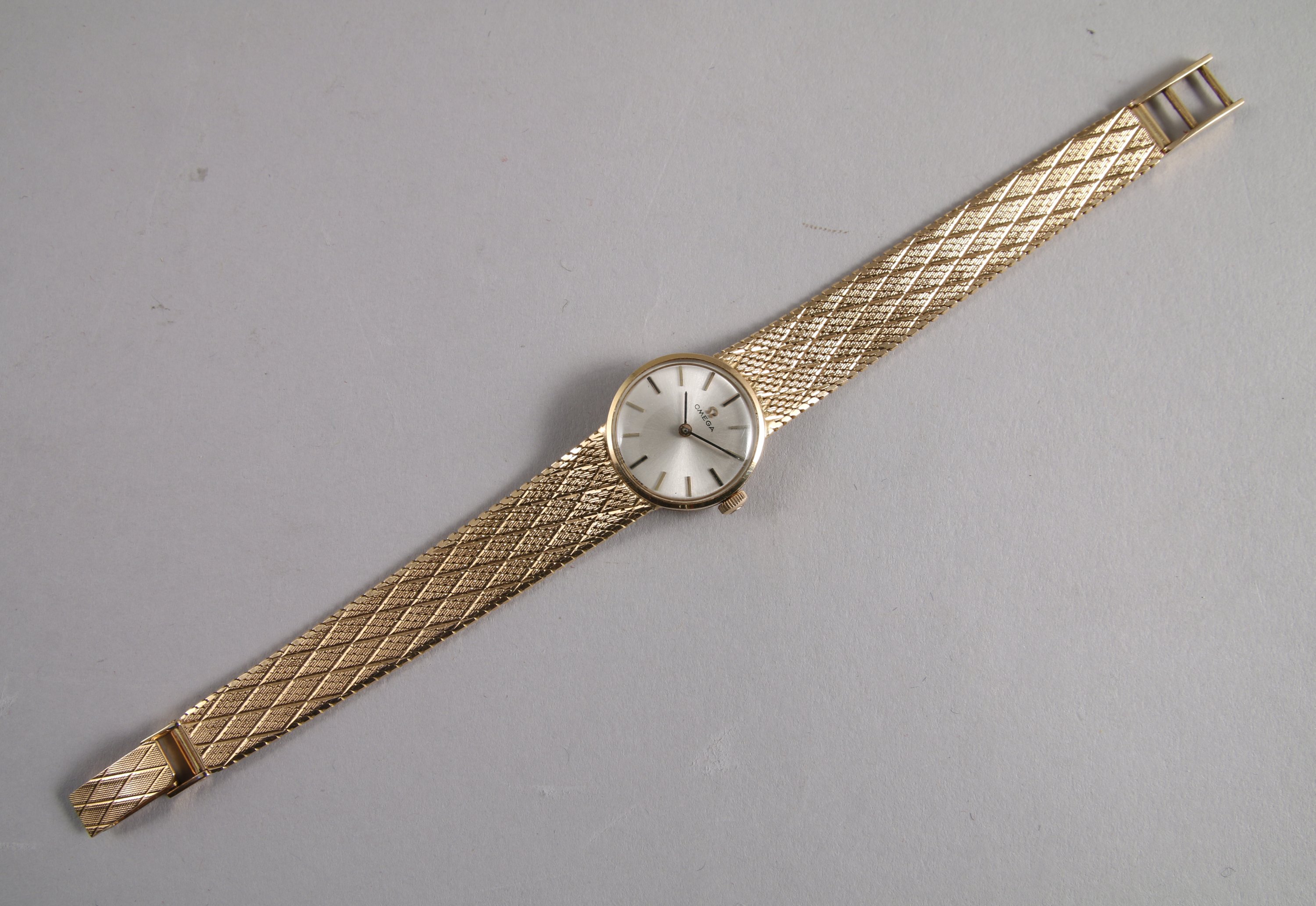 OMEGA. MONTRE de DAME en or jaune 750 millièmes à mouvement mécanique. le cadran argenté signé, gradué pour le sheures avec le remontoir à trois heures. BRACELET tressé en or jaune 750 millièmes.